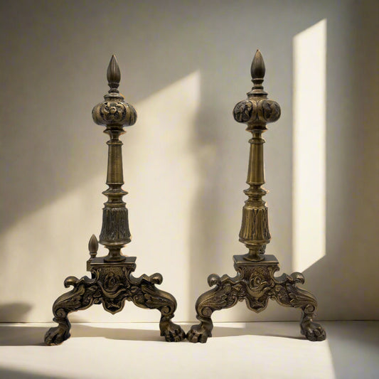 Pair of Late Victorian-Era Brass & Iron Andirons, Rococo Revival Style