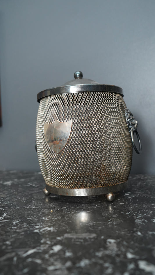 Antique English Silver-Plated Mesh Biscuit Barrel with Lion Mask Handles