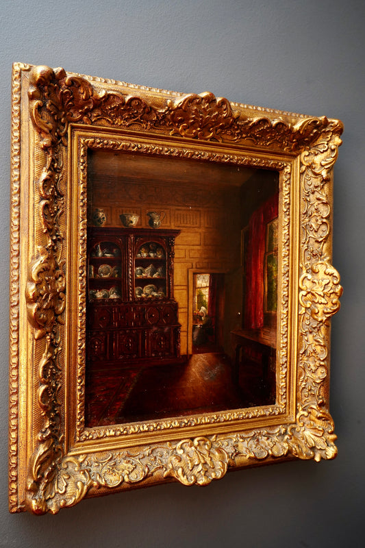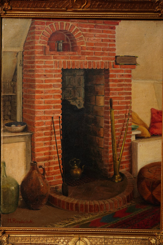 Dutch Interior Fireplace Oil Painting, Signed H. Rienderhoff, Gilt Framed