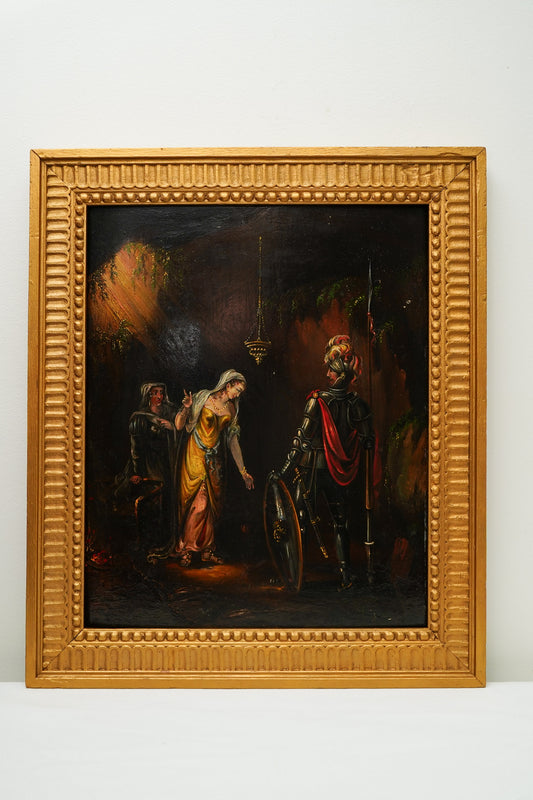 Antique Troubadour Style Chivalric Scene Oil Painting on Wood Panel in Gilt Frame,