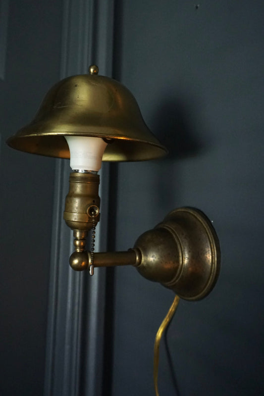 Early 20th-Century Solid Brass Wall Sconce with Bell Shade and Pull-Chain Switch