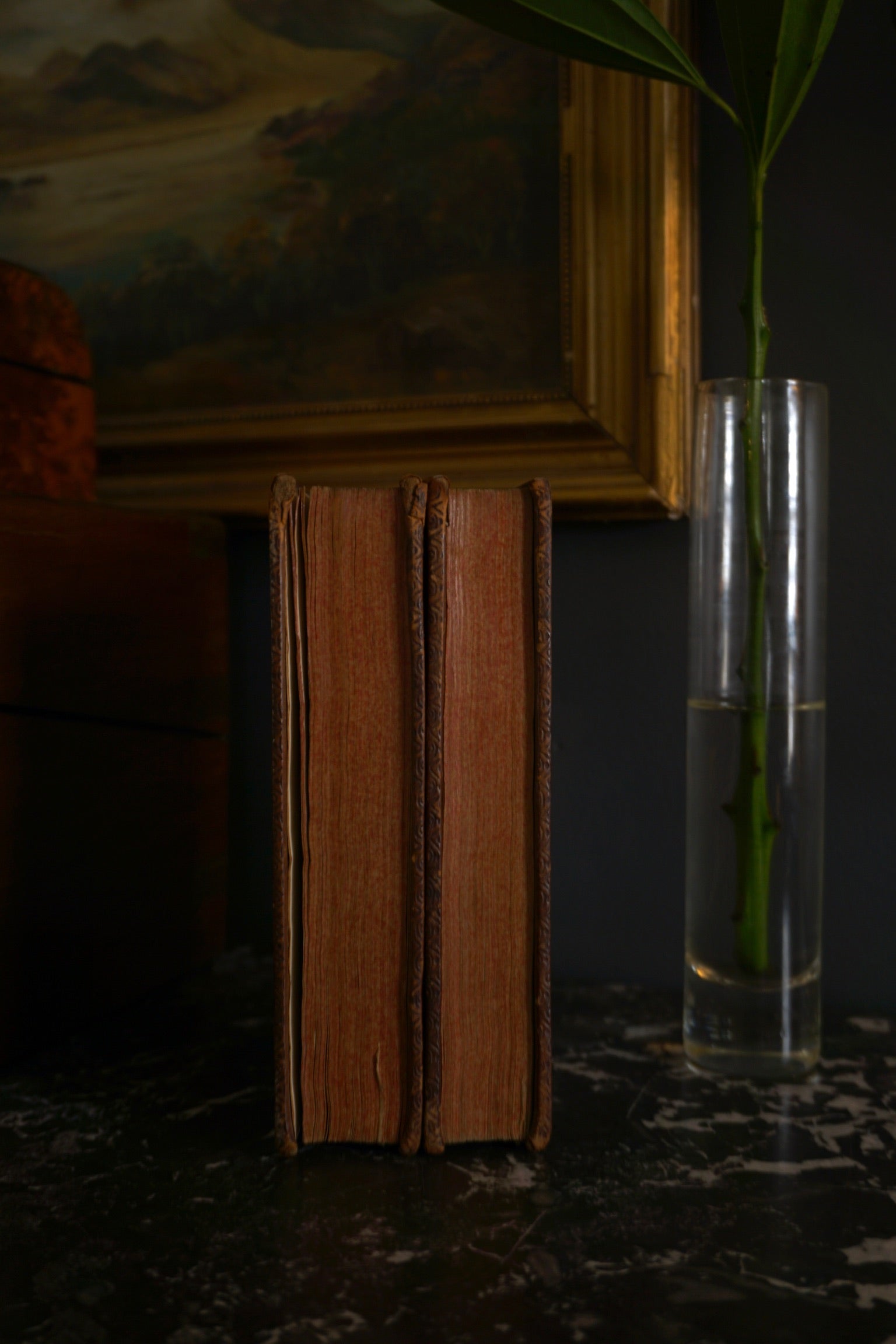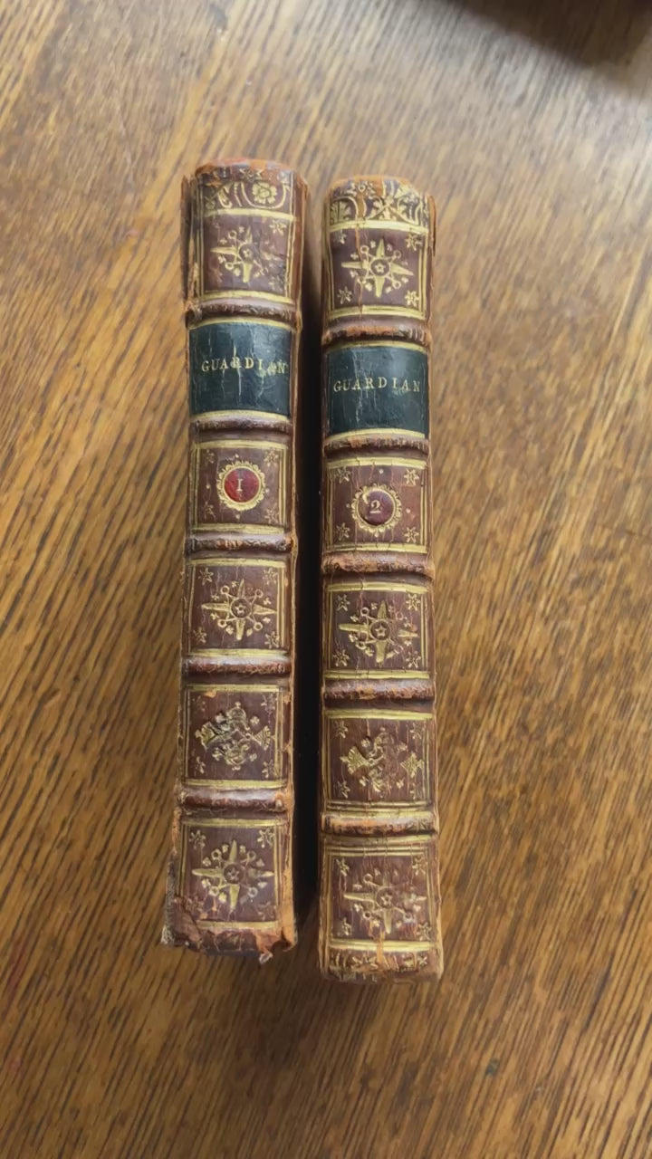 The Guardian, first published by Joseph Addison and Richard Steele in 1713, followed their earlier successes with The Tatler and The Spectator. This two-volume set, labeled as the “Fourth Edition” from 1726 and printed by J. Tonson in London, is an early 18th-century reprint of their collected essays. The Guardian offered moral, literary, and social reflections designed to encourage polite conversation and virtuous living, reflecting Addison and Steele’s goal to educate and refine readers through engaging writing. At a time when coffeehouses were centers of lively debate and the middle class sought thoughtful yet entertaining reading, these essays covered topics from literary critique to social behavior and politics, blending wit with moral guidance. Though shorter-lived than The Spectator, The Guardian played a key role in the English Enlightenment. This edition is also notable for its beautiful polished calf leather binding with gilt spine detailing, raised bands, and red-speckled edges—classic features of 18th-century craftsmanship. Personal touches like bookplates and inscriptions reveal the volumes’ history of ownership. In essence, this 1726 two-volume set not only preserves an important literary work but also showcases the elegance of Georgian bookbinding.
