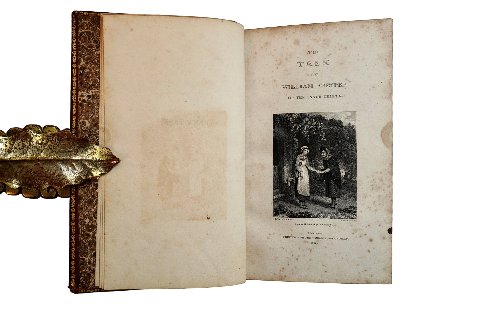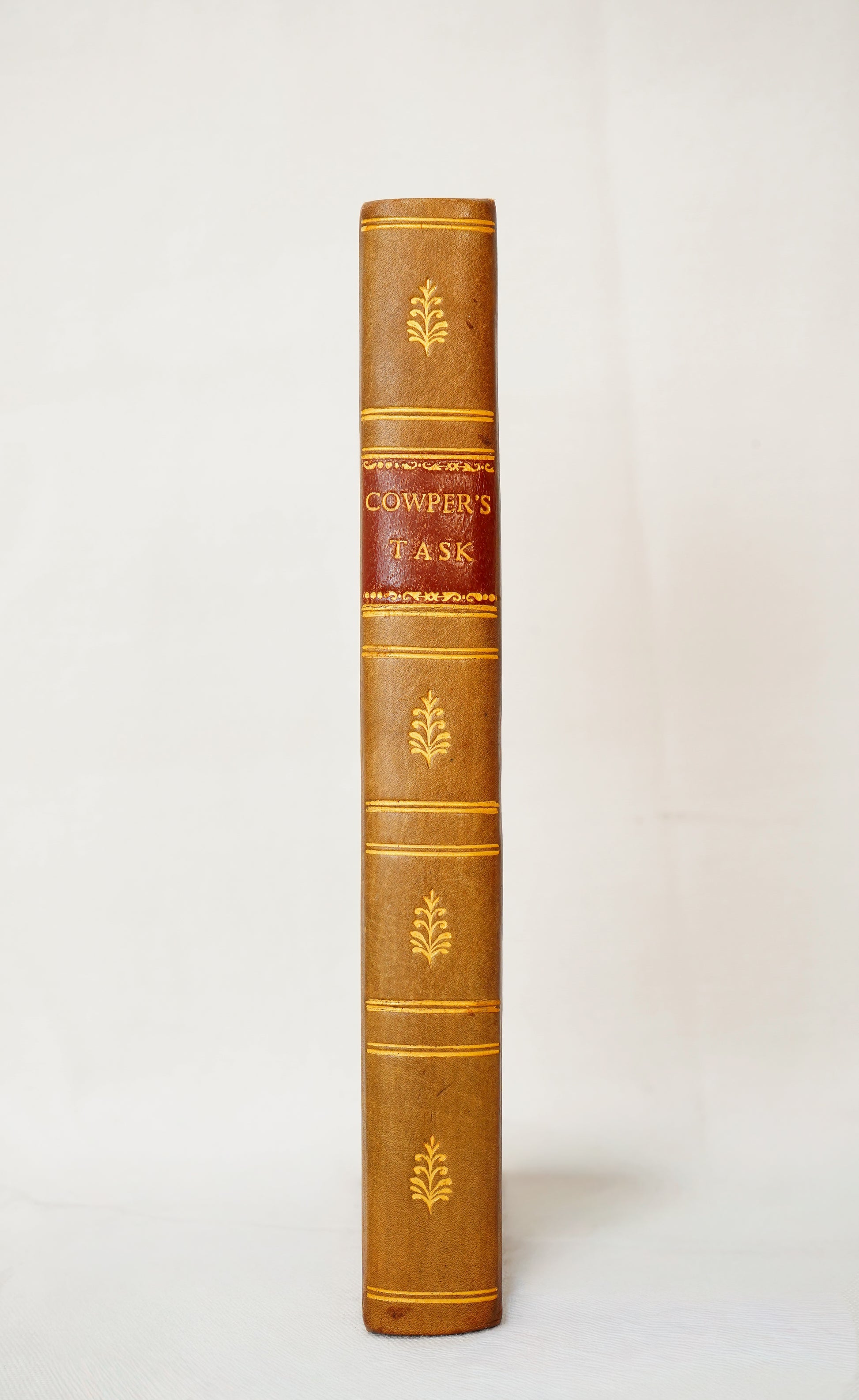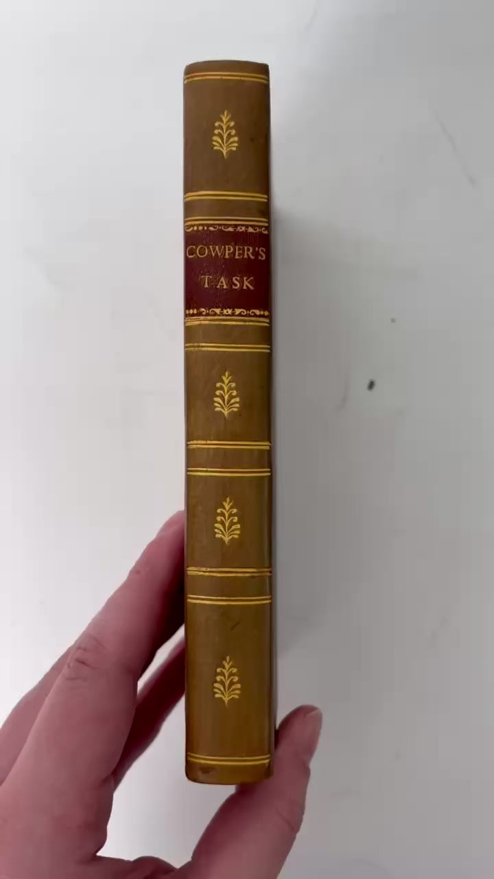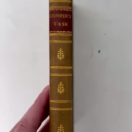A beautifully illustrated 1817 London edition of William Cowper’s The Task, the landmark six-book poem that helped steer English poetry toward the intimate, nature-loving voice later embraced by the Romantics. Cowper begins with the famous “sofa” and expands into reflections on rural life, the seasons, society, and the inner world, blending warmth, wit, and moral clarity in a way that still feels surprisingly modern. This copy stands out as a true decorative collector’s piece with full leather boards, an elegant tooled crosshatch design, gilt borders and gilt spine titling, gilt text block edges, and a generous suite of engraved plates that make it display-ready for a library shelf, coffee table, or curated antique vignette.