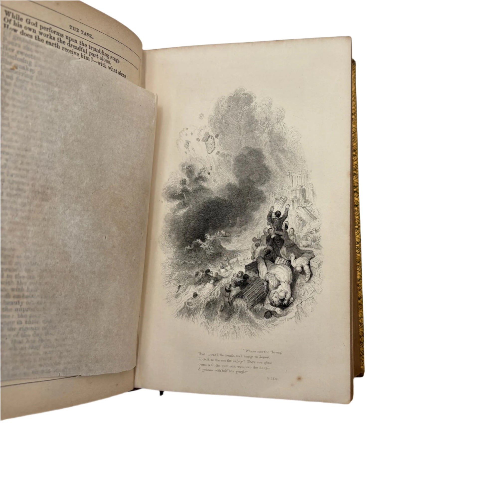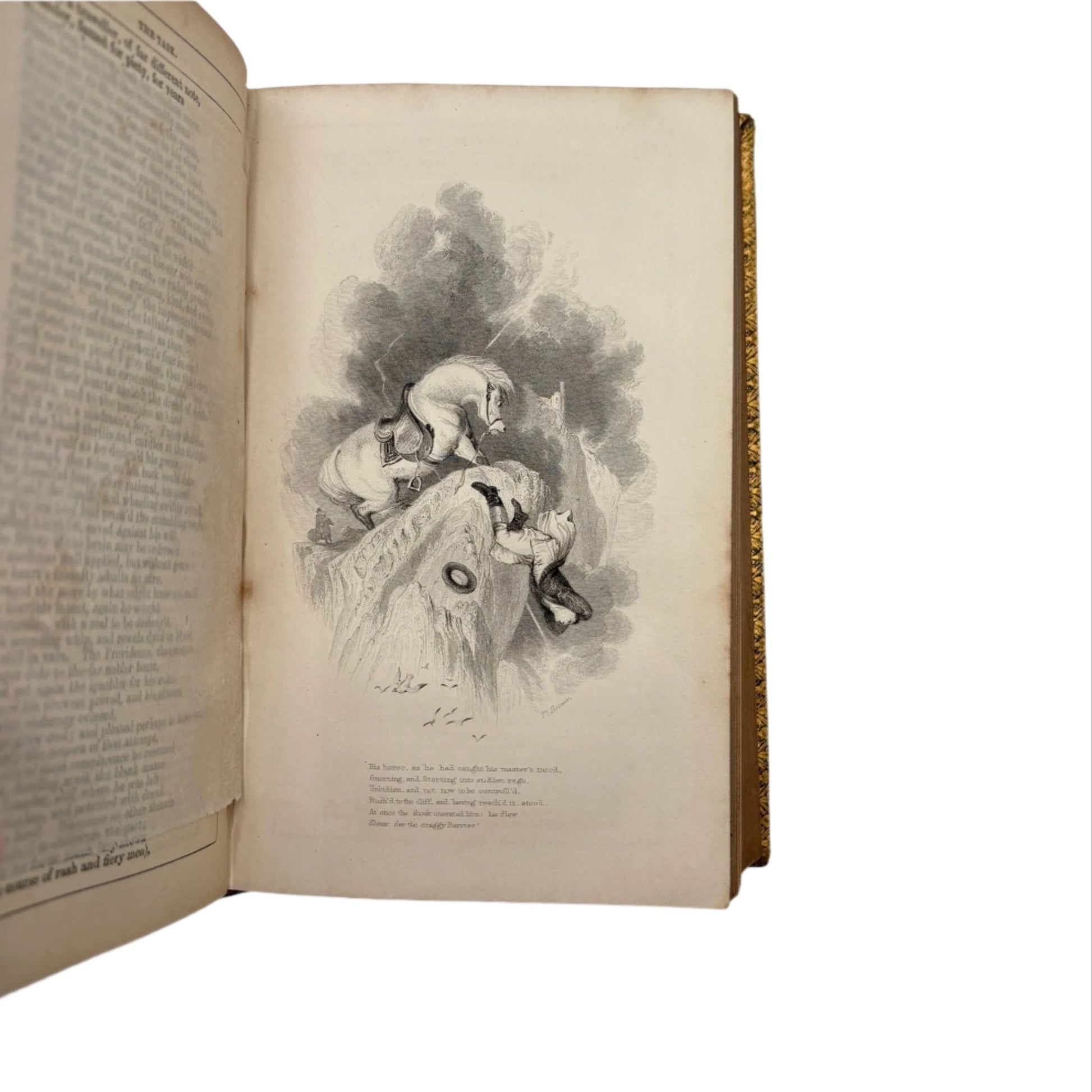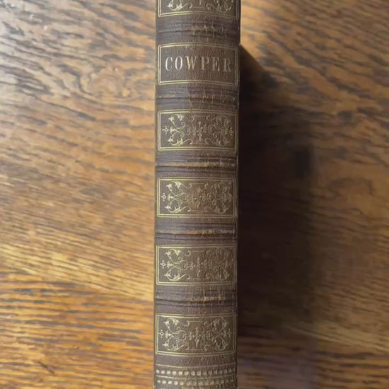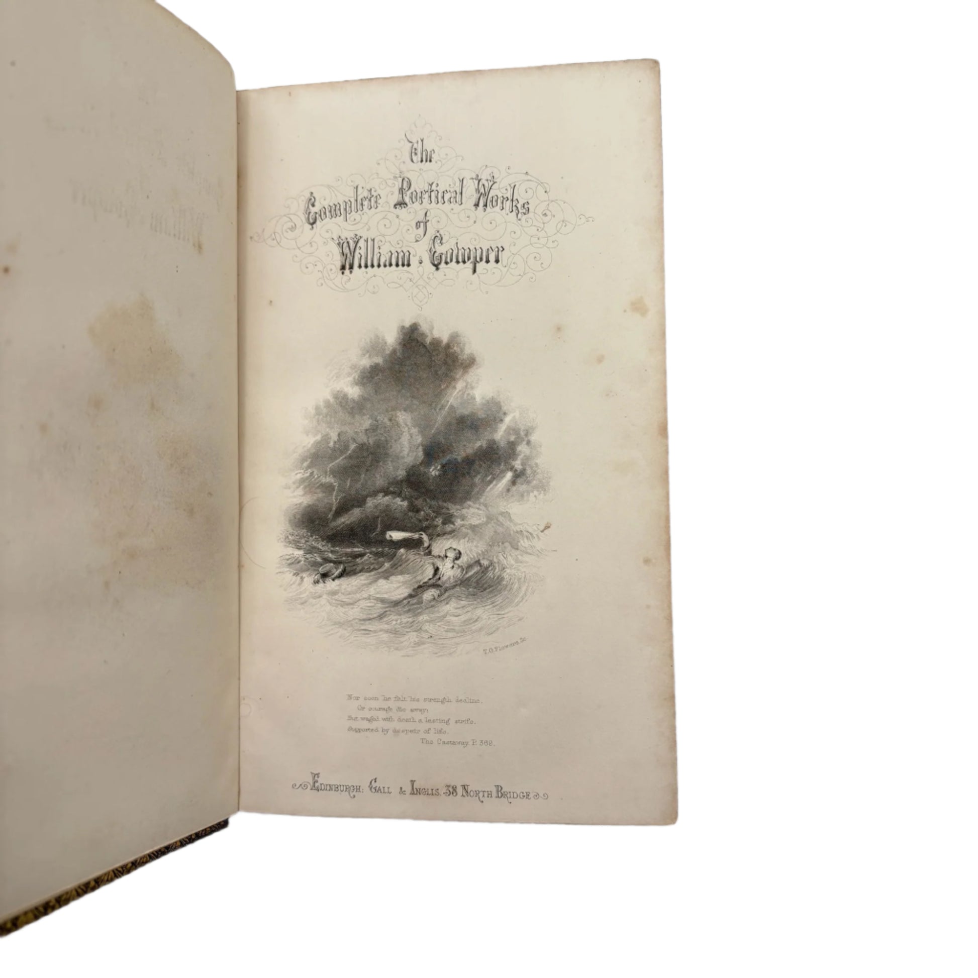 This beautiful mid Victorian edition of The Complete Poetical Works of William Cowper was published by Gall and Inglis in Edinburgh around 1853 and is a striking example of nineteenth century gift book craftsmanship. Bound in rich green morocco leather with an intricate gilt tooled cover and spine, raised bands, decorative gilt compartments, and bright gilt page edges, it has all the hallmarks of a high quality presentation volume. Inside are Cowper’s full collected poems, including The Task, John Gilpin, Tirocinium, and the Olney Hymns, accompanied by eight finely engraved steel plates that bring the dramatic and serene moments of his poetry to life. A period inscription dated December 12, 1853 and a later ownership note from Salisbury in 1946 add a wonderful sense of provenance and personality. This is the kind of decorative antique book that appeals to both literature lovers and collectors who want a statement piece for a library, bookshelf, or desk. Cowper’s writing bridges the elegance of Georgian verse and the emotional depth of the early Romantic period, making this volume as meaningful to read as it is beautiful to display.