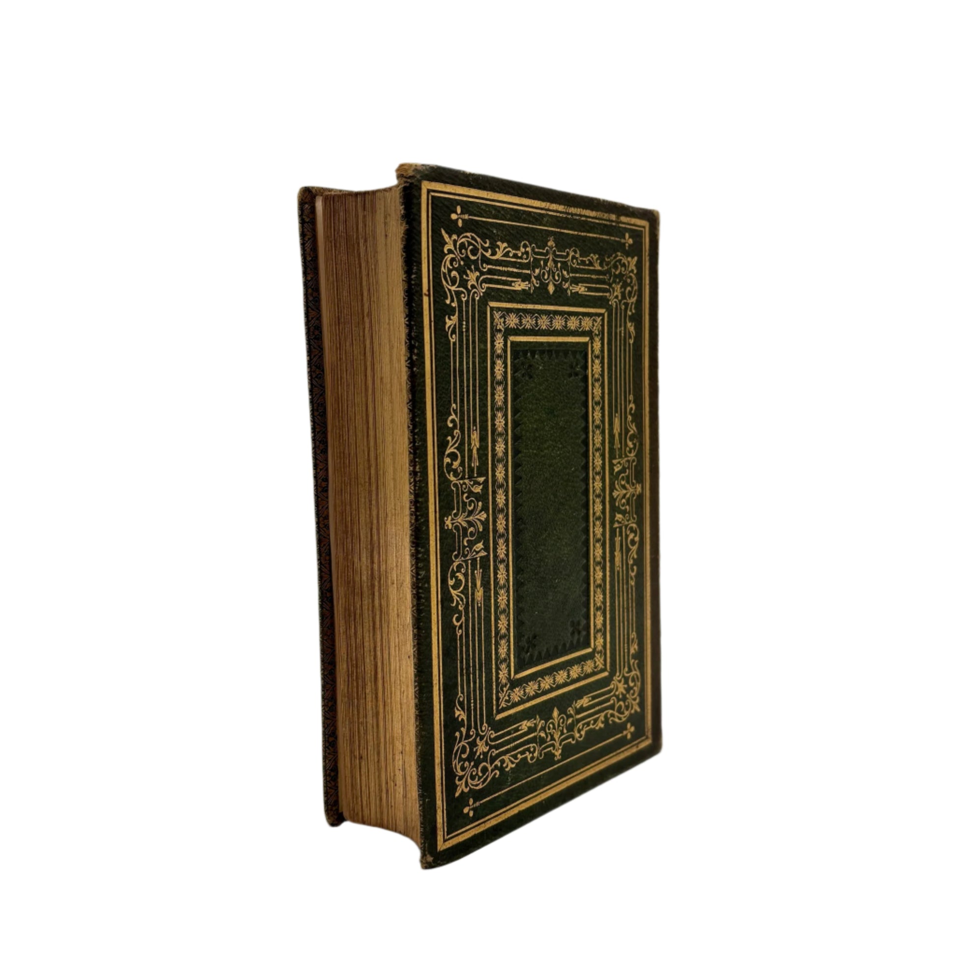 This antique book is in very good condition for its age and shows gentle, natural wear that adds to its charm. The green morocco leather binding remains sturdy with light rubbing to the spine ends and corners, while the gilt decoration on the covers and spine is still bright and eye catching. The gilt page edges are clean and glowing. Inside, the pages show the warm age toning typical of mid nineteenth century paper with scattered foxing around some of the engraved plates. The hinges are secure and the binding remains tight. The book retains a printed bookplate and two handwritten ownership notes that add to its historical appeal. Overall, it is a well preserved and highly decorative Victorian volume.