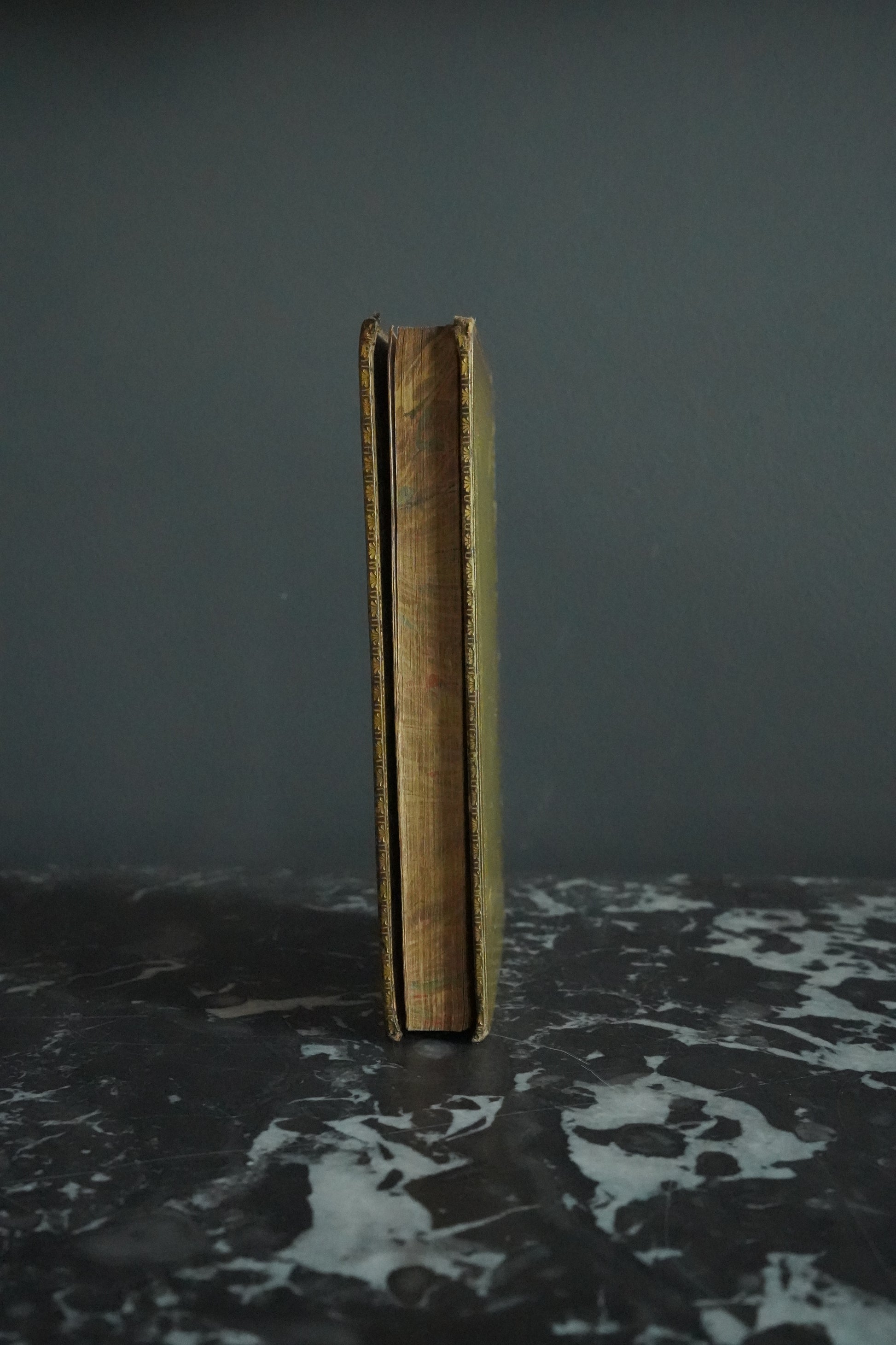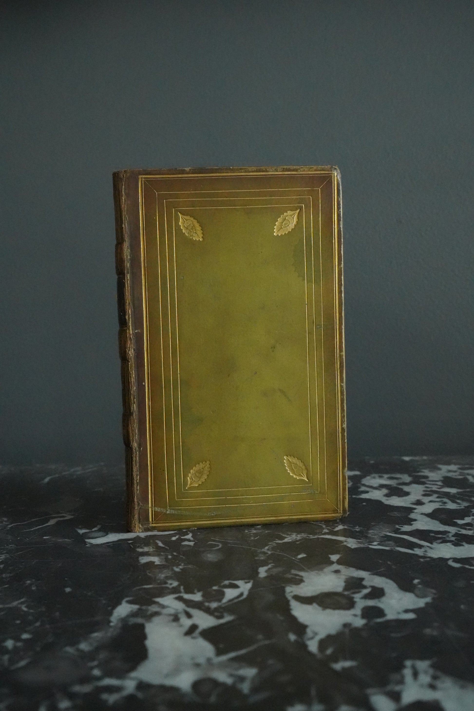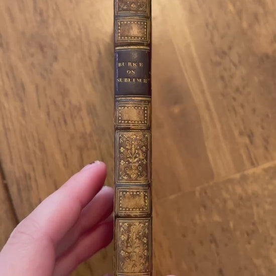 This 1825 edition of A Philosophical Inquiry into the Origin of Our Ideas of the Sublime and Beautiful by Edmund Burke is a beautifully bound and intellectually important work in the world of art, literature, and design. First published in 1757, Burke's writing explores how beauty and the sublime affect us differently, laying the foundation for the Romantic movement and shaping how we think about emotion, contrast, and sensory experience. This edition was printed by C. & C. Whittingham in Chiswick and features a finely engraved frontispiece depicting a classical allegorical figure with cherubs beneath a rainbow. The binding itself is a showstopper: full polished olive-toned calf leather with richly tooled gilt borders and delicate gilt leaf corner motifs on both boards. The spine is intricately decorated with gilt floral tooling and features a black leather title label reading “Burke on Sublime.” Marbled endpapers, decorative gilt dentelles, and a tight, elegant presentation make this book just as beautiful to display as it is to read. Burke’s reflections on aesthetics remain relevant today and offer insight into the emotional power of art, architecture, and design. Whether you’re a collector, decorator, or simply love antique books with depth and beauty, this volume is both meaningful and stunning.
