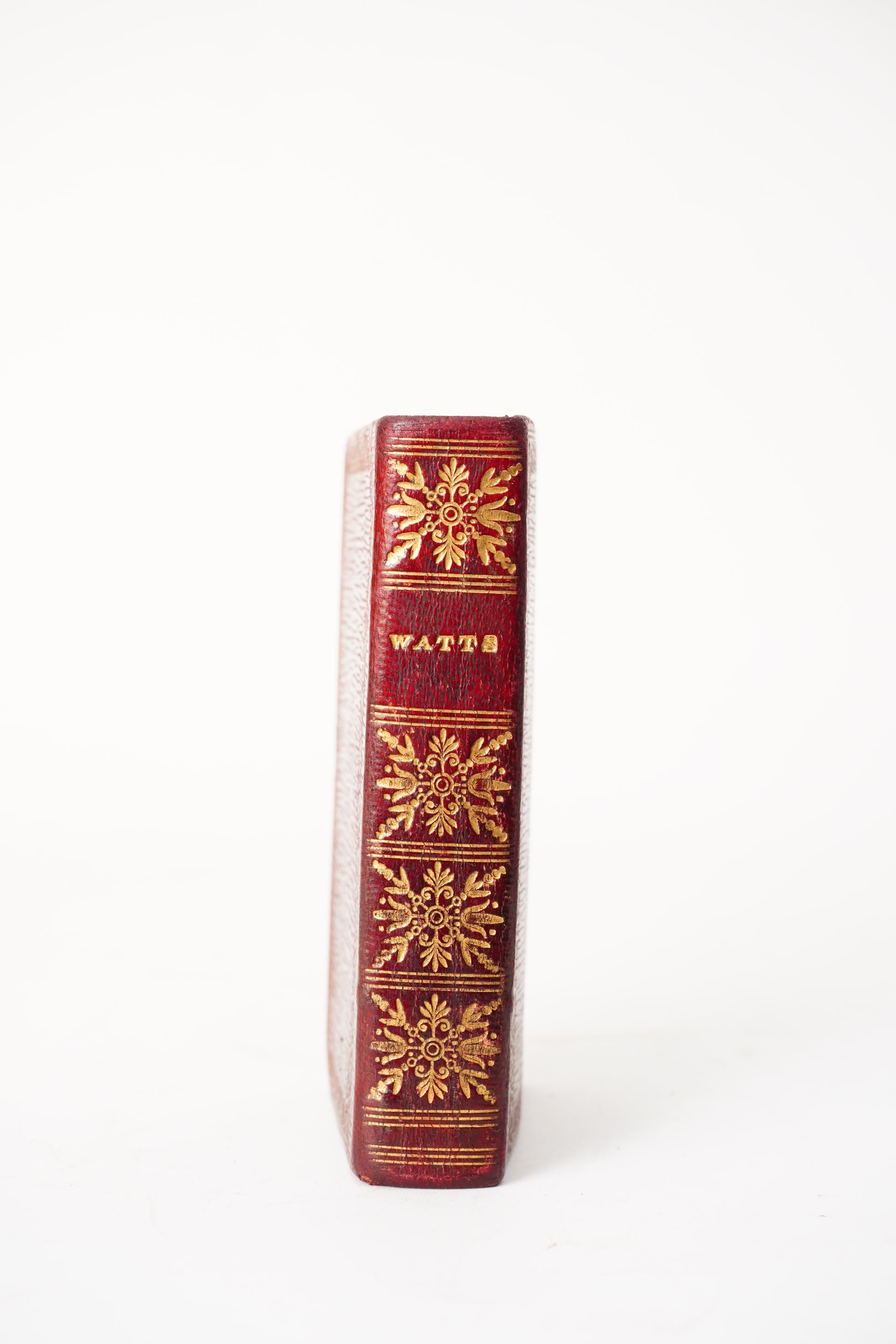 This copy is especially appealing because it’s not just small, it’s genuinely handsome: deep red leather binding with crisp gilt borders, a richly tooled spine, and bright gilt page edges that still catch the light. Inside, it includes an engraved portrait frontispiece of Watts, plus a period owner inscription dated 1853, which adds a little human history without overwhelming the book.