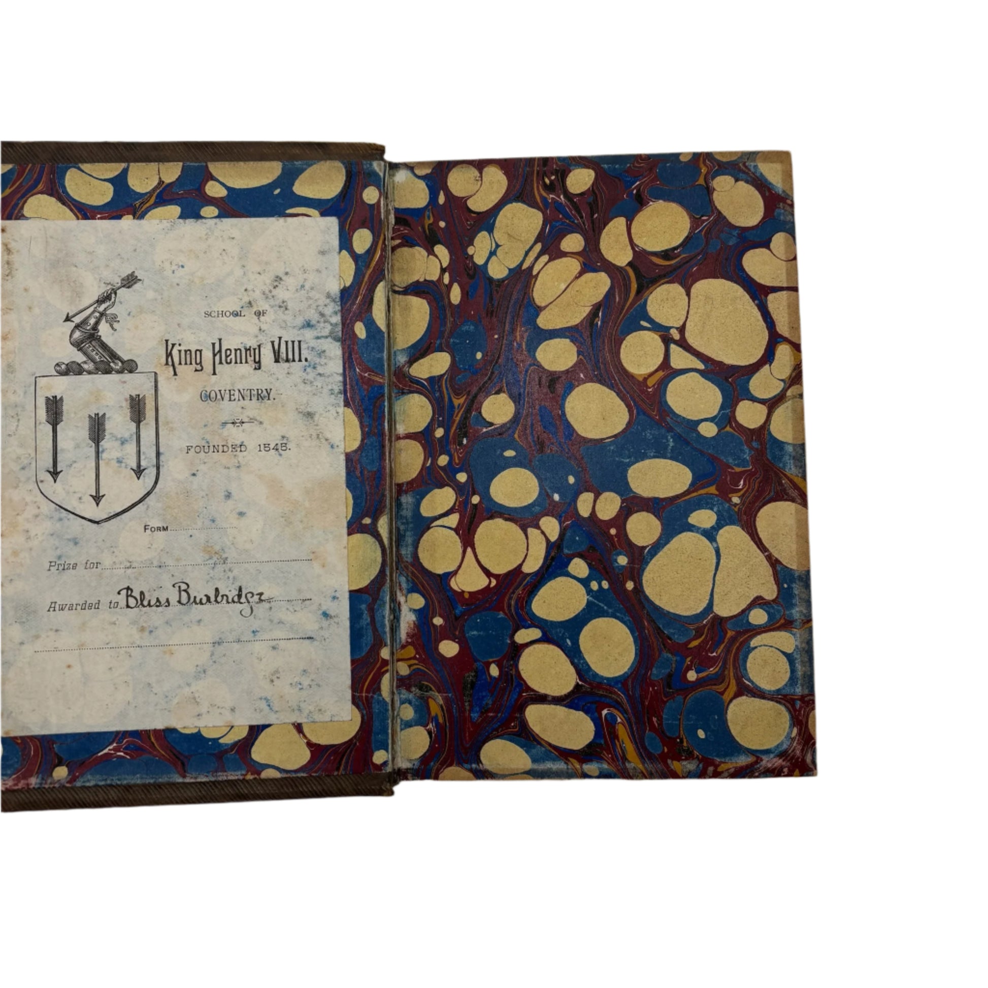 This 1894 Macmillan edition of Tom Brown’s School Days is a beautifully preserved example of Victorian fiction and an exceptional decorative book for collectors who love character, history, and fine bindings. Presented in a full calf prize binding from the School of King Henry VIII in Coventry, it features a rich brown leather cover with raised bands, intricate gilt tooling, and a crisp black leather title label. The front board displays the school’s gilt armorial crest of three arrows and a knight’s arm, linking this copy directly to a real English school tradition. Inside, the original marbled endpapers and marbled page edges add striking color and movement, and the matching prize plate records that the book was awarded to a student named Bliss Burbidge. This edition is illustrated by Arthur Hughes and Sydney Prior Hall, bringing to life the most memorable scenes of the classic story. Written by Thomas Hughes, Tom Brown’s School Days follows the adventures of a young boy at Rugby School and explores friendship, courage, and moral growth in a way that shaped Victorian ideas about education. This copy is both a collectible literary classic and a beautifully made display piece that fits effortlessly into English country house inspired decor, libraries, and vintage book stacks.