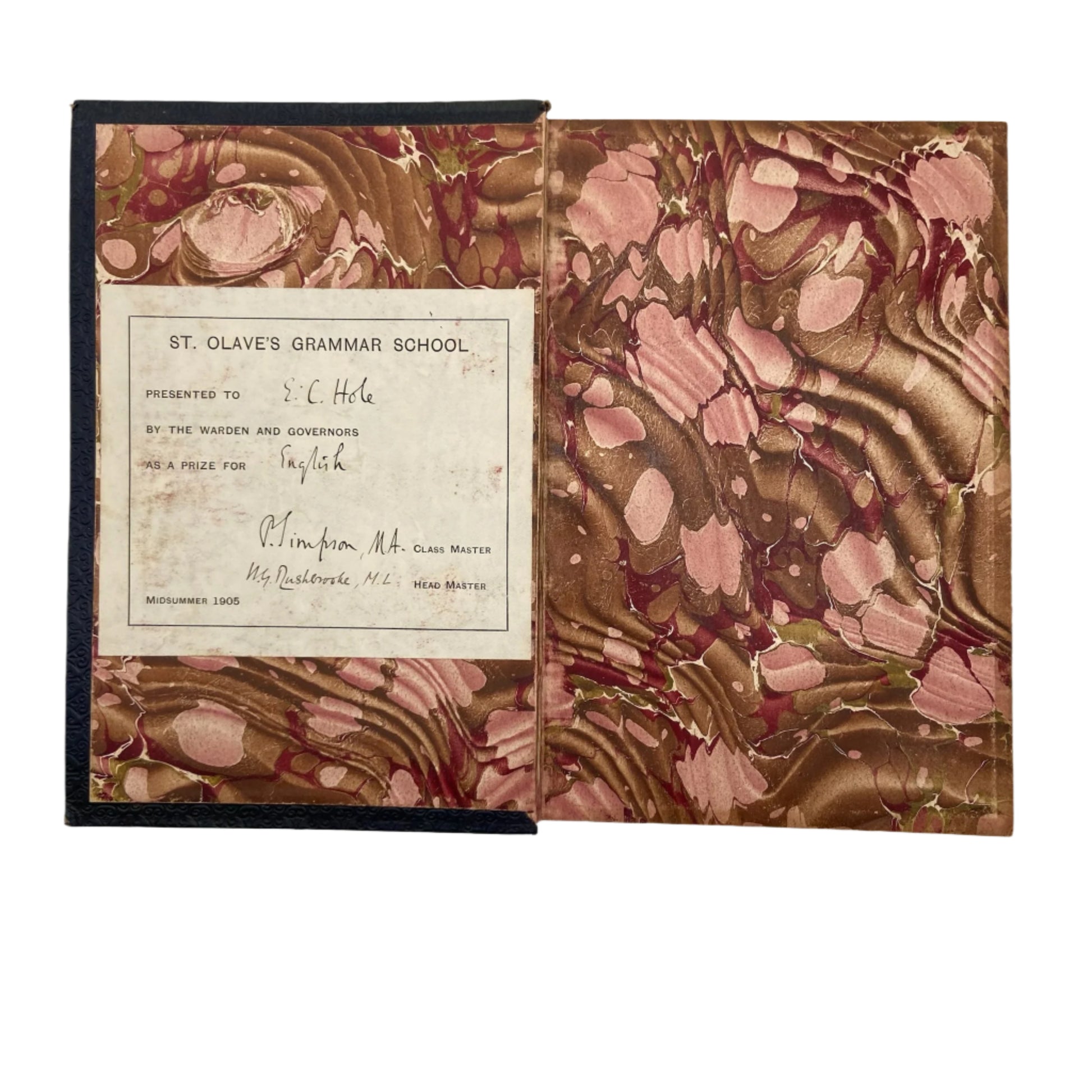 The leather boards exhibit minor scuffing and rubbing along the spine ends and corners, consistent with careful use over time. The gilt crest and tooling remain vibrant, although slight fading may be noticeable in areas that experienced more handling. Internally, the pages are generally clean, with only occasional light foxing—primarily near the preliminaries and any illustration plates. The hinges appear firm, suggesting that the binding remains structurally sound. Overall, the volume is in commendable shape for a prize or presentation copy dating from the early 20th century.