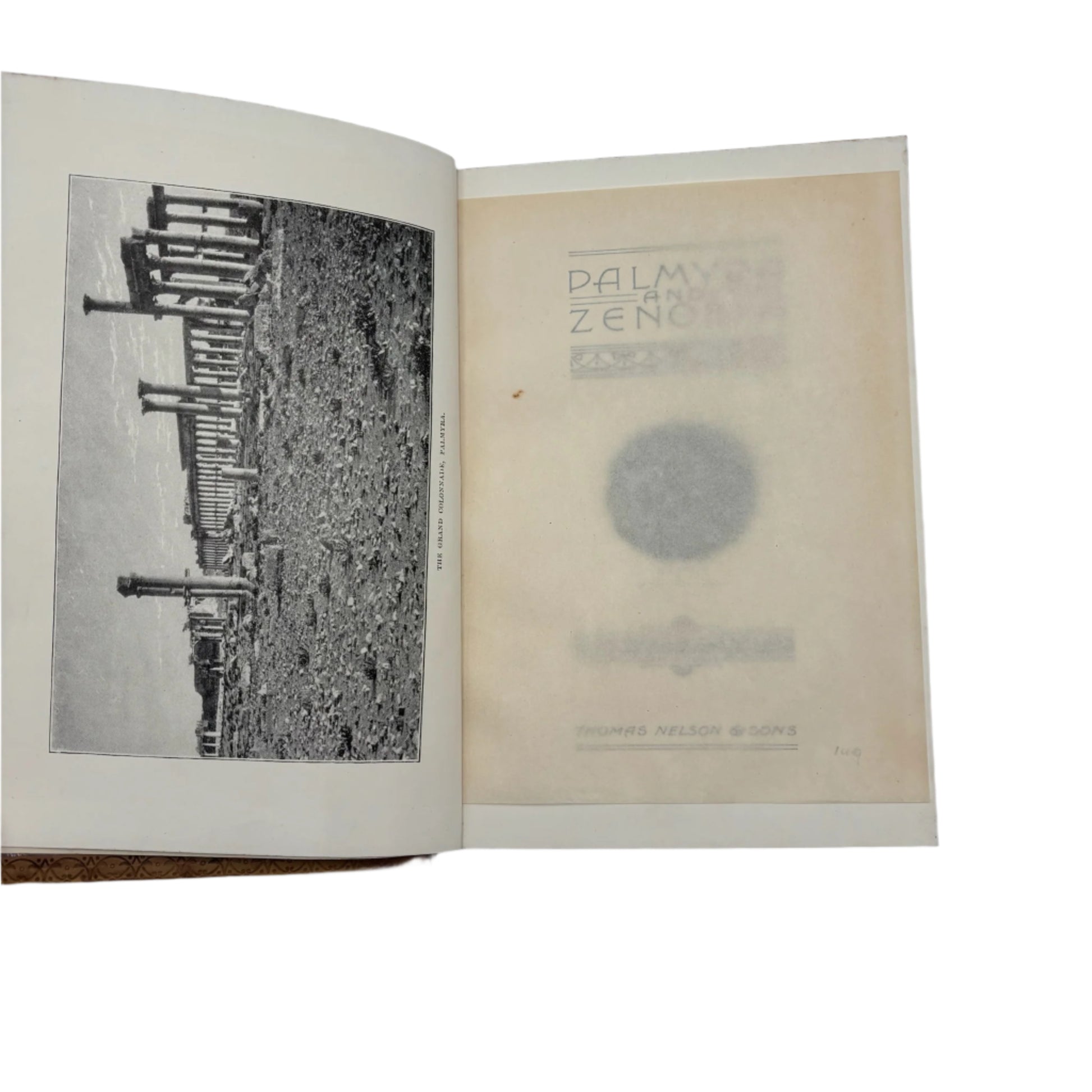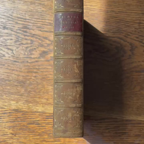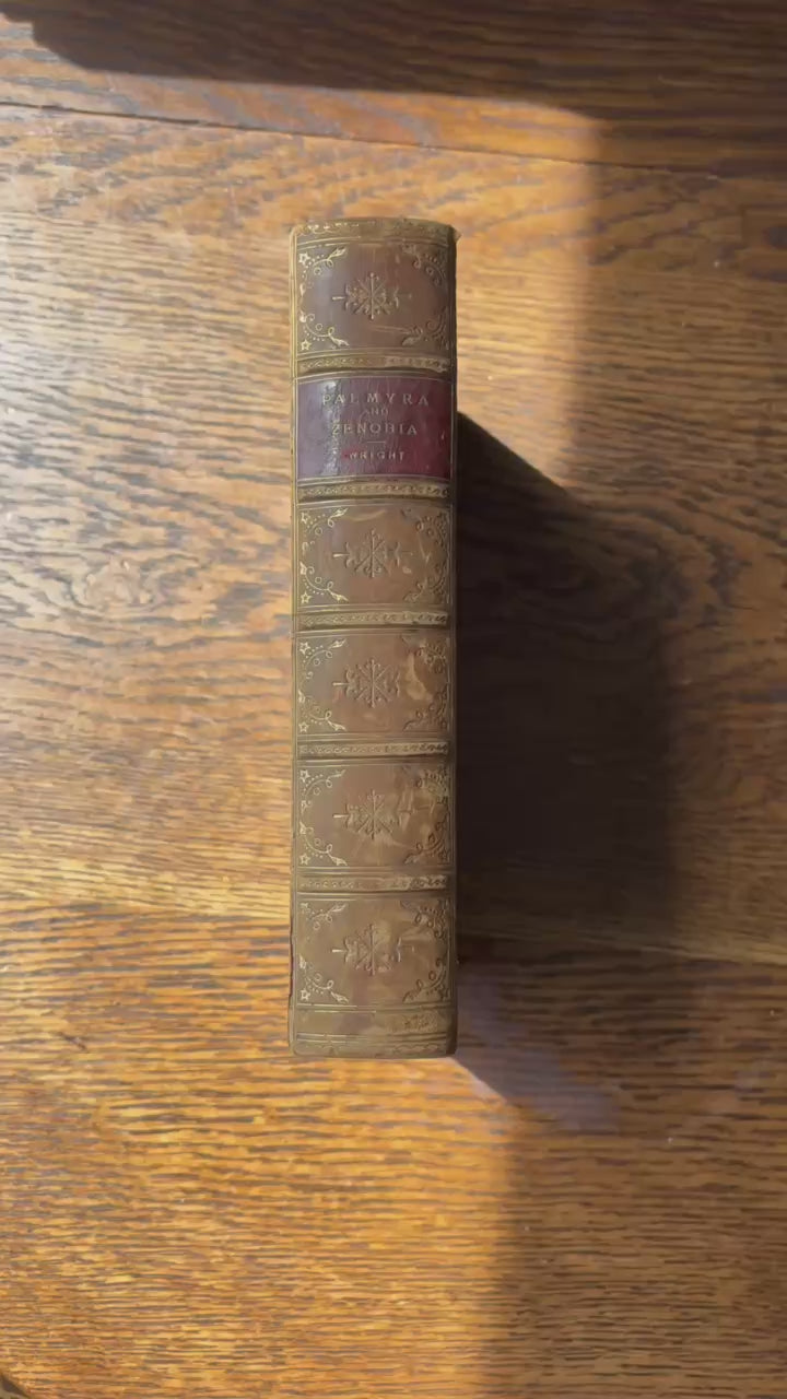 This antique 1895 history book Palmyra and Zenobia by William Wright is a beautifully presented Victorian volume that blends fascinating historical storytelling with an elegant decorative binding. Published by Thomas Nelson and Sons, the book explores the ancient Syrian city of Palmyra and the life of its remarkable queen, Zenobia, through engaging travel narrative, archaeological observations, and vivid illustrations of the ruins. This edition is made especially desirable by its full polished calf prize binding from The King’s School in Chester. The front board displays a bold gilt royal arms crest featuring the lion and unicorn, a detail that instantly elevates the book as a display piece. The spine is richly gilt with raised bands, ornate floral tooling, and a red morocco title label that remains clear and attractive. Inside, the book features marbled endpapers and a marbled fore edge, both in deep, dramatic colors that complement the warm calf leather. Illustrated plates of Palmyra’s ruins provide striking visual interest throughout the text. This volume is ideal for collectors, history lovers, and anyone looking to add a refined antique leather book to their home library or decor.