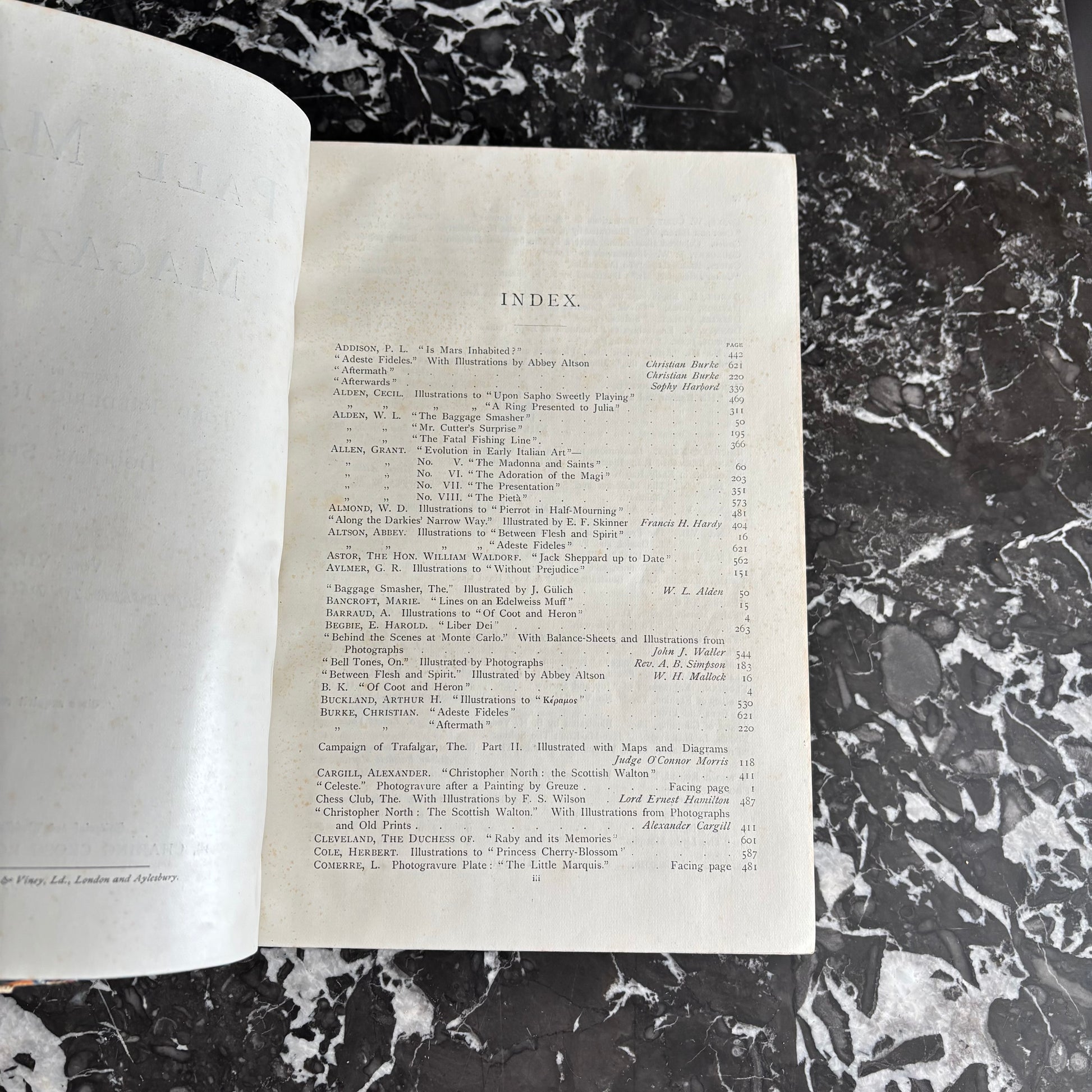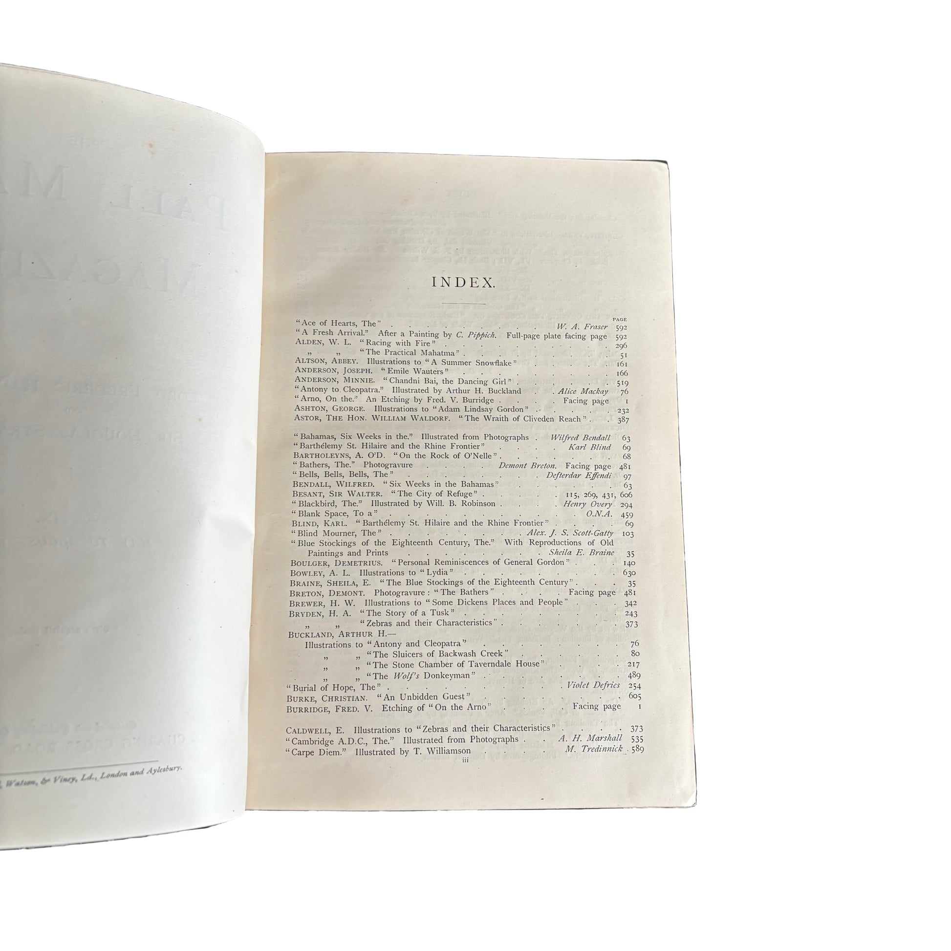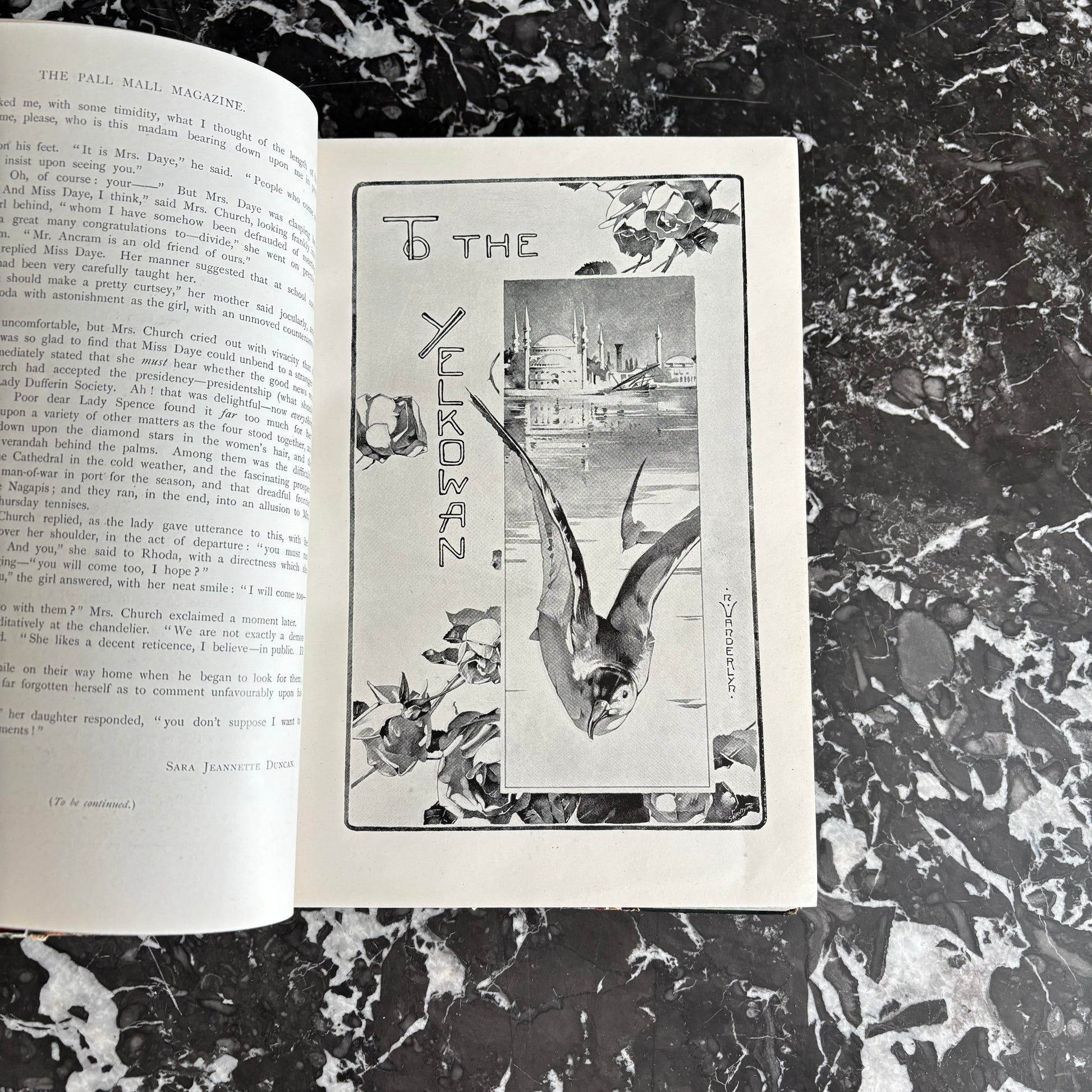This handsome two-volume set of The Pall Mall Magazine captures the spirit of Victorian literary and artistic culture. Published in London in 1895 and 1896, these bound editions (Volumes VII and IX) feature a rich mix of serialized fiction, essays, travel narratives, poetry, and finely executed illustrations. Edited by Lord Frederic Hamilton and Sir Douglas Straight, The Pall Mall Magazine was one of the leading illustrated journals of the late 19th century, rivaling The Strand in quality and readership. Its pages carried contributions from celebrated authors, along with essays on science, exploration, and art that reflected the intellectual curiosity of the Victorian age.