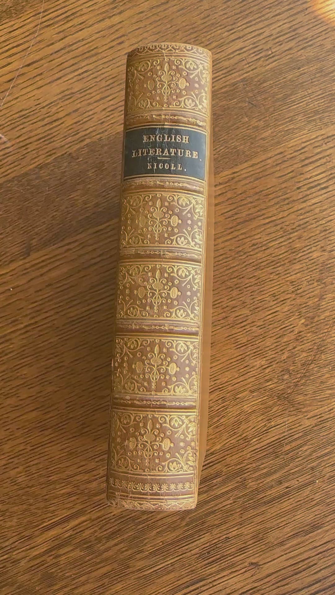 The volume is bound in full polished calf, featuring a simple yet elegant gilt border on the boards and elaborate gilt decoration in the spine compartments. A black leather title label reads “English Literature—Nicoll,” adding a refined contrast against the warm tan of the calf. Such prize or presentation bindings were common in the late 19th century, often used by schools or institutions to honor achievement. Inside, Nicoll organizes the text chronologically, highlighting key literary periods (e.g., Chaucer’s medieval verse, Elizabethan drama, the rise of the novel, and so forth) and focusing on prominent authors who shaped the evolution of English letters.