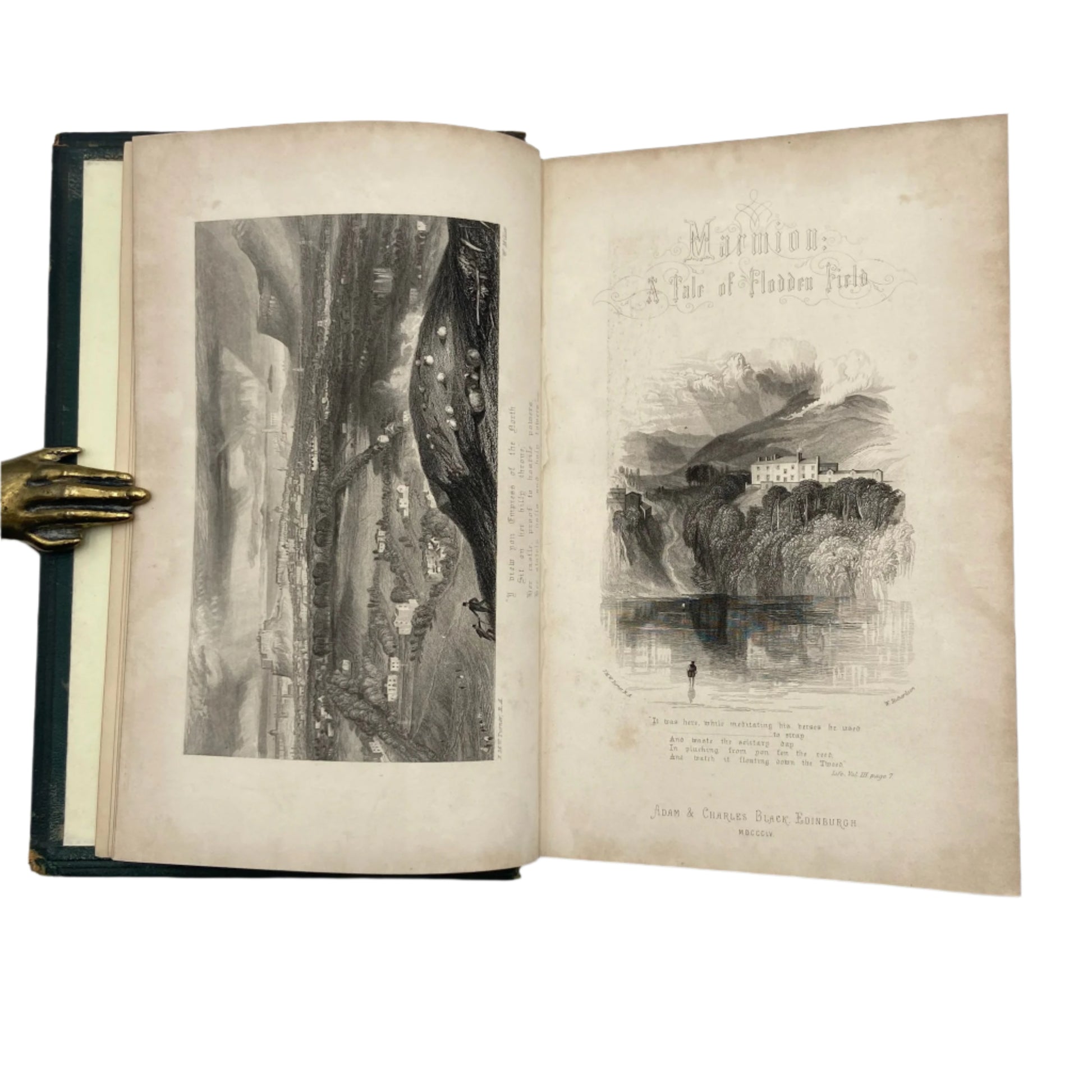 In summary, Marmion is a stirring tale of love, betrayal, and honor set in medieval Scotland, written during the height of the Romantic era to evoke the chivalric spirit and historical pride of the nation. The Victorian edition’s elegant green leather binding, decorative details, and engraved illustrations make it not only a literary treasure but also a collectible work of art.
