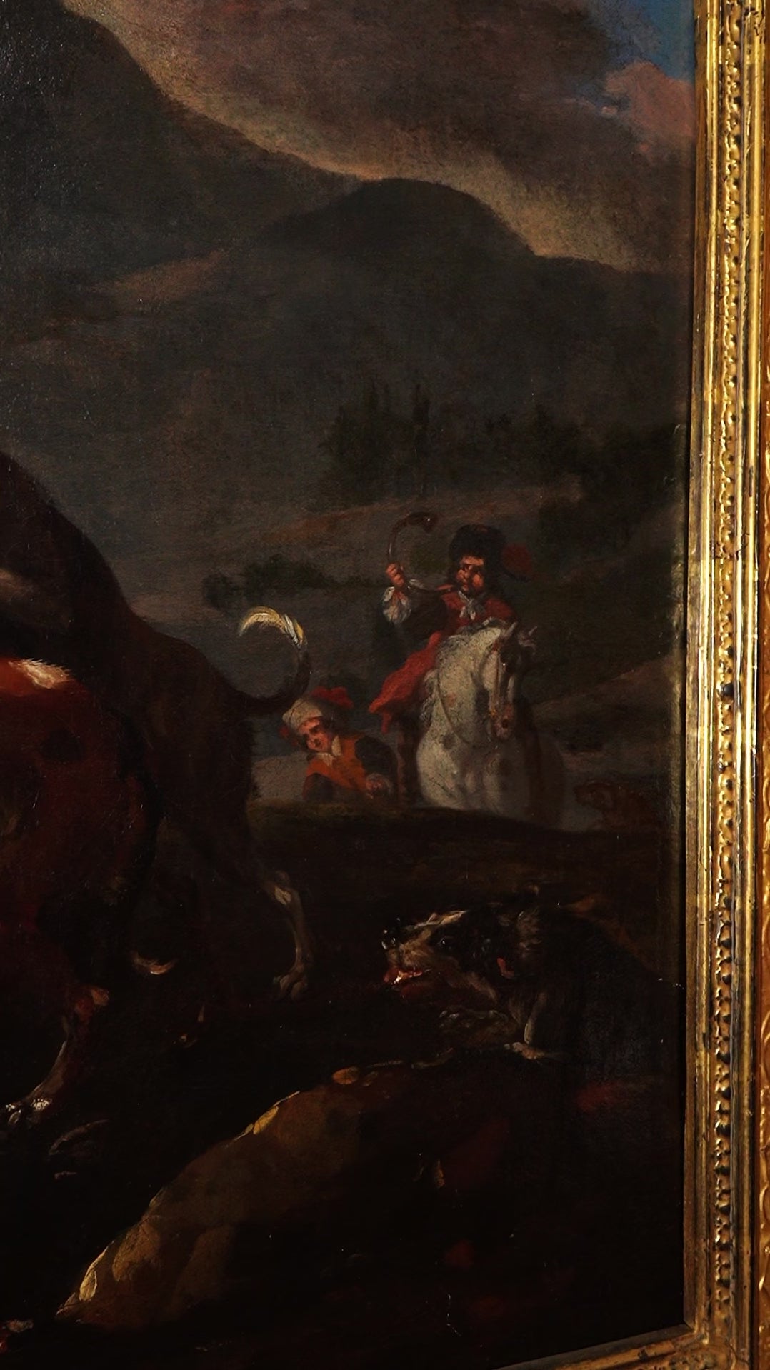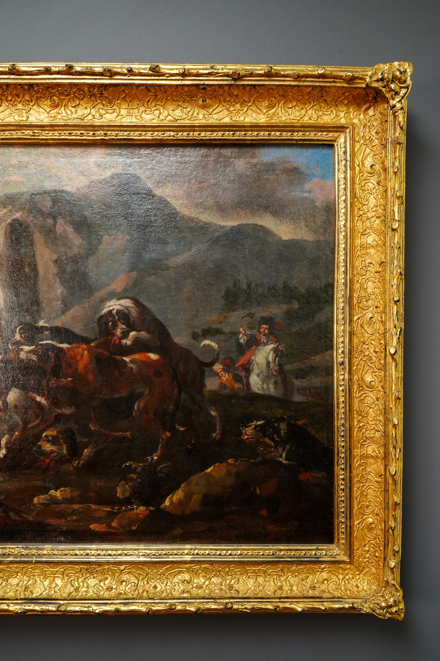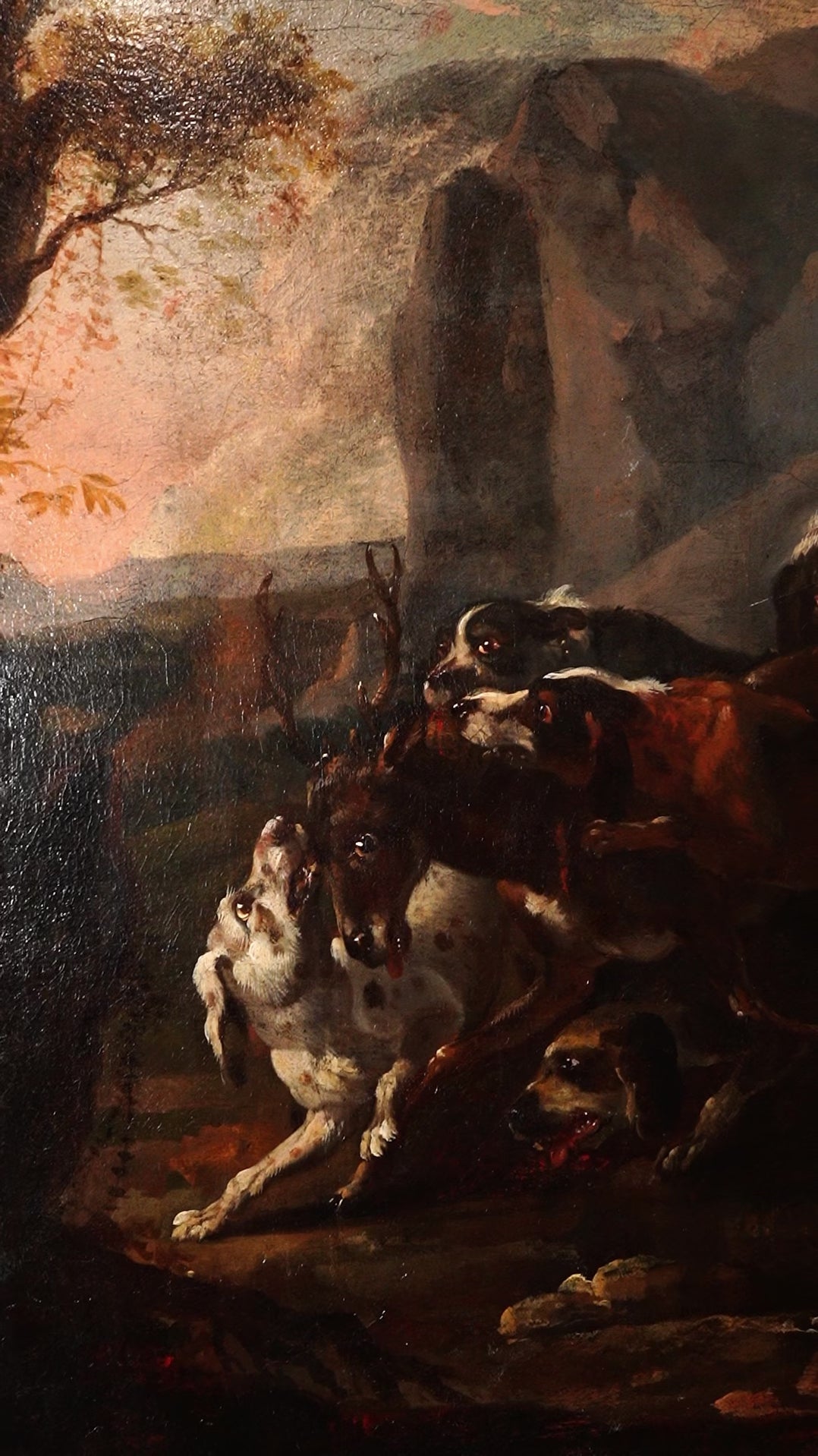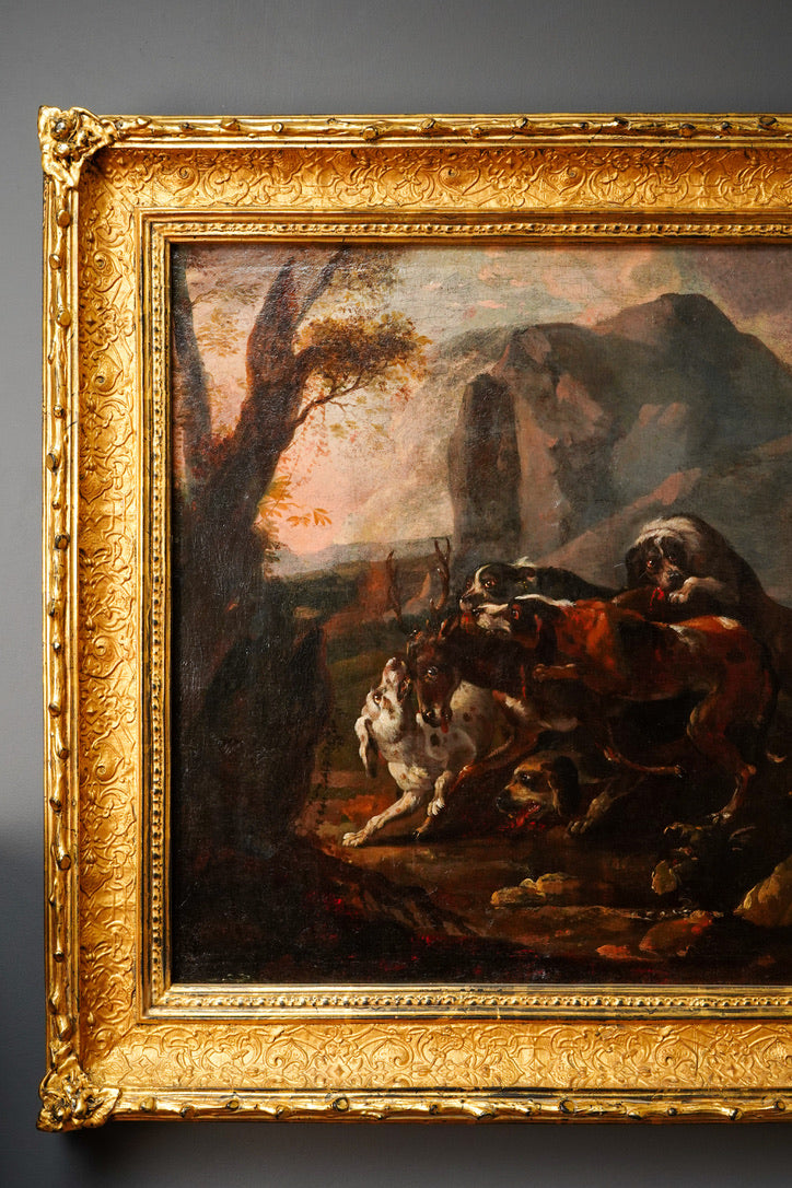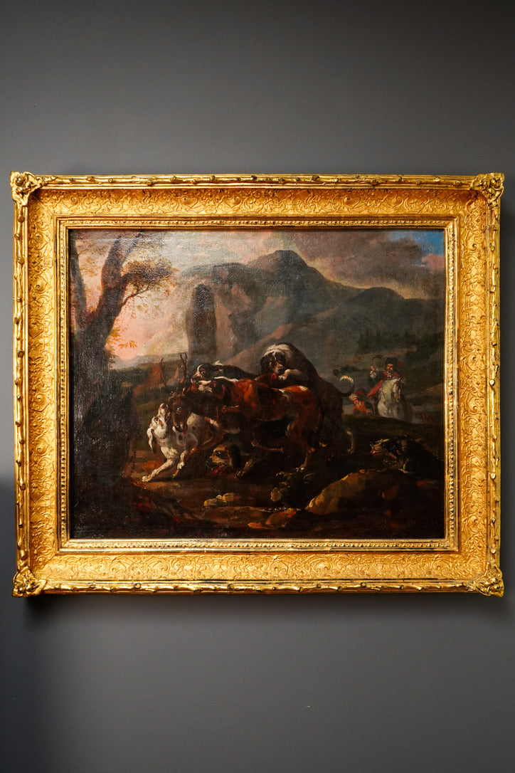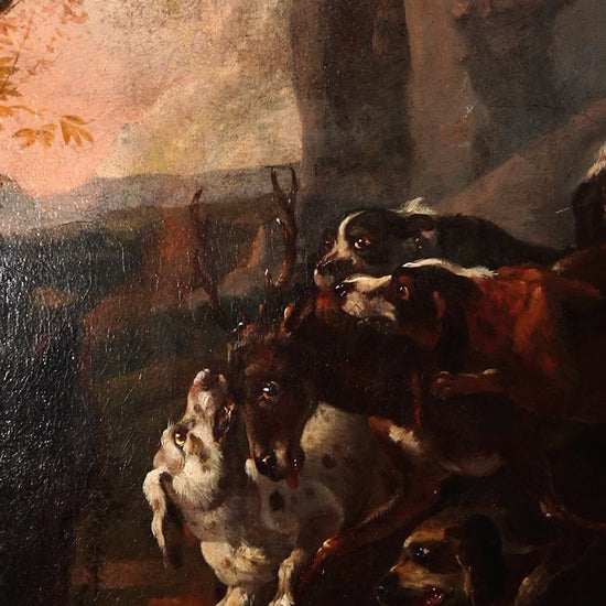 Stylistically, the painting reflects how French court taste evolved from Fontainebleau’s 16th-century Mannerist roots into a more grounded, naturalistic approach that took hold in the 1700s. The hounds are rendered with careful observation in their musculature and posture, while the stag, caught mid-struggle, is given a dignity that heightens the drama. The rocky outcrop and moody sky create a theatrical setting that feels connected to the courtly hunting landscape associated with Fontainebleau and its surrounding forests.