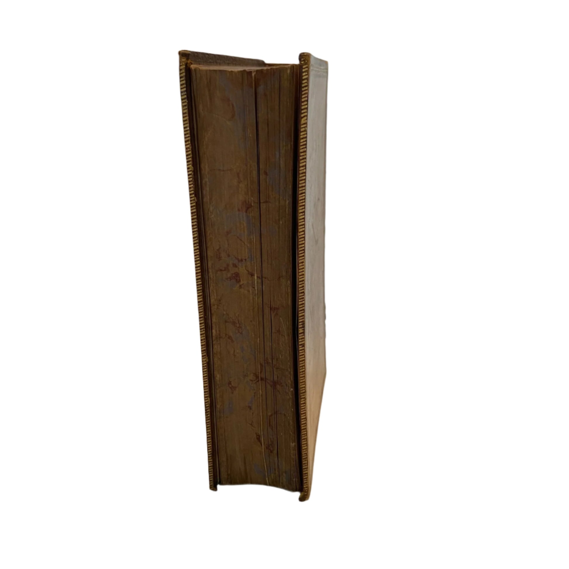 Condition-wise, the book is structurally intact but shows visible signs of age. The front hinge is cracked and partially split, though the board remains securely attached. The leather boards exhibit scratches, scuffs, and patches of discoloration, particularly on the front cover. Gilt detailing on the spine remains bright and attractive. The page edges retain their original marbled finish, and the interior pages are clean and legible with gentle age toning. Overall, it’s a handsome and richly detailed Victorian binding with a storied past—ideal for collectors of literary history or decorative antique books.