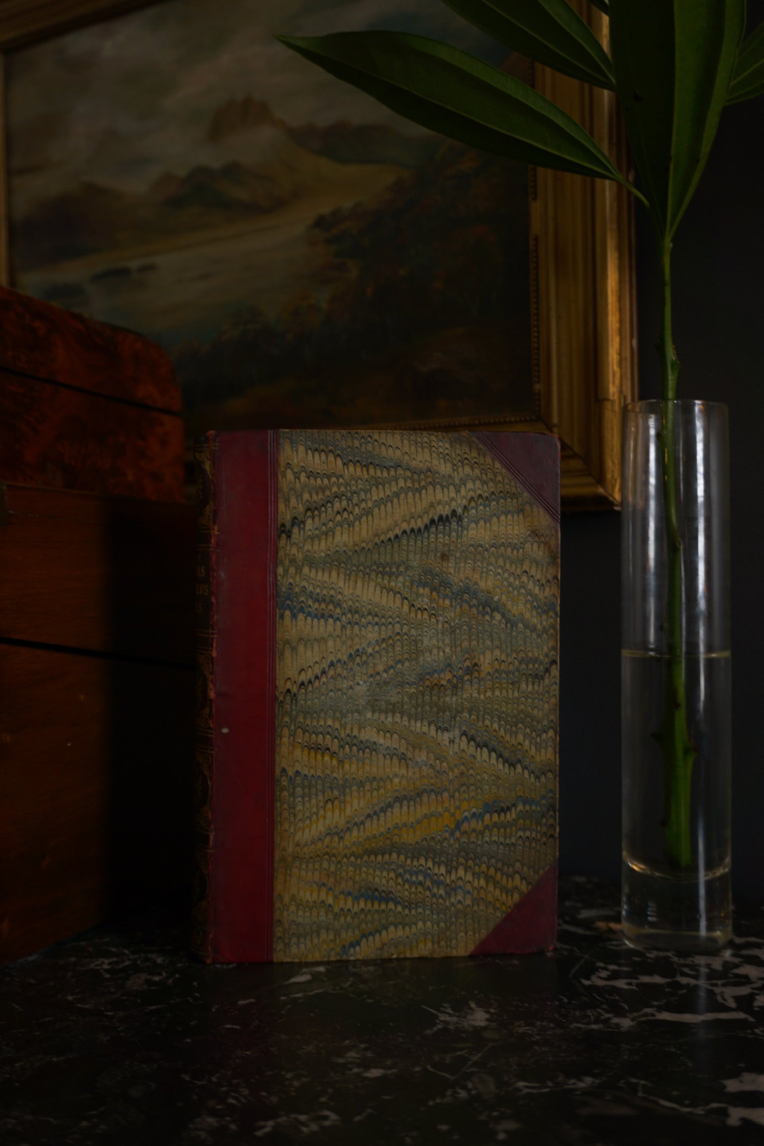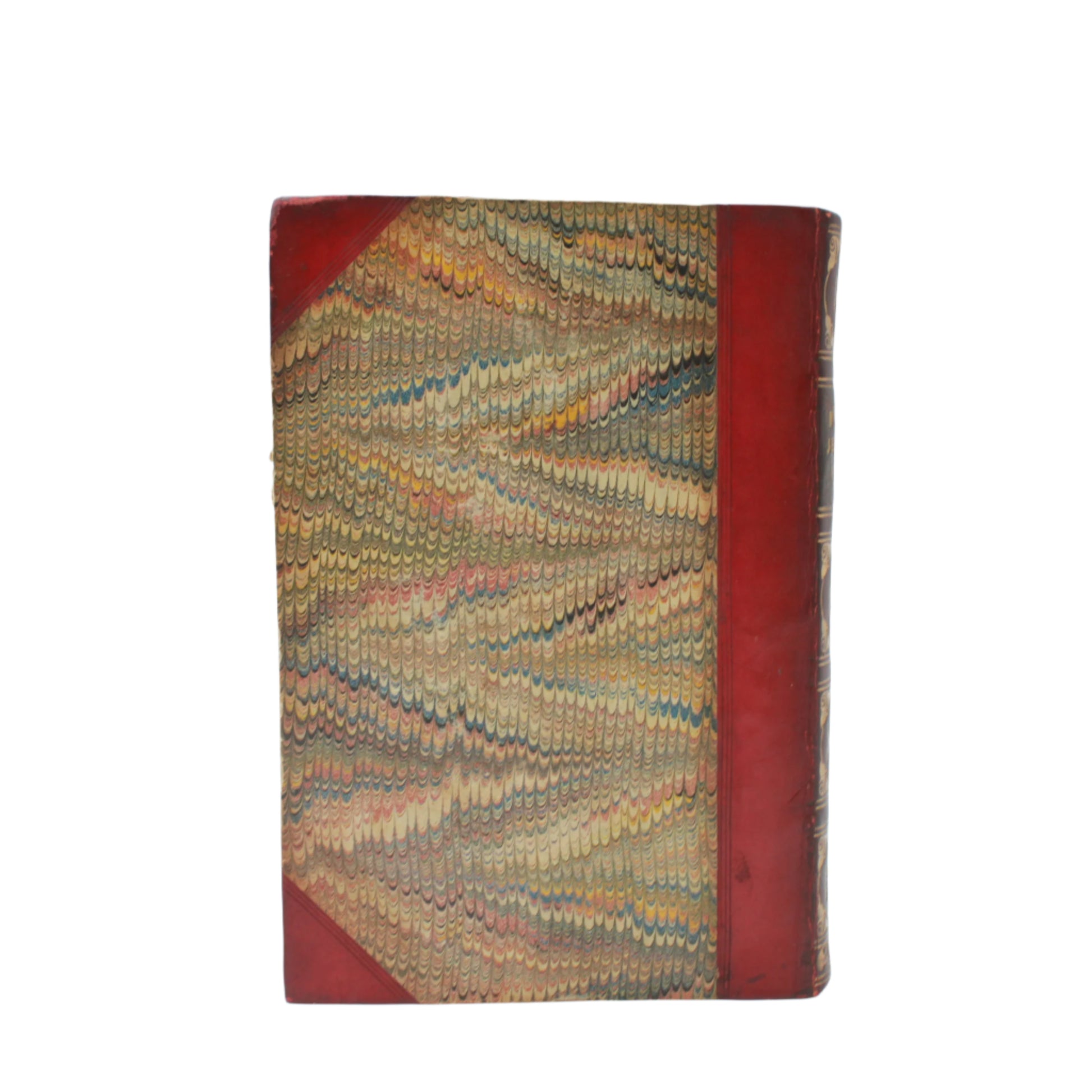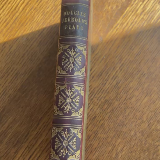 This collection of Douglas Jerrold’s plays, which includes The Catspaw: A Comedy in Five Acts, was published 1809. Douglas William Jerrold (1803–1857) was an English dramatist and journalist known for his sharp wit and satirical commentary on Victorian society. The Catspaw was performed at the Theatre Royal, Haymarket, and its text reflects Jerrold’s knack for blending humor with social critique. He wrote at a time when the British stage was transitioning from the more melodramatic and romantic styles of the early 19th century to a form of comedy that engaged directly with social and political issues, echoing the rising influence of periodicals such as Punch. This volume, bound in red half-leather with marbled boards and endpapers, points to a 19th-century custom or small-run binding, likely undertaken to preserve Jerrold’s dramatic works in a more distinguished format than standard publisher’s cloth. The spine decoration, featuring ornate gilt compartments and the title “Douglas Jerrold’s Plays,” offers a refined touch typical of Victorian-era bindings commissioned by collectors or libraries.