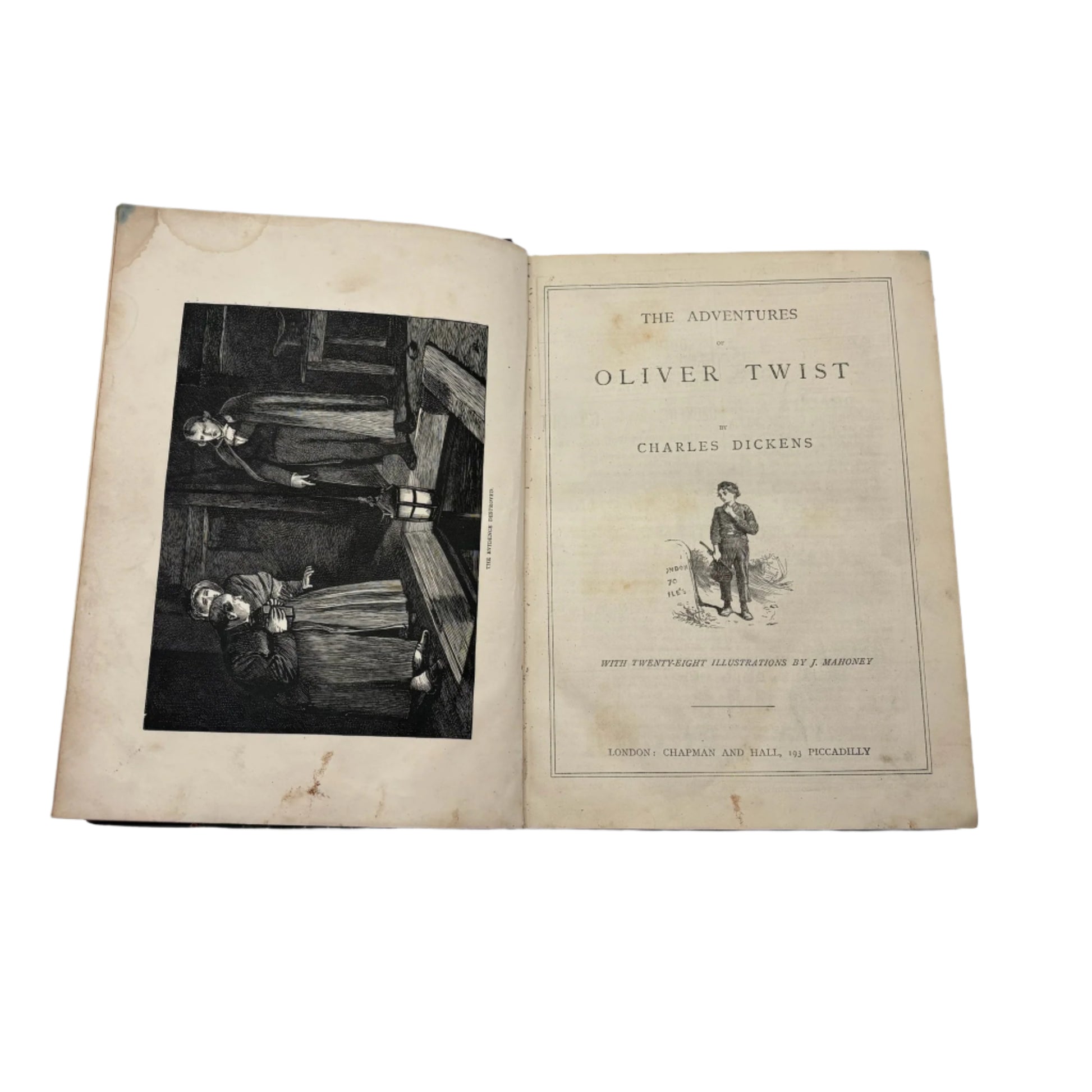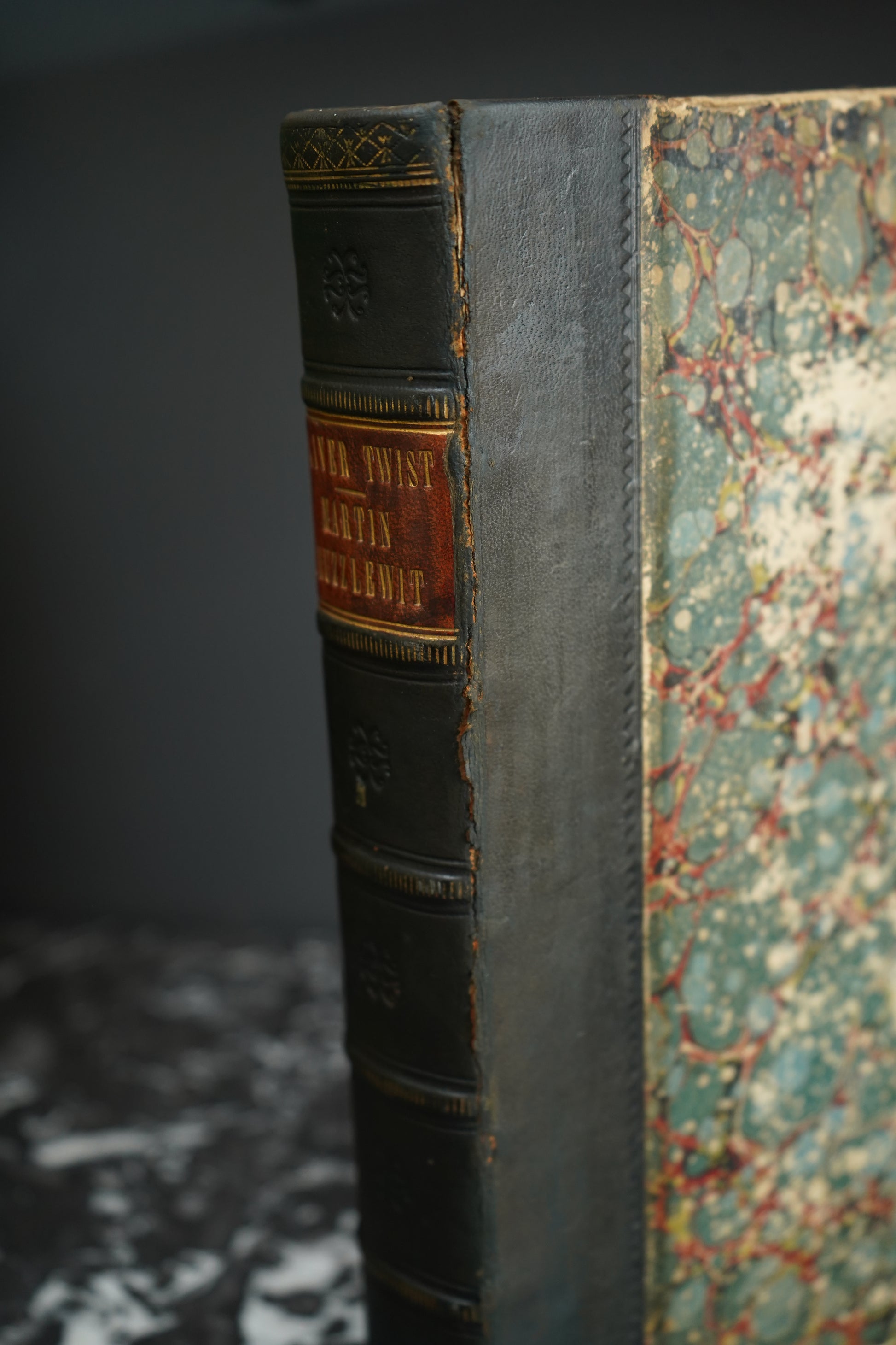 This antique Victorian edition brings together two of Charles Dickens’s most iconic novels, Oliver Twist and Martin Chuzzlewit, in a single beautifully aged volume. Published by Chapman and Hall in the late nineteenth century, this edition features twenty eight detailed illustrations by J. Mahoney that bring Dickens’s characters and dramatic scenes to life. The book is bound in an attractive half calf leather binding with marbled boards, raised bands, gilt accents, and a bold red title label on the spine. It was expertly bound by Maxwell and Miller of London, whose bindery stamp appears on the endpaper. Inside, readers will find the full text of both novels, including the unforgettable story of Oliver’s escape from the workhouse and Martin’s comic journey of self discovery across England and America. This volume is perfect for collectors who appreciate Victorian craftsmanship as well as those who love decorating with classic leather bound books. The combination of its illustrated pages, handsome nineteenth century binding, and the pairing of two beloved Dickens stories makes this a memorable display piece with lasting literary charm.Condition: