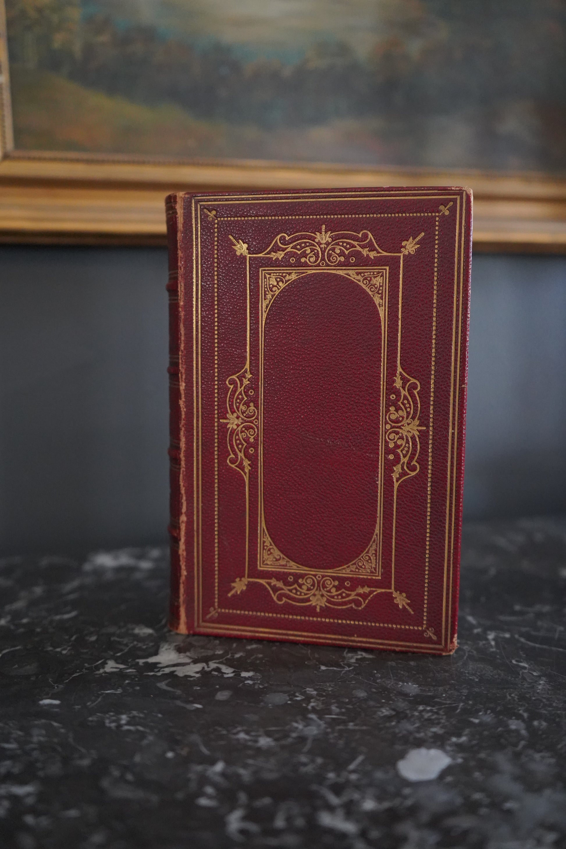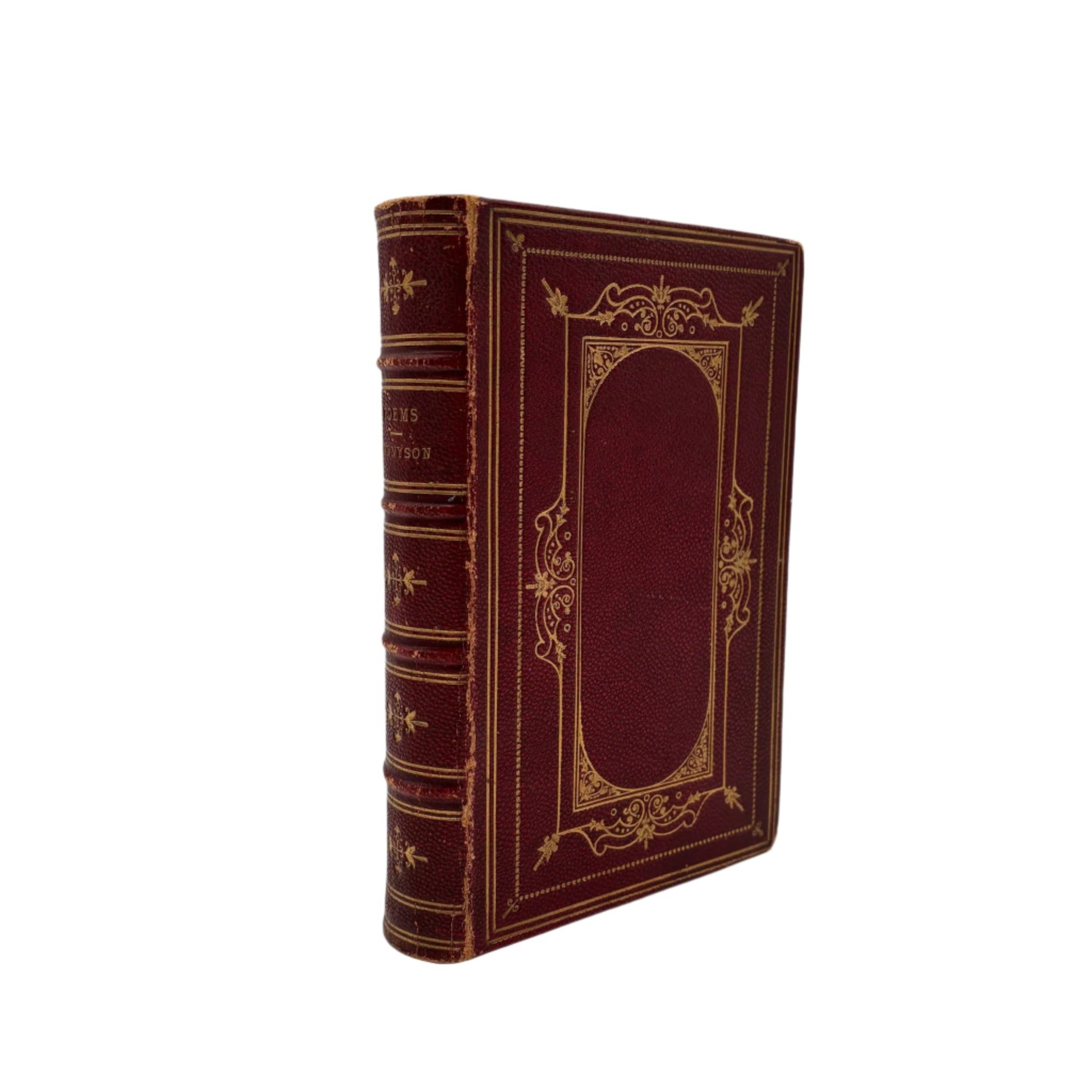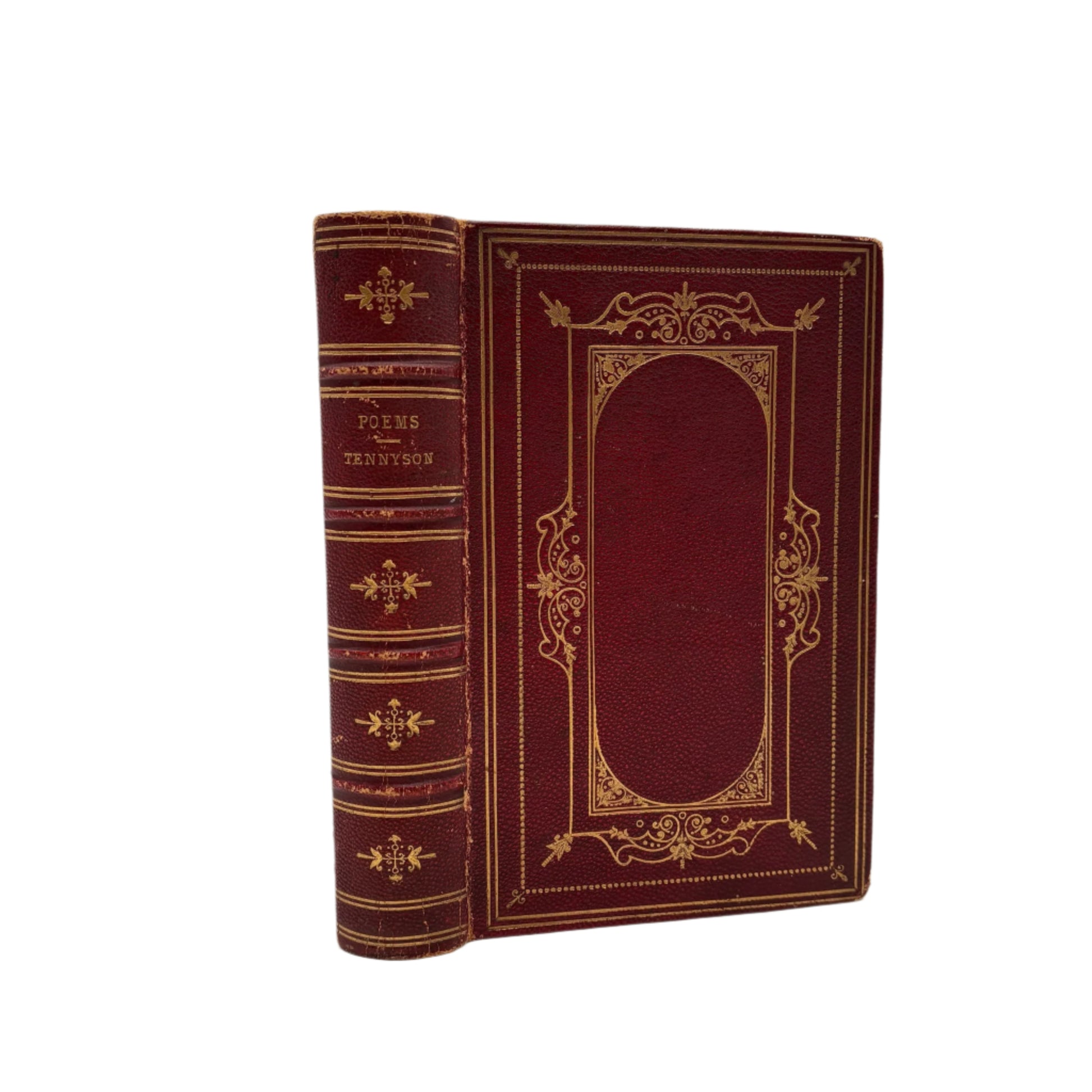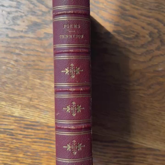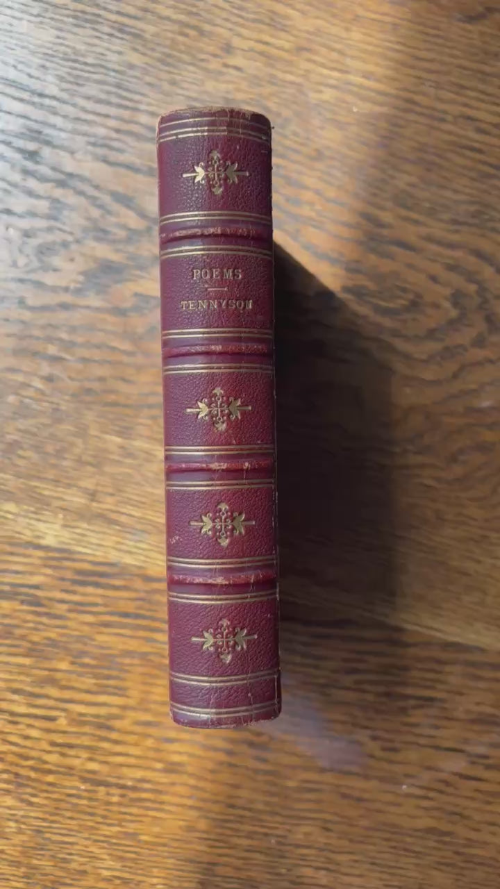 This treasured 1875 edition of Alfred Tennyson's Poems, published by Henry S. King & Co. in London, showcases the Victorian poet laureate's most celebrated works in one elegant volume. From his enchanting early verses to the solemn beauty of "In Memoriam" and stirring patriotic pieces, this collection captures Tennyson at the height of his literary powers during an era of empire and profound social change. The book itself is a work of art, bound in rich oxblood morocco with intricate gilt tooling featuring an ornate oval frame of acanthus leaves and scrollwork, complemented by delicate floral details on the spine's raised bands. Gilt-edged pages and dentelle tooling on the inner boards suggest the craftsmanship of a premier London bindery. A charming inscription on the front endpaper, "Etta Fraser, with Flo's love. April 1896," adds authentic Victorian provenance and speaks to the personal connections these volumes once held. A remarkable keepsake for literature lovers and collectors of fine antique books.