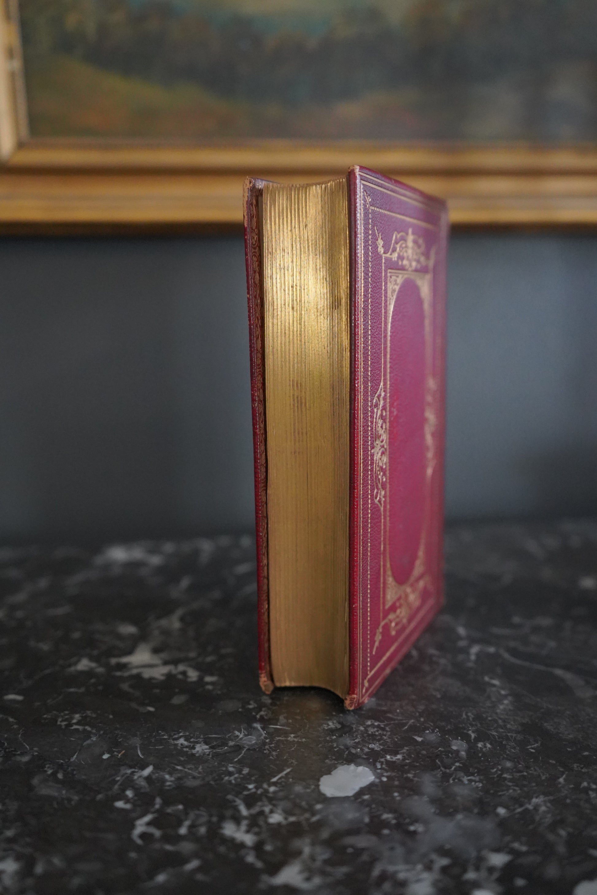 The boards are firmly attached and the hinges tight, though the headcaps and corners show light rubbing and the spine ridges exhibit minor chafing where gilt has thinned. The cover gilt is still bright, and the all-around gilt edges have mellowed to a soft, inviting burnish. Internally, foxing is confined to the front flyleaf and a few early leaves, especially around the charming gift inscription, but the gatherings are crisp and complete.