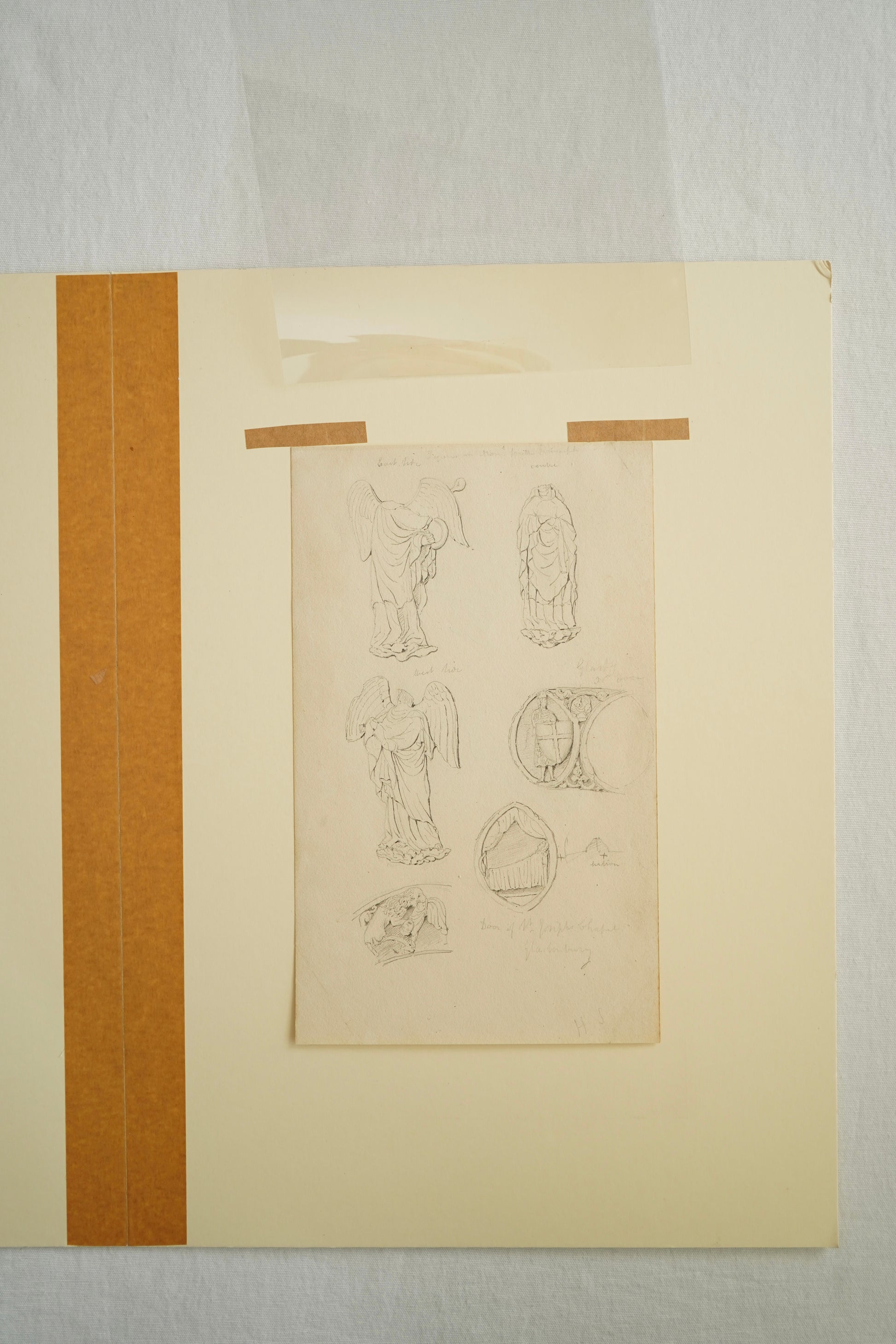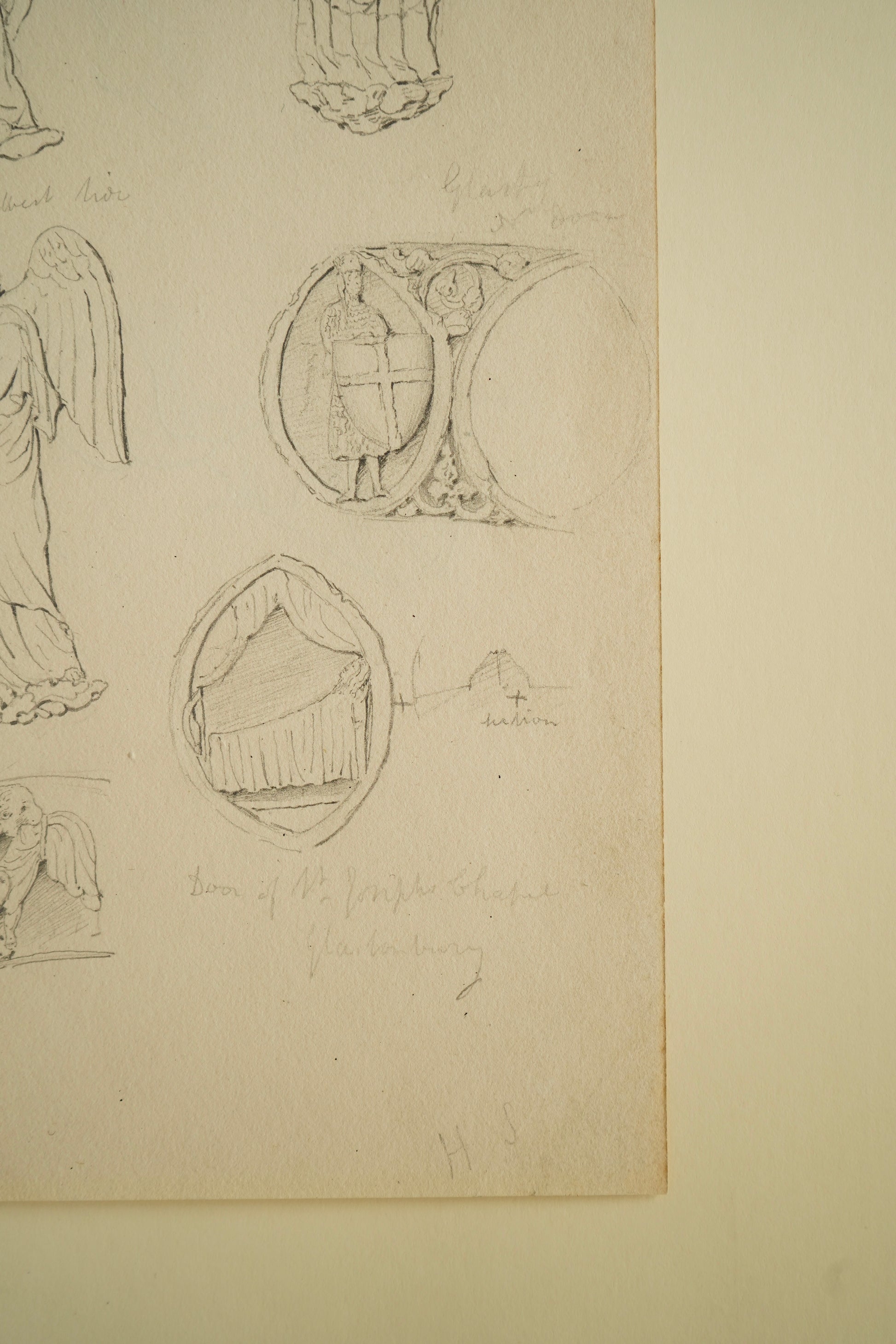 Rendered in graphite on laid paper, this large-format study showcases multiple finely drawn angelic figures, architectural medallions, and Gothic ornament — all likely inspired by carvings from a chapel at Glastonbury Abbey. The composition includes draped angel effigies, a carved canopy, heraldic shields, and sculptural fragments, meticulously recorded in Shaw’s precise, archaeological style.