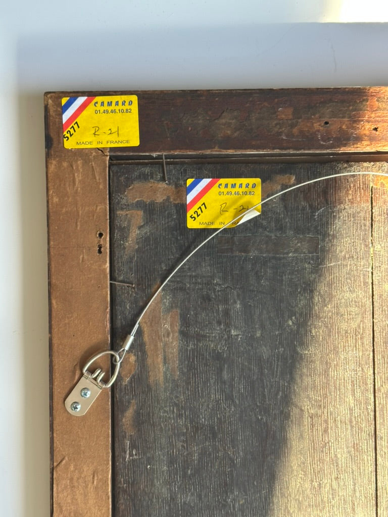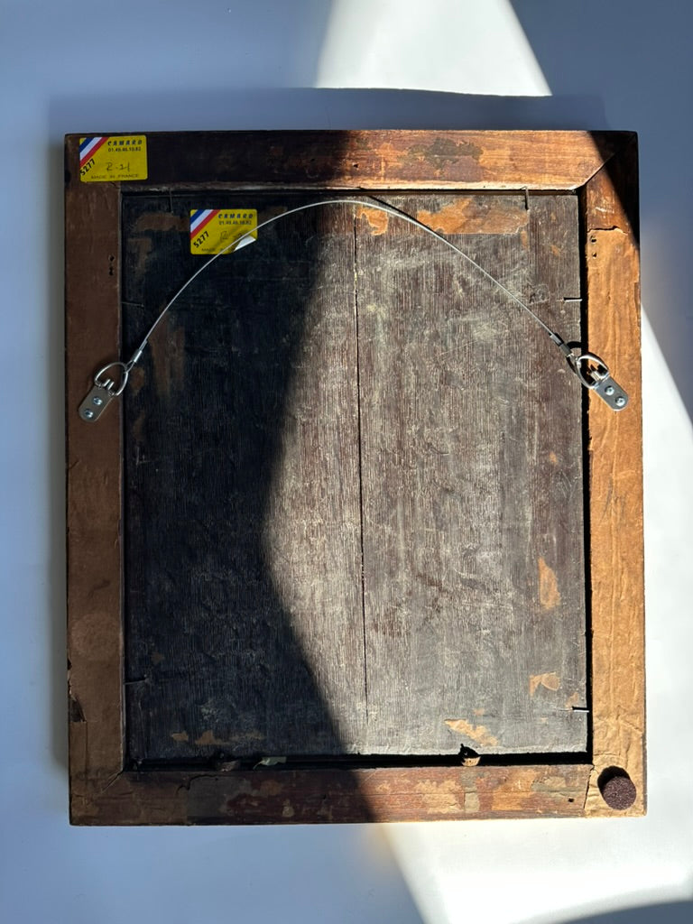 Overall good condition, with minor signs of aging consistent with its period. The oil on board surface remains stable, though some areas show craquelure, particularly in the darker tones. The varnish has slightly darkened over time, subtly muting the contrast, but the colors still retain their warmth. The board is structurally sound with no visible warping or significant damage. The gilded frame complements the piece well but is missing a decorative element on the top edge, which is noticeable upon close inspection. The back of the painting retains its original structure, with old labels suggesting past ownership or restoration. No active paint loss or flaking is present, making this a well-preserved and display-ready artwork despite minor imperfections.
