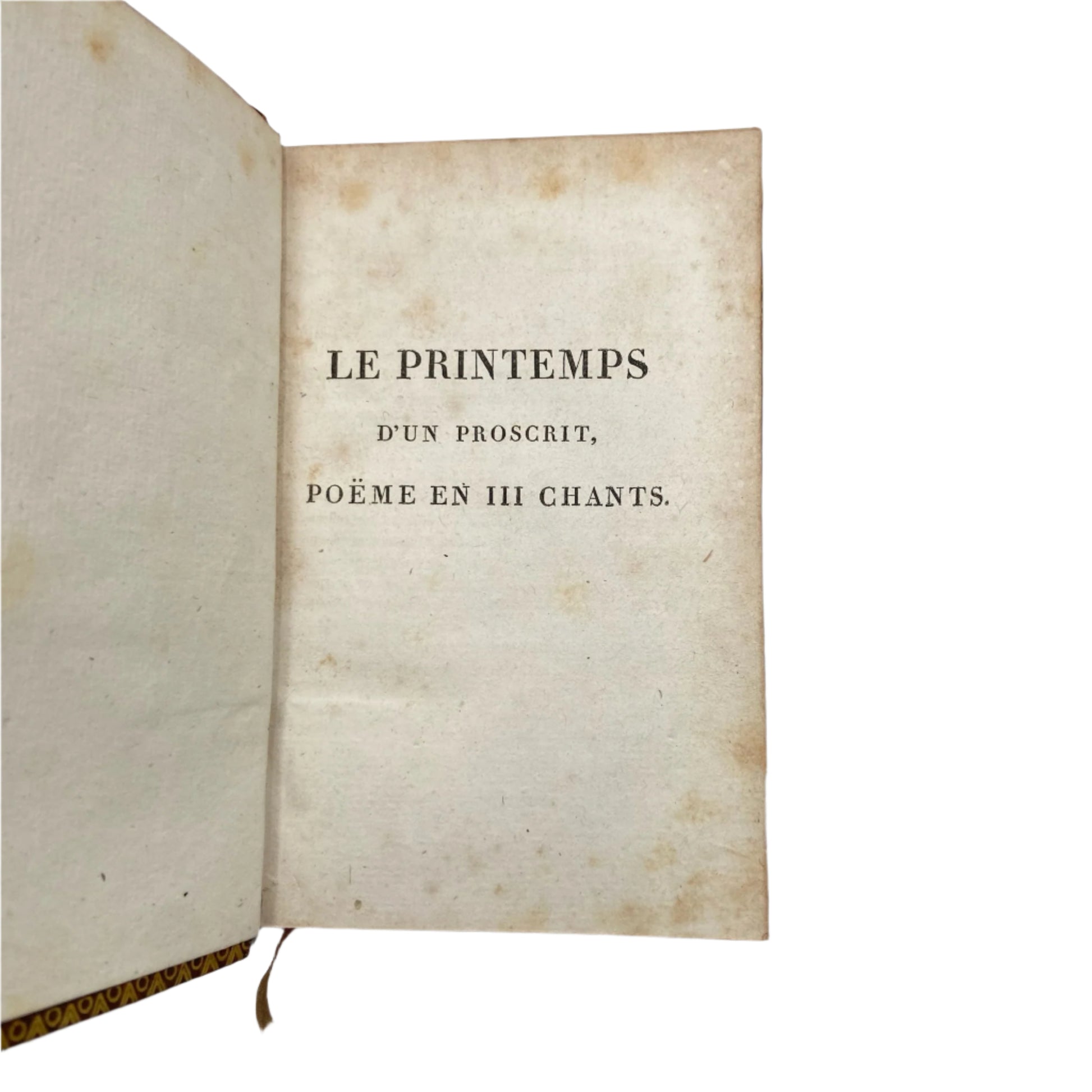 This antique 1803 French poetry book, Le Printemps d’un Proscrit by Joseph Michaud, is a powerful literary reflection on exile, compassion, and redemption written in the aftermath of the French Revolution. Bound in richly mottled calf leather with elegant gilt tooling and a dark green spine label, this early 19th-century edition features a vibrant hand-marbled endpaper design in shades of pink, green, yellow, and black. Gilt page edges add a luxurious finishing touch, and a silk ribbon marker still remains tucked inside. The poem, presented in three moving cantos, is followed by a series of philosophical letters on pity, addressed to the poet Delille. First published during France’s Napoleonic rise, this edition captures a deeply personal and historical moment, blending poetic beauty with emotional and political weight. Ideal for collectors of antique French books, poetry lovers, or anyone seeking a character-rich decorative volume with literary depth.