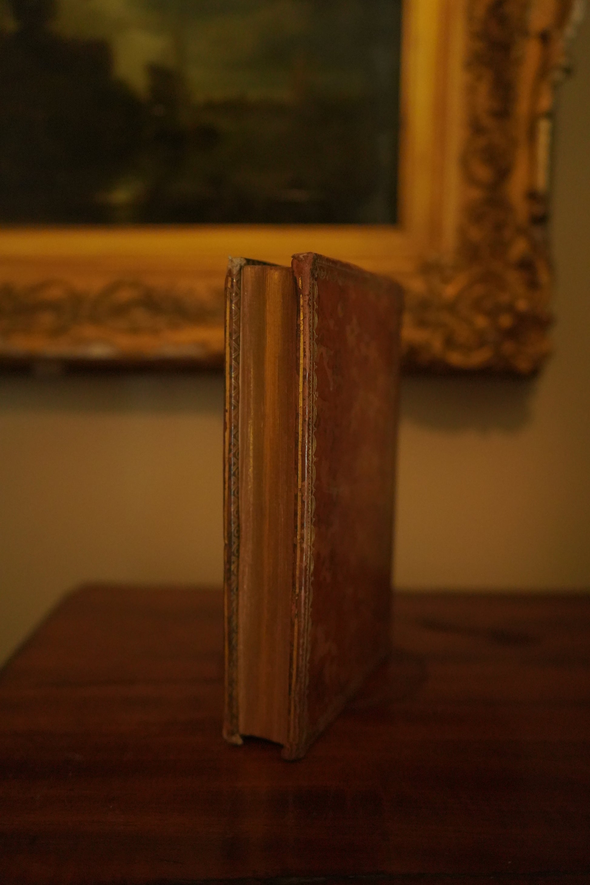 This early 1800s volume is in good condition for its age with expected wear to the binding. The calf leather cover shows some rubbing and flaking, especially to the joints and head of the spine where a small loss is present. Corners are softened and worn. The binding remains firm overall, with both boards still attached. The marbled endpapers are bright and intact, and the interior pages are complete with moderate foxing and age toning throughout. The silk ribbon marker is still attached, though it is fragile and partially frayed. Gilt page edges remain beautifully bright, and the engraved frontispiece is well preserved.