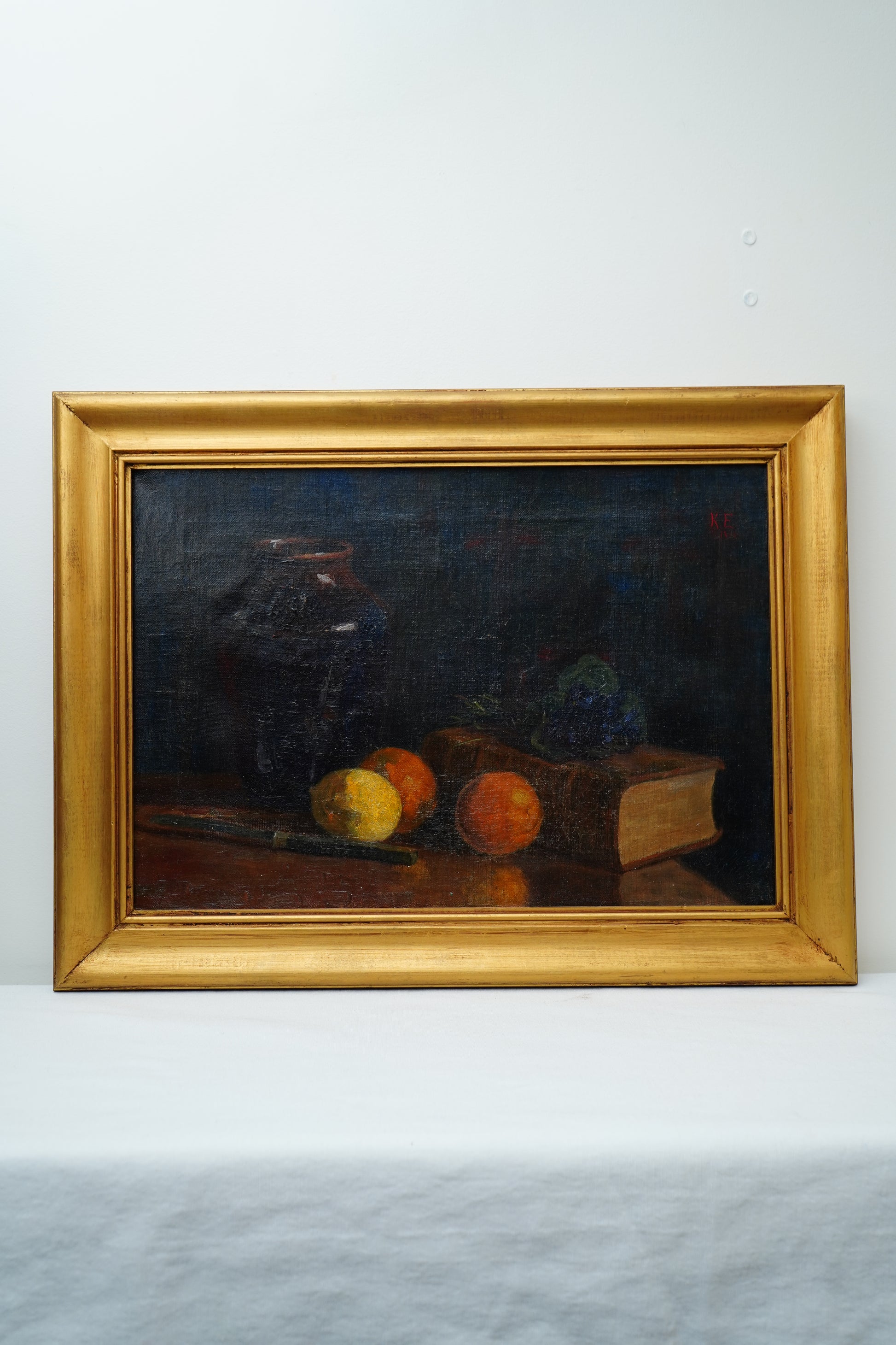 Antique 1905 Oil Painting Still Life with Fruit, Book & Earthenware Jar | Signed K.E.