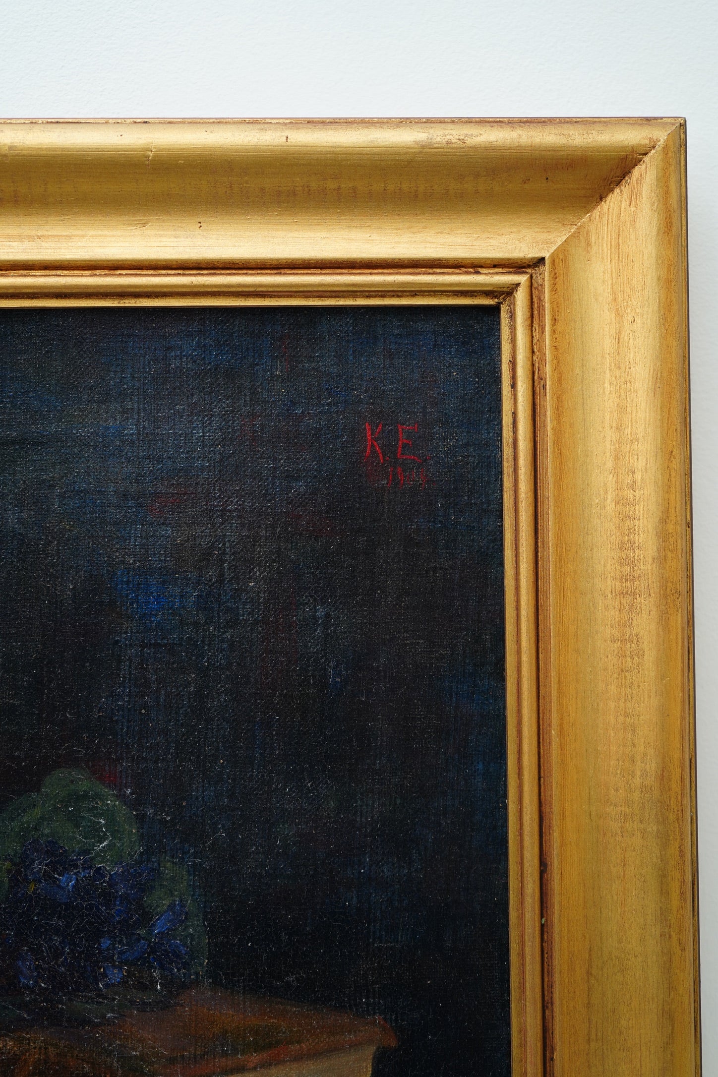 Clearly monogrammed “K.E.” in red with the date 1905 (possibly 1909) beneath. Monogram signatures were common in continental Europe (particularly German, Scandinavian, and Nordic painters).