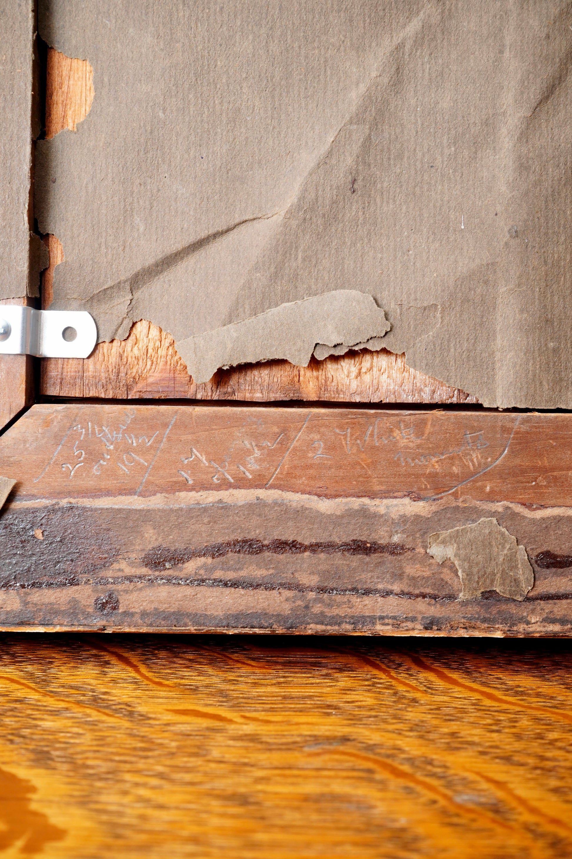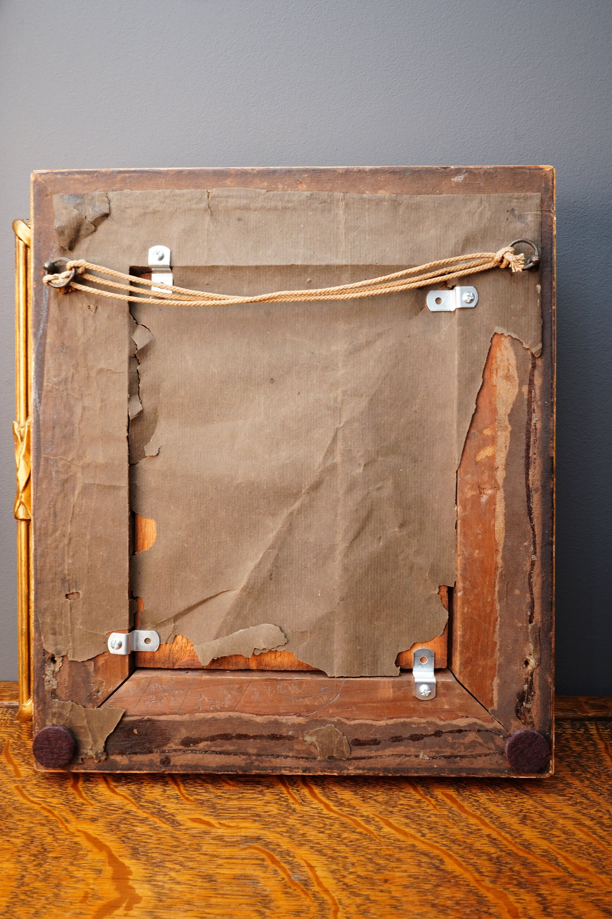 Antique condition consistent with age. The gilt frame shows surface wear, rubbing, and scattered losses to the finish, most visible at edges and corners, which presents as an attractive patina. The reverse retains an older paper dust cover that is torn and lifting in areas. Later hanging hardware is present and the piece is ready to hang. Pencil framing notes are visible to the back, likely workshop measurements and mount notation from a prior framing. Glass shows light reflections in photographs; please expect minor age appropriate handling wear.