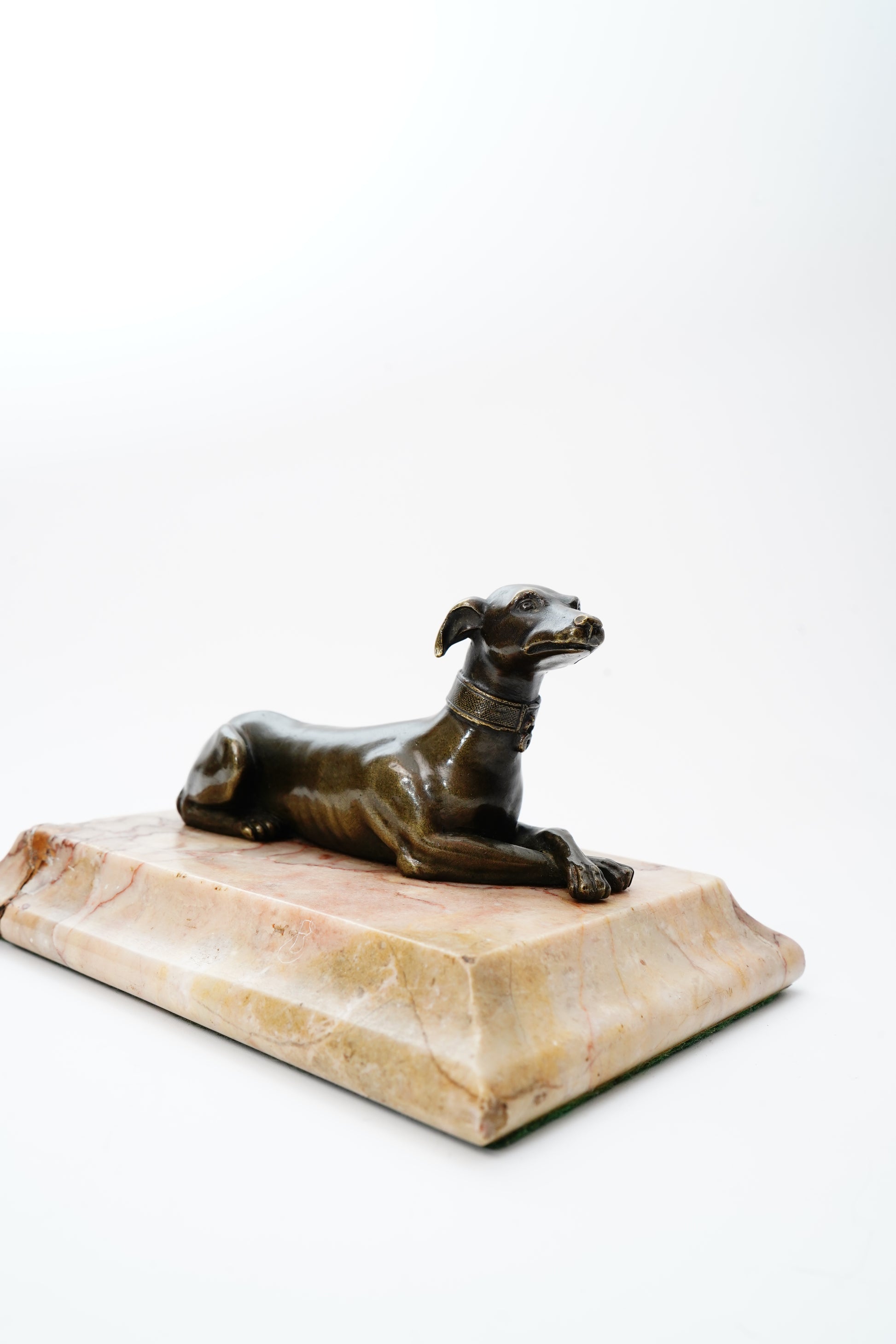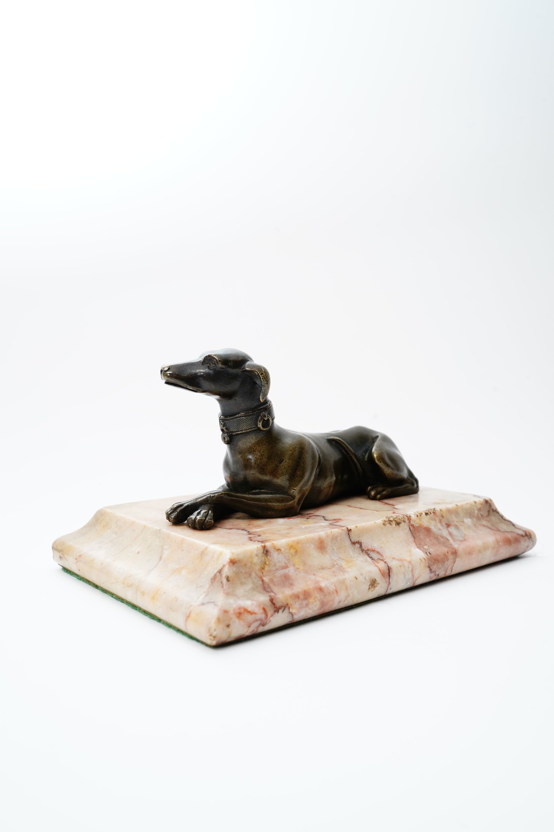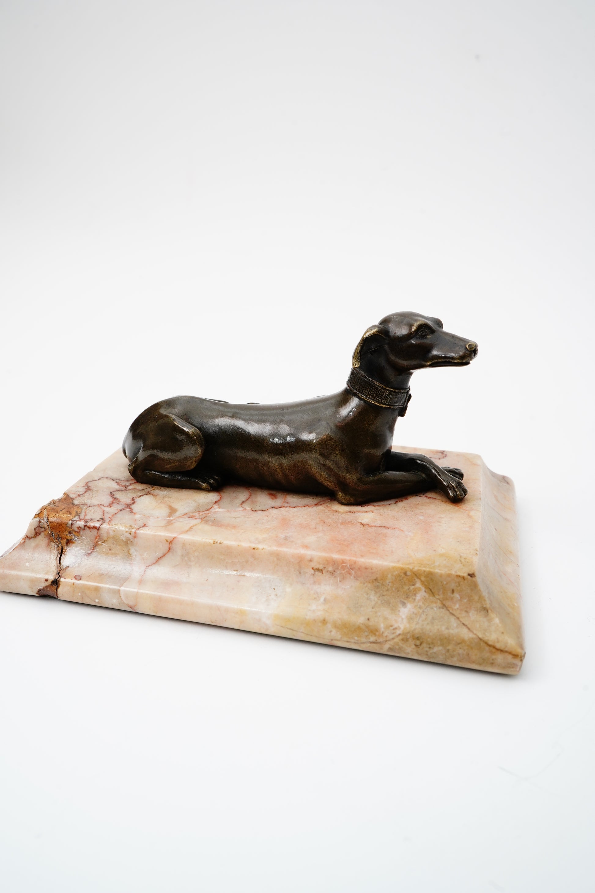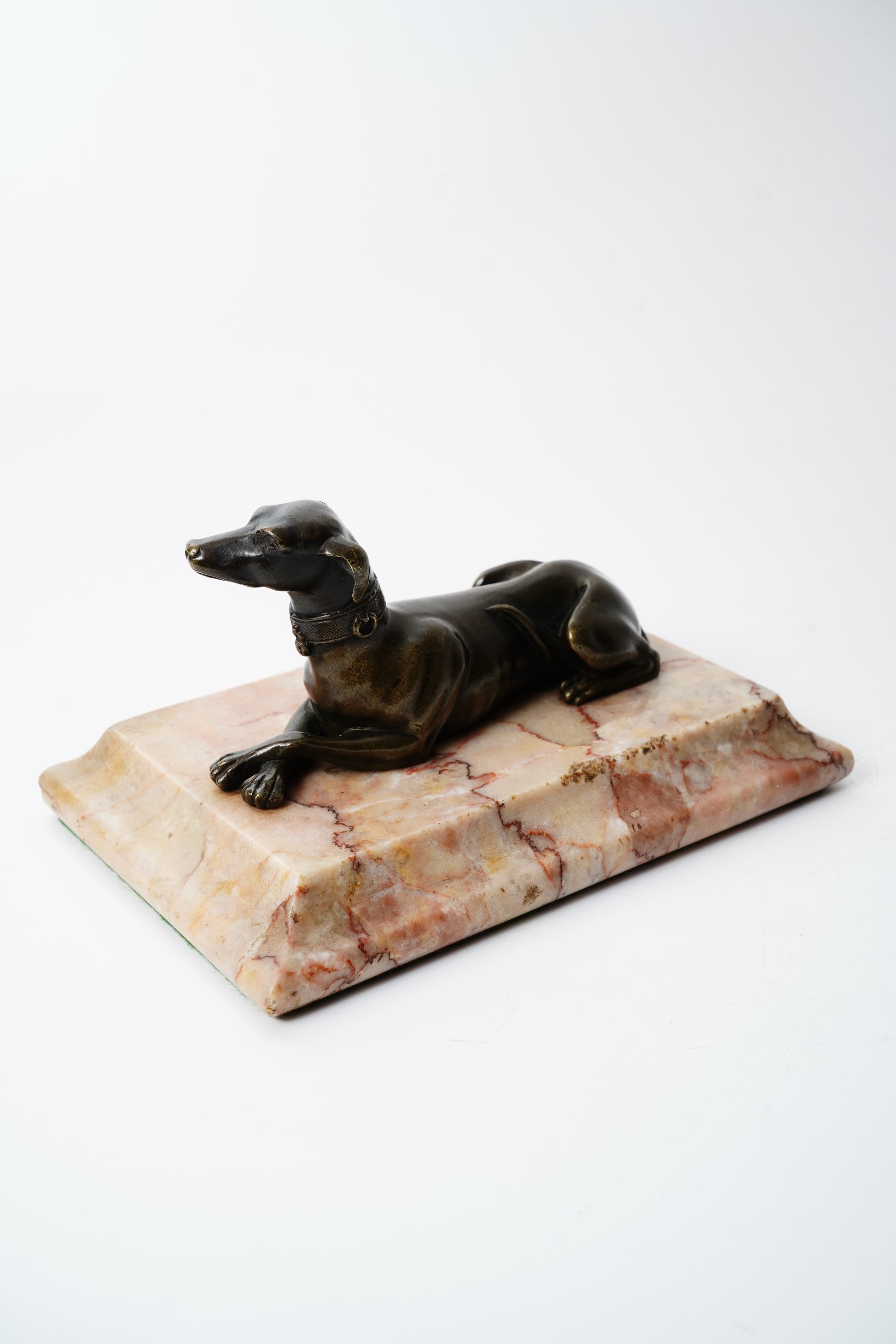 A handsome antique bronze greyhound, cast in a relaxed reclining pose and mounted on a warm veined marble base. Originally made as a desk paperweight, this piece has the kind of quiet, collected charm you see in old libraries and English country-house studies. The sleek hound form and rich aged patina give it a timeless look for book stacks, office styling, or a refined vignette on a console.