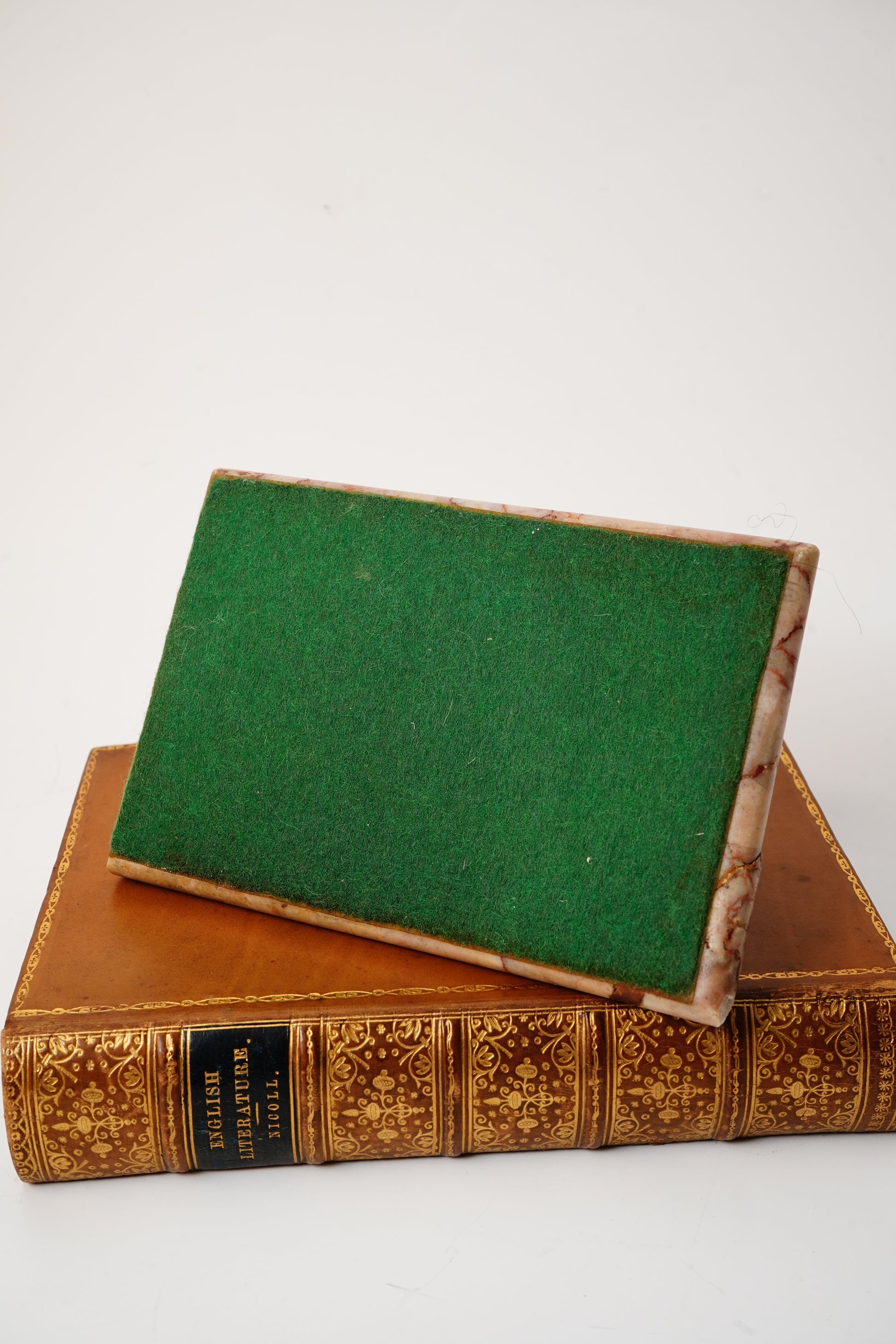 Antique condition with age-appropriate wear. There is a significant repaired chip to one corner of the marble base, visible on close inspection. Bronze shows light rubbing to the patina at high points, consistent with handling over time. Green felt underside present with minor wear.