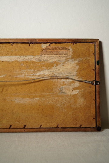 Very good antique condition for age. The embroidery remains finely preserved with threads bright and intact. The silk ground shows slight tonal variation and scattered age spotting typical of early textiles. Frame retains its original gilding with minor surface wear and small corner nicks. Glass is intact with light interior dust consistent with age. The newspaper-lined backboard, tacked with original wire brads, remains stable and historically informative.
