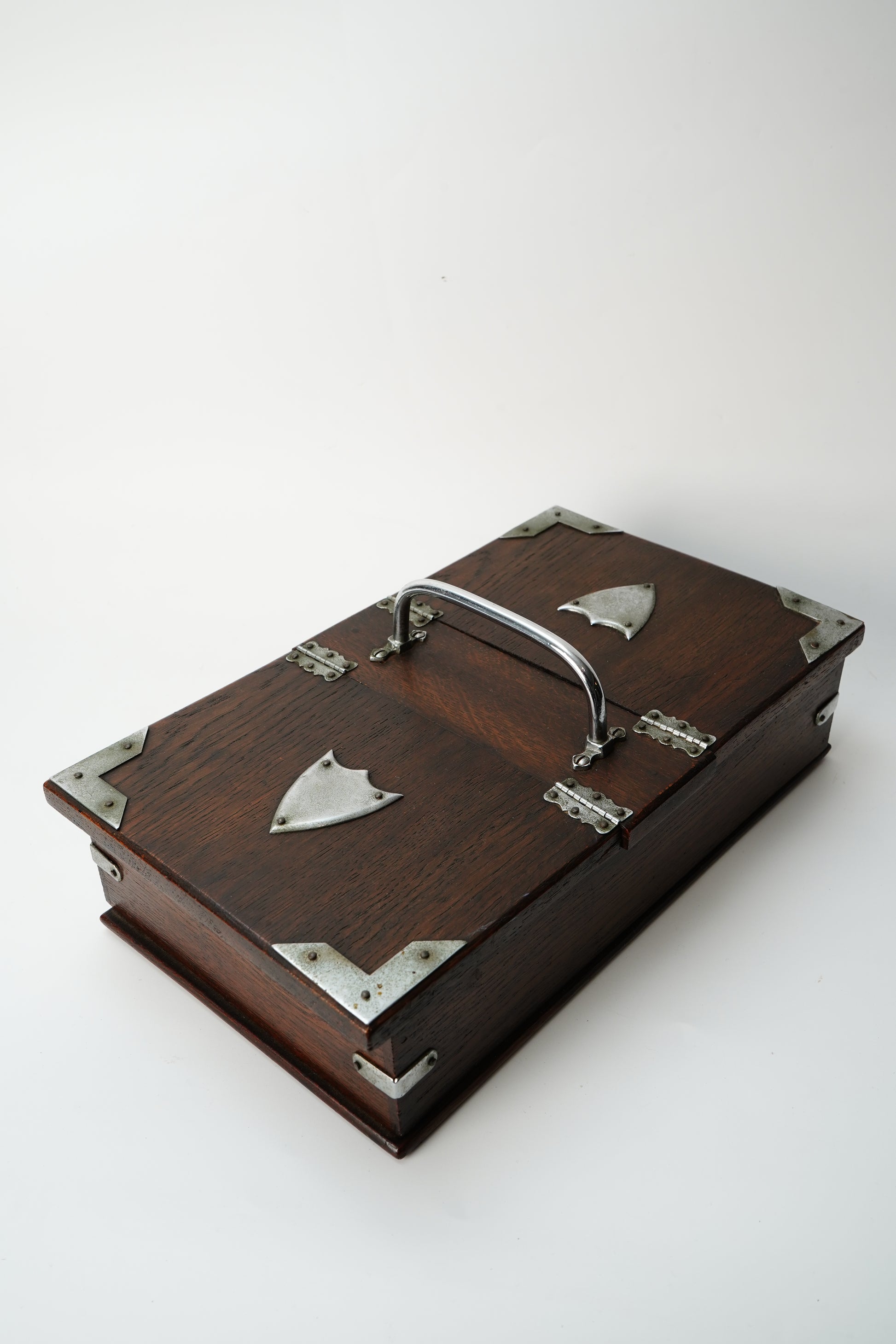 Good antique condition with expected surface wear to the oak and light patina to the silver-plated mounts. One hinge is slightly loose but remains functional; the other fittings and handle are secure. Interior is clean and well preserved.