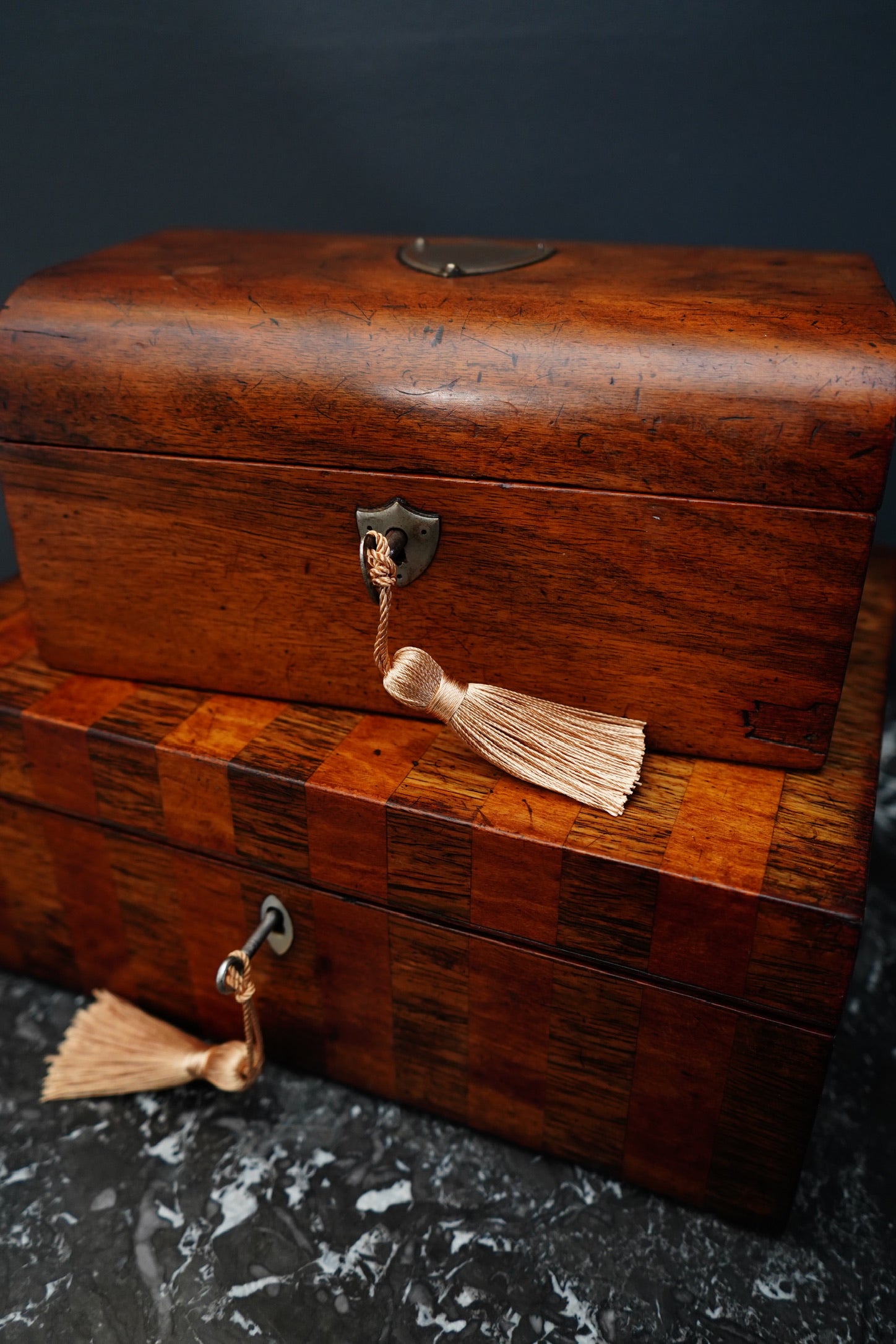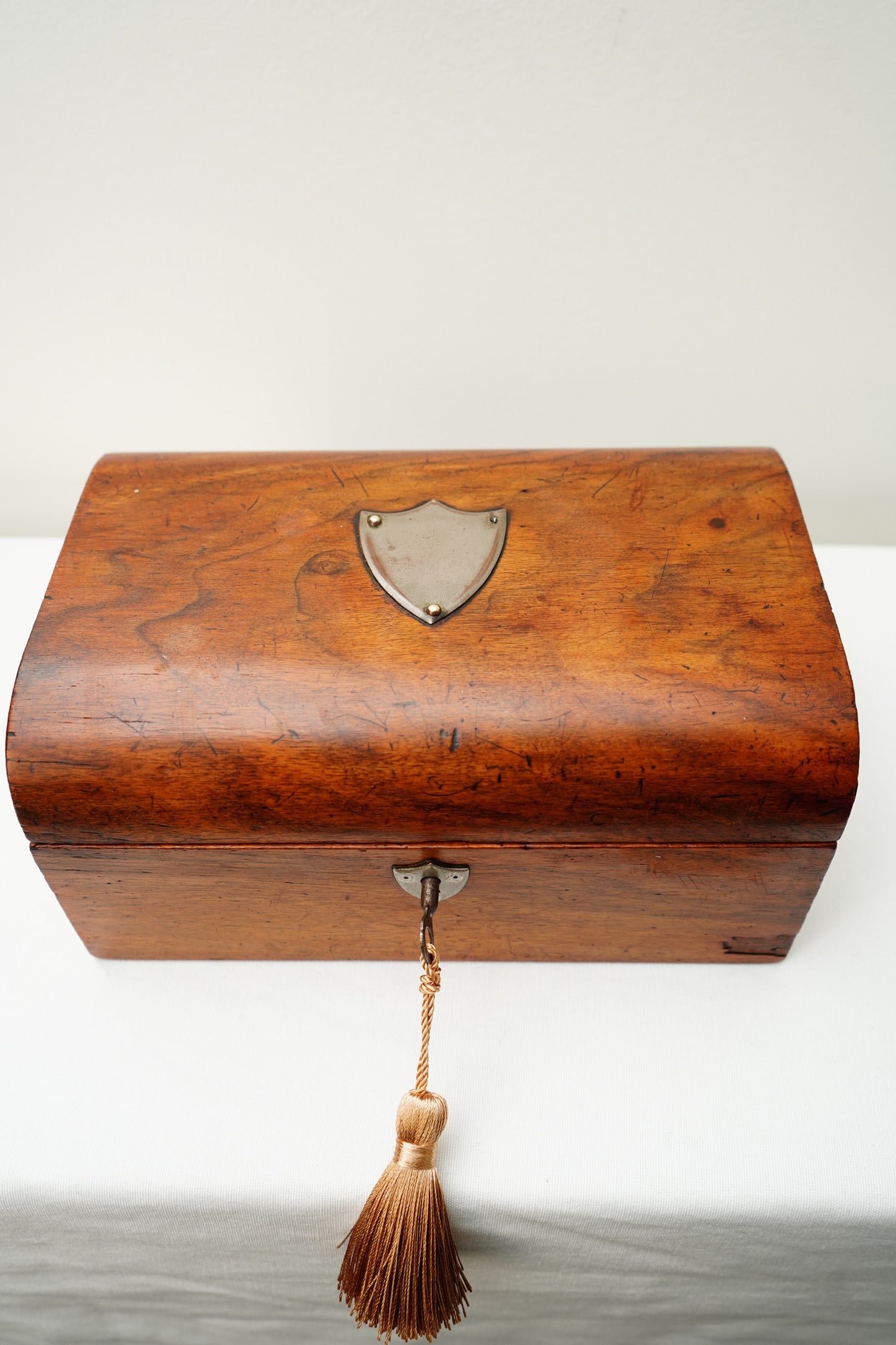 Antique English Dome-Top Walnut Veneer Jewelry or Stationery Box with Key, c. 1880–1910