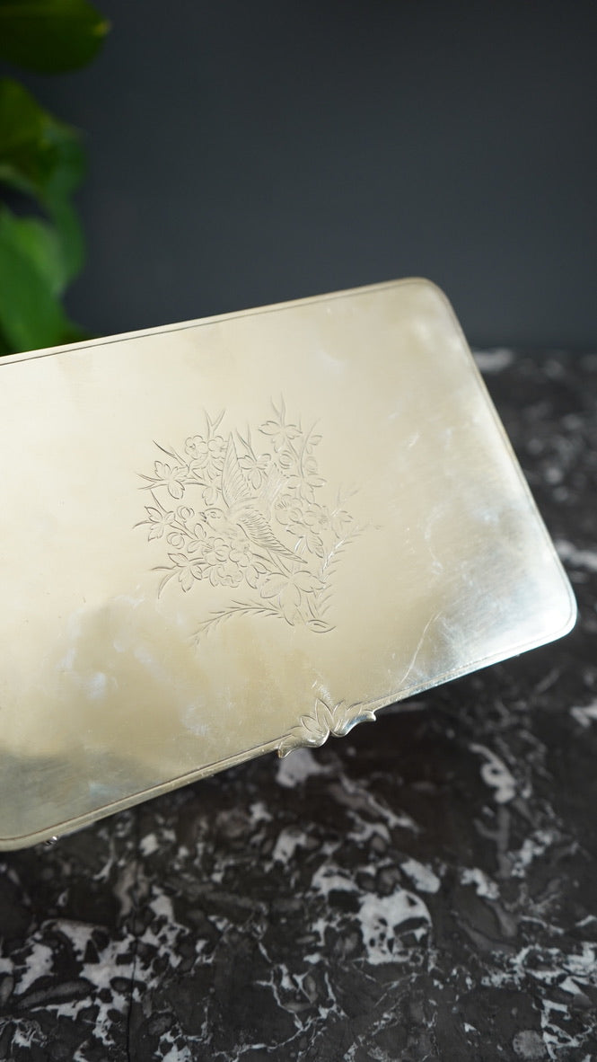 Good antique condition with expected surface wear to the silver-plate and oxidation to the tin lining. The lock mechanism has shifted slightly, preventing the key from functioning, and one inner lid sits slightly raised. These details are consistent with the age and use of the piece.