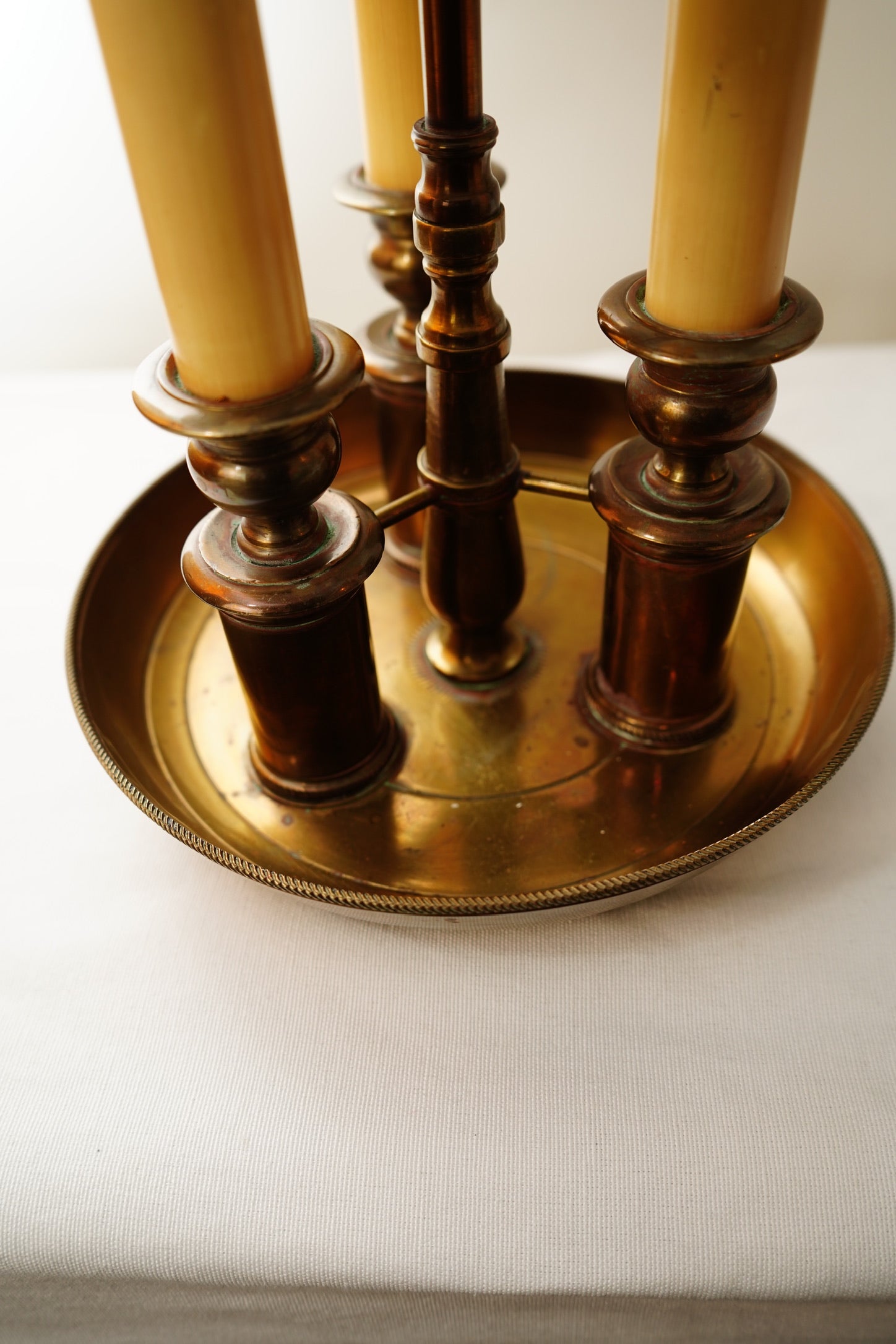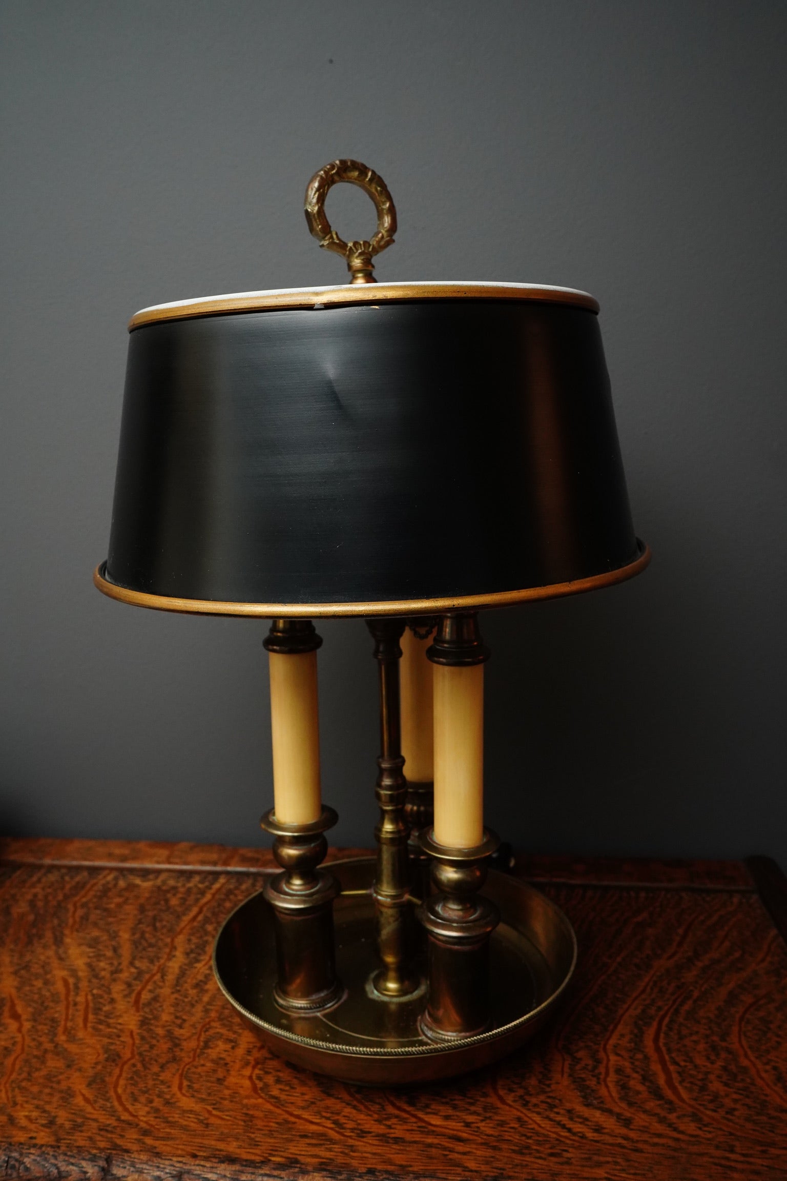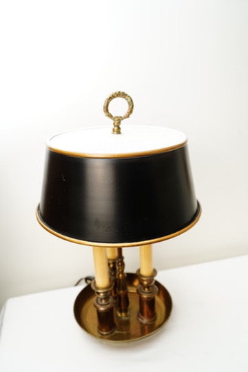 Classic French bouillotte form with three candle-style lights, a warm brass tone, and a black tole shade with gilt trim for that tailored, library-at-dusk glow. It reads instantly collected on a desk, console, or bedside table, and gives off the kind of moody, layered light that makes a space feel finished without trying too hard.