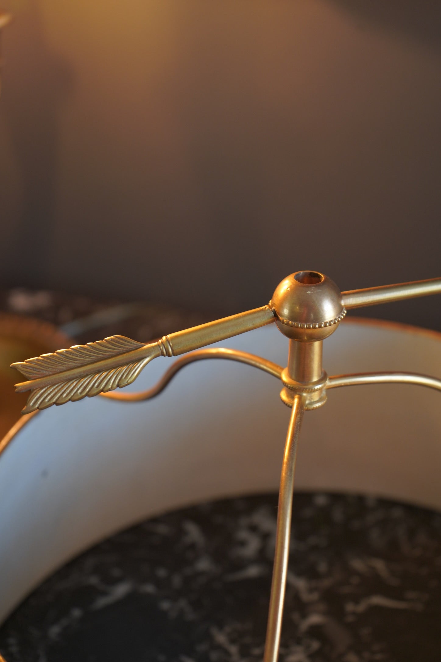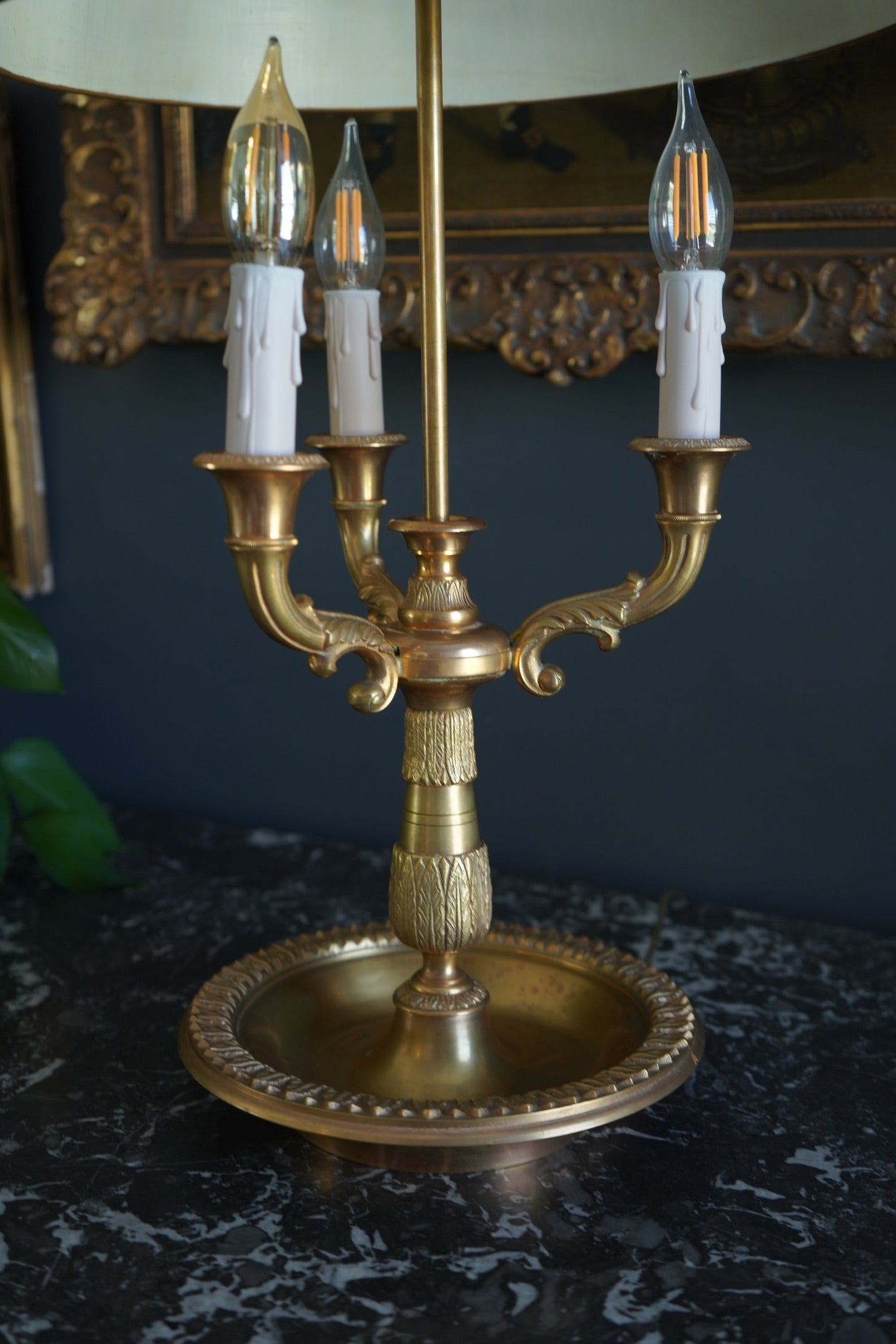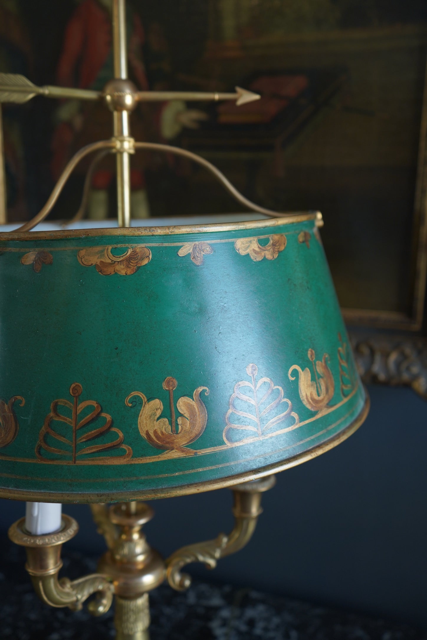 This antique French bouillotte lamp captures the timeless elegance of neoclassical design. First created in the late 18th century to illuminate the French card game bouillotte, these lamps became a symbol of refinement in both function and style. This early 20th-century example (c.1920–1940) is crafted of gilt bronze or a heavy brass-bronze mix, giving it a substantial weight and presence. The lamp features three scrolling candelabra arms with classical acanthus details and a laurel-bordered base. Its original green tole shade is hand-painted with gold stylized floral and foliate motifs, and the adjustable arrow finial allows the shade to move up or down in the traditional bouillotte manner. Collectible for both its craftsmanship and decorative appeal, this lamp brings a sense of French sophistication to any interior.