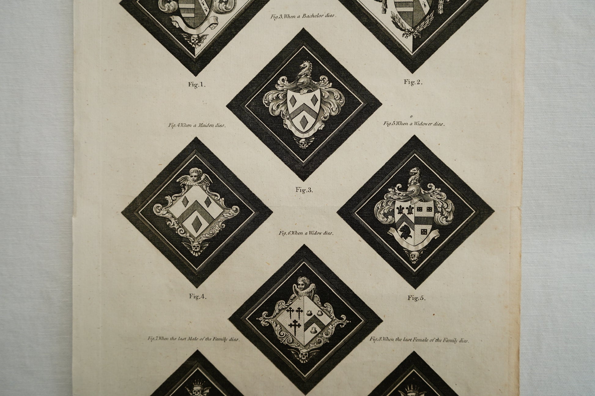 This is the kind of graphic, symbol rich reference print that would have lived inside a Georgian era heraldry volume, made for readers who wanted to understand the visual language of lineage, marriage, and remembrance. The crisp black lozenges, ornate mantling, and subtle memento mori touches give it real presence on a wall, equal parts scholarly and gothic, and a perfect piece for libraries, studies, and layered gallery walls.