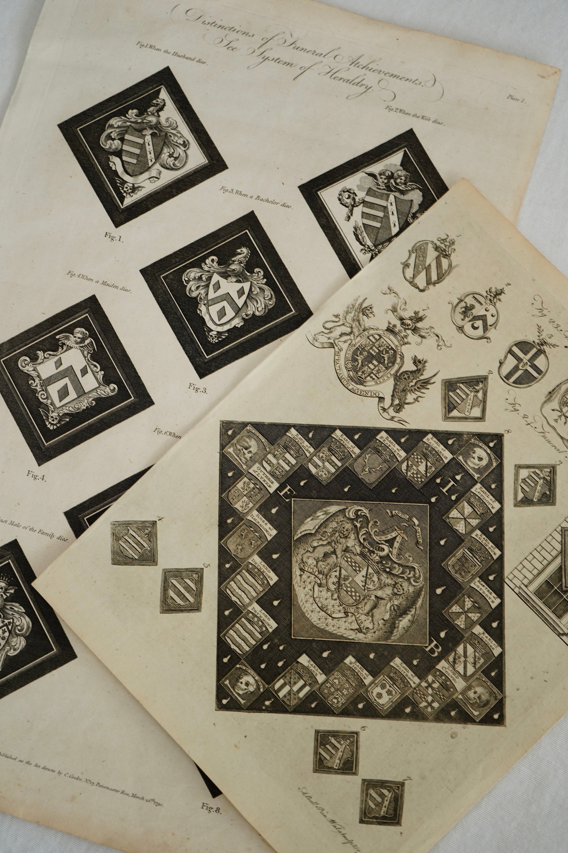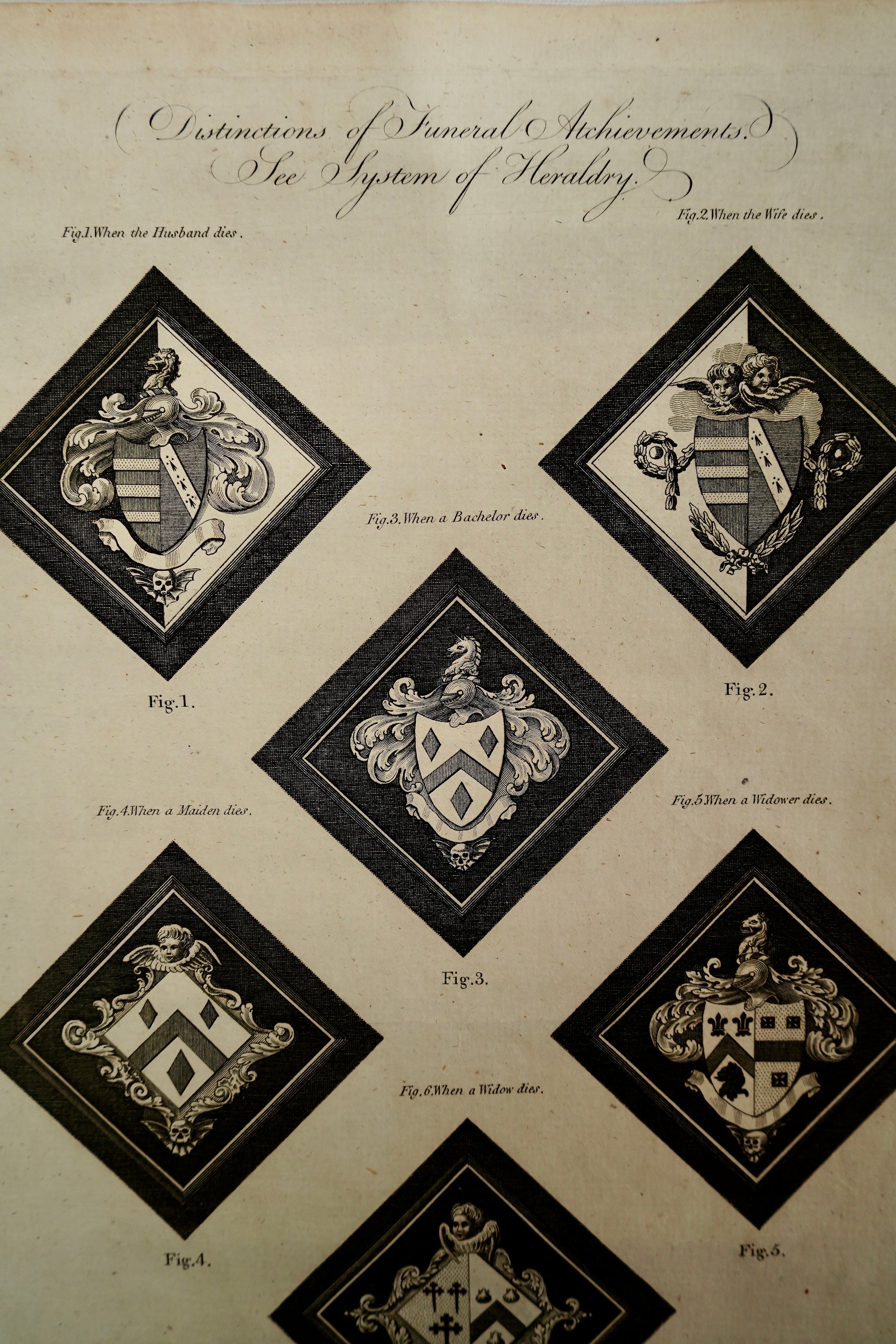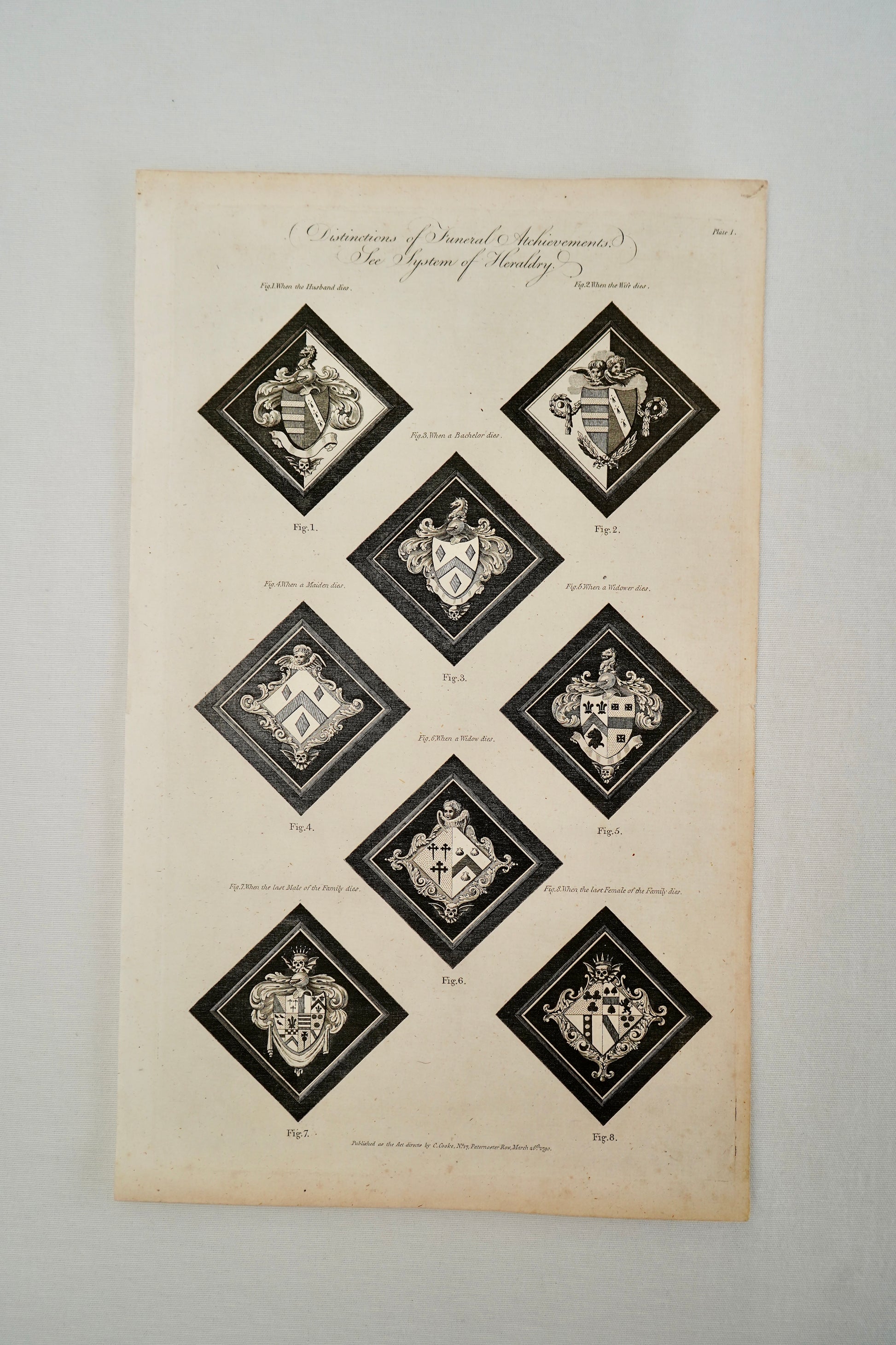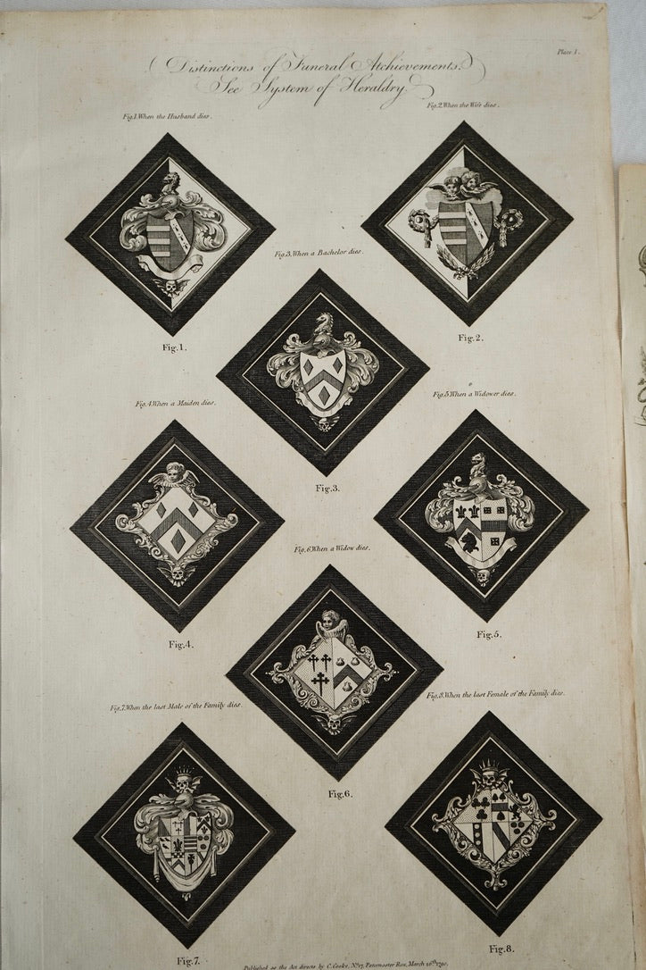 A striking late 18th century English copperplate engraving illustrating the rules of heraldic mourning, titled “Distinctions of Funeral Achievements. See System of Heraldry. Plate 1.” The plate presents eight diamond format examples of funeral achievements, commonly known as hatchments, showing how arms were displayed in mourning depending on status and circumstance, including when the husband dies, when the wife dies, bachelor, maiden, widow, and the last male or last female of a family line.