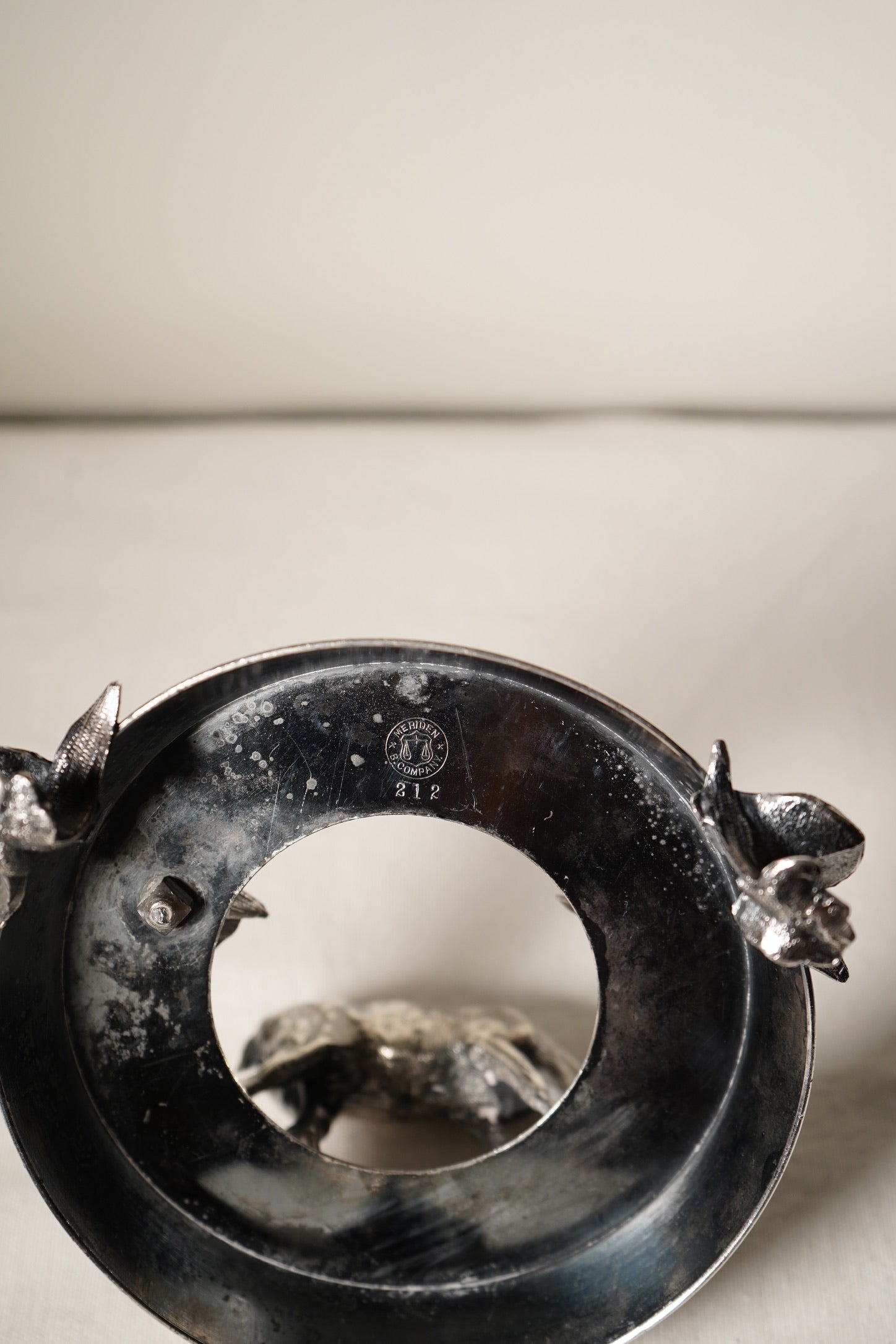 The underside is stamped Meridian B Company along with the model number 212, confirming its American origin and placing its production between 1880 and the company’s absorption into International Silver in 1898. Today the piece displays beautifully as a sculptural object, a standalone decorative accent, or as a holder for a modern glass insert. It brings heritage, charm, and a touch of whimsy to a bar tray, desk, vanity, or styling vignette.