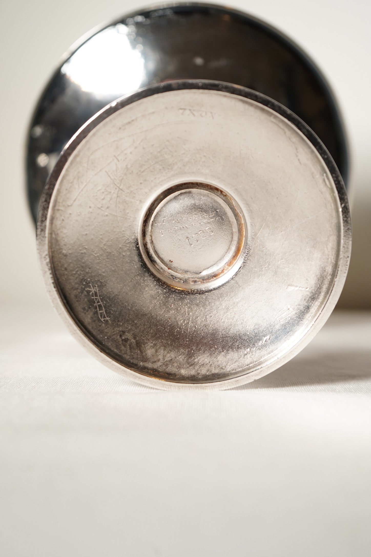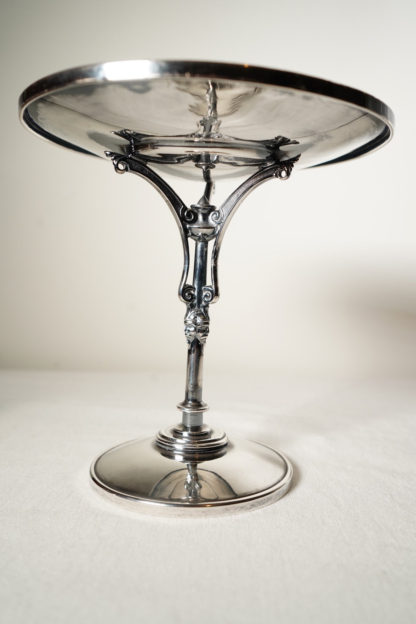 This late-19th-century Meriden silverplate tazza shows expected antique wear. There is gentle bending to the rim, normal surface scratches, and some soft dimpling in the metal from use. The silverplate exhibits patina throughout, and the pedestal metal is characteristically soft with minor signs of age. The piece remains structurally stable, with all three supports intact and beautifully detailed. Presents very well overall with authentic late-Victorian character.