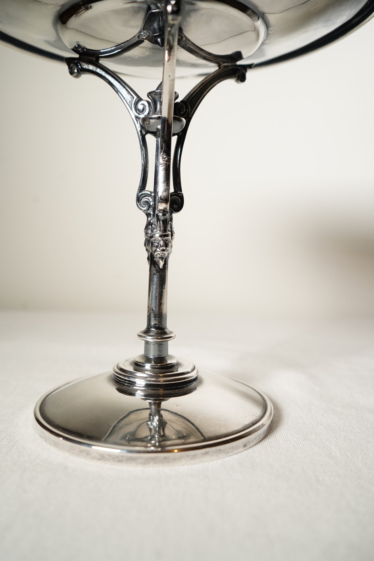 This is an original late-19th-century Aesthetic Movement silverplate tazza made by the Meriden Britannia Company of Connecticut, one of the most respected American silver manufacturers of the era. Produced between 1885 and 1895, the piece embodies the height of Aesthetic design with its sculptural tri-form supports, classical mask motif on the stem, and delicately etched botanical decoration on the dish. Tazzas like this were created as artistic centerpieces for Victorian dining tables and were often used to present fruits, sweets, or small floral arrangements. Its tall silhouette and architectural lines give it a striking presence, making it an elegant accent for modern styling as well.