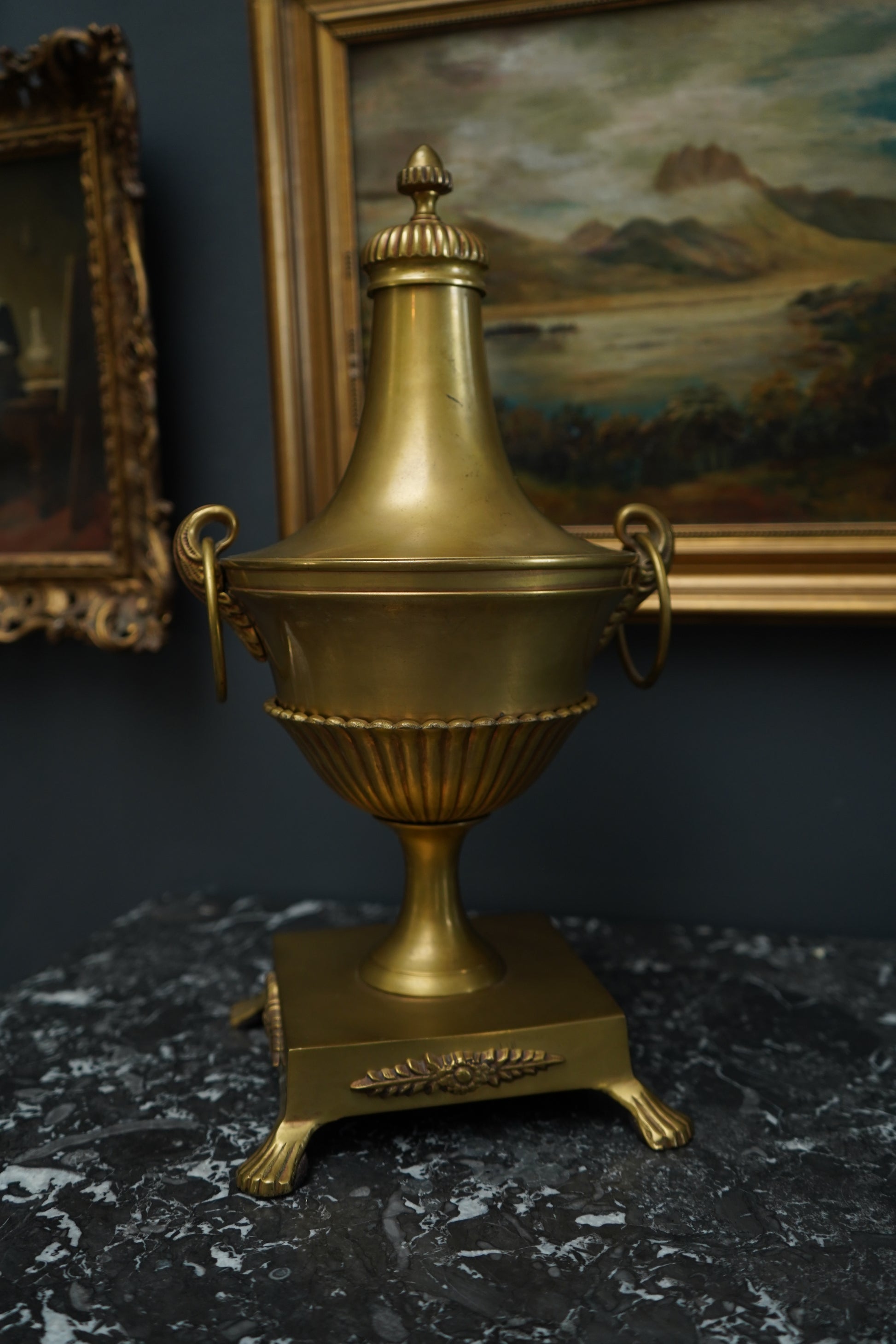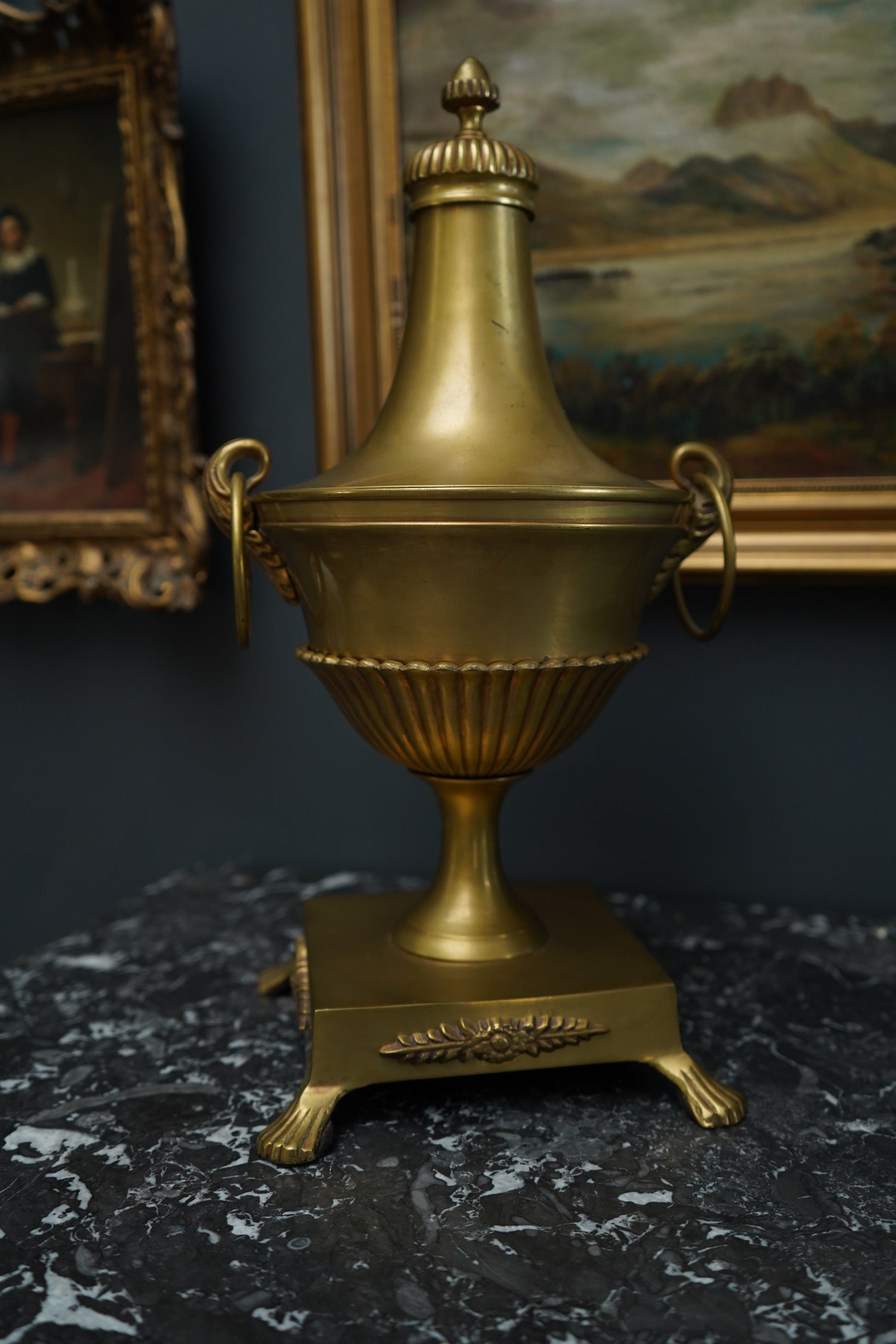 This antique brass urn captures the elegance of Neoclassical design, dating from the late 19th century. The urn is richly detailed with a tall, lidded body rising from a square plinth base supported by paw feet. Applied laurel and floral garlands adorn the sides, while ring handles with foliate mounts recall classical Greco-Roman ceremonial vessels. The lid is finished with a ribbed knop finial, giving the piece a sense of symmetry and grandeur.