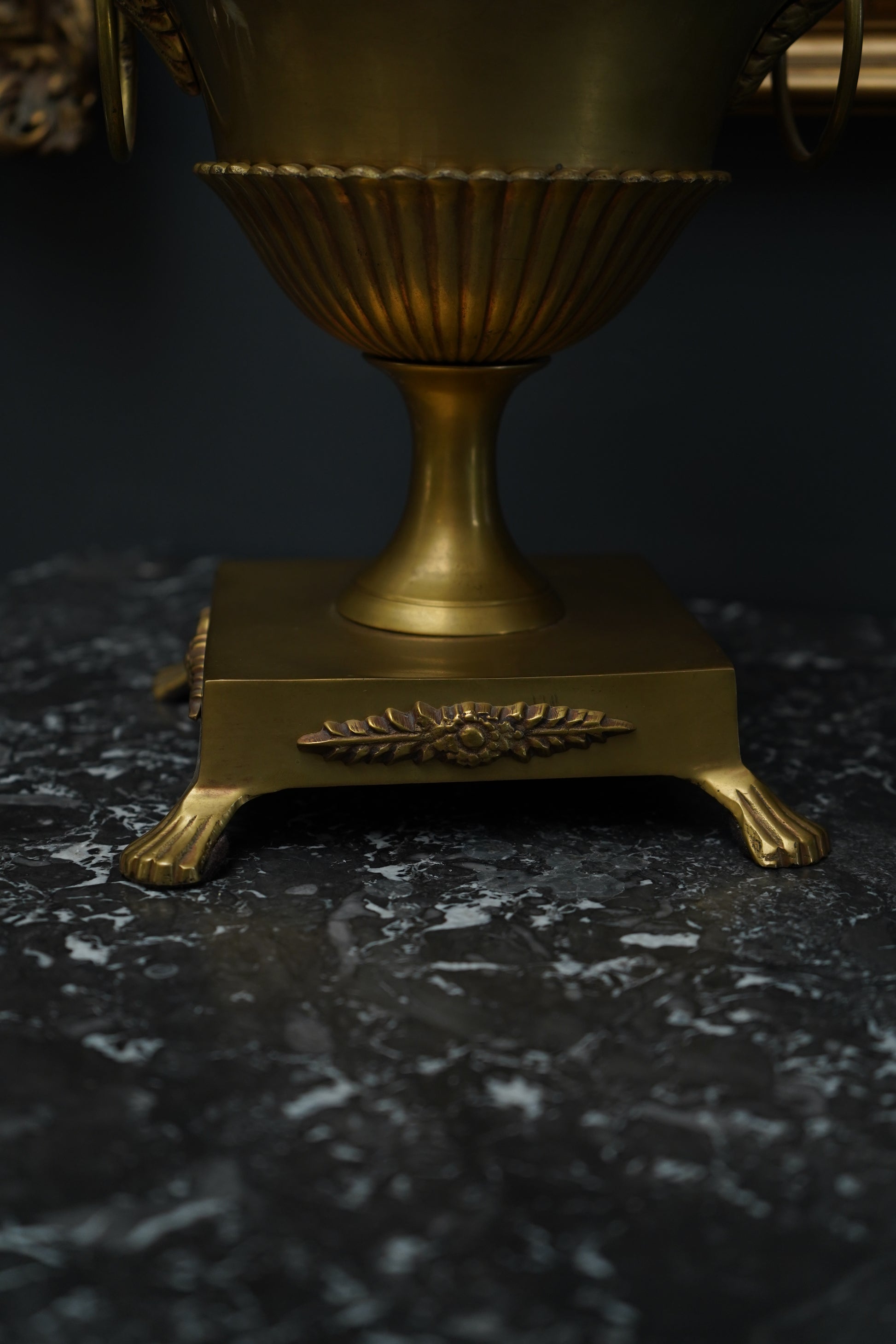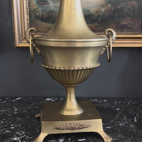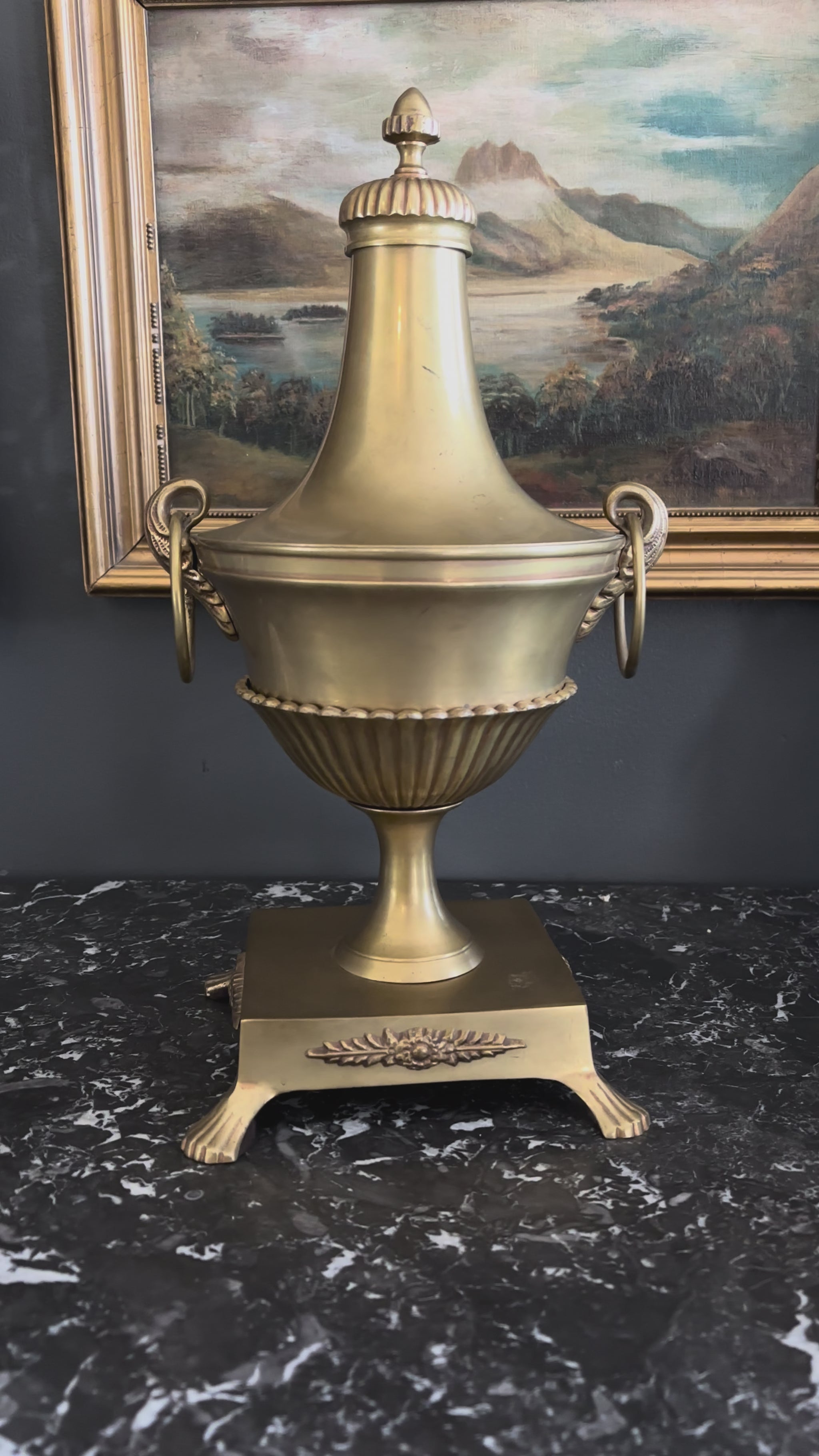 This urn is in good antique condition with age-appropriate wear. The brass has developed a natural patina, showing light surface marks consistent with age and use. The piece is structurally sound and displays beautifully. The base shows expected wear, and felt pads have been added under the feet to protect surfaces.