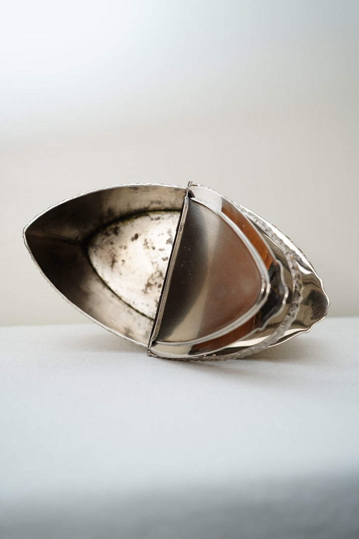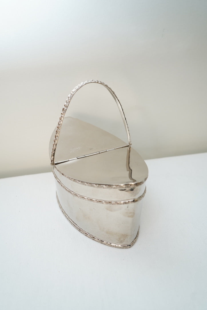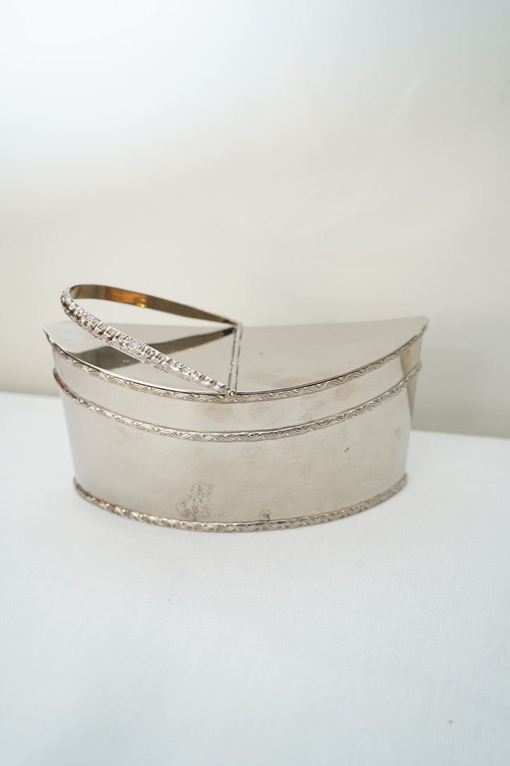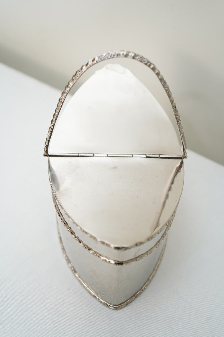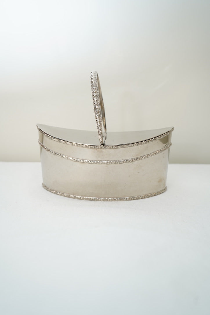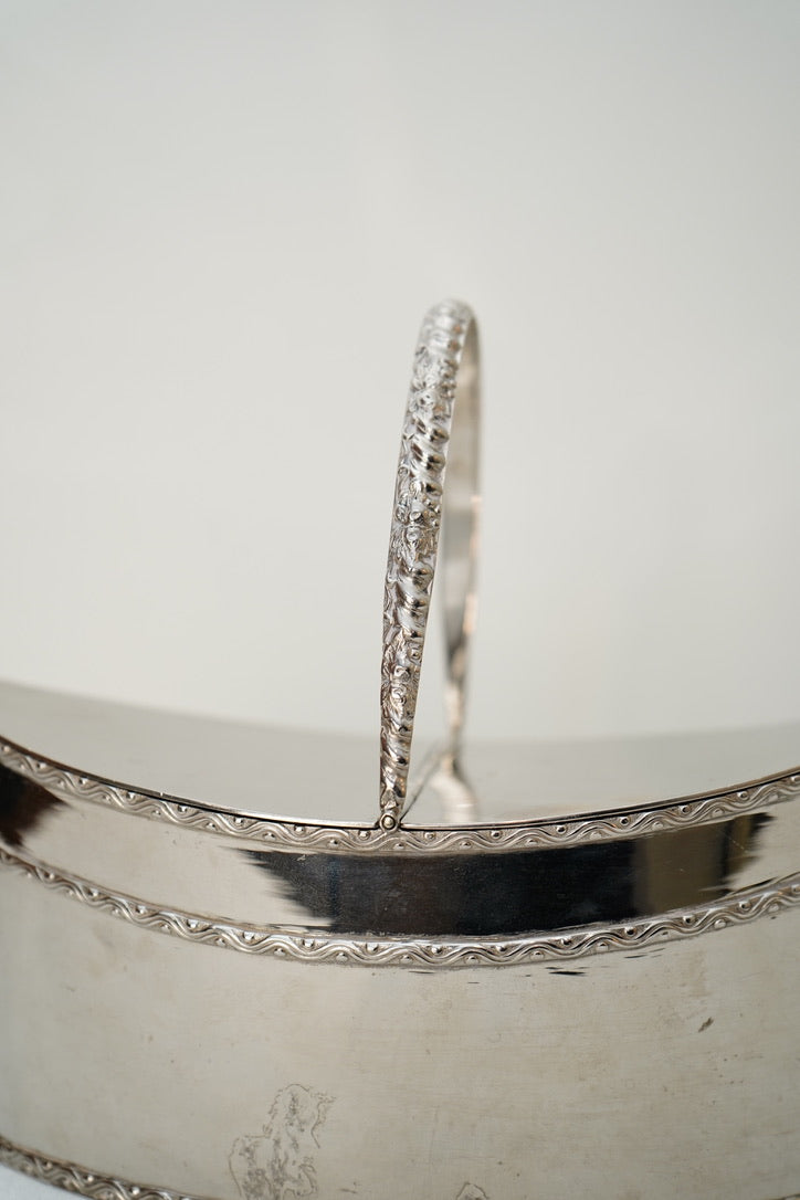 A beautifully classic silver-plated handled caddy with two lidded compartments, designed for the tea table and made to be carried and served with ease. The divided interior and hinged half-lids reflect the practical elegance of late 19th to early 20th century entertaining, when sweets and biscuits were presented with intention and kept covered between servings. Finished with delicate border detailing and an ornate arched handle, this is a timeless serving piece that also works beautifully in modern spaces as a tea station caddy, bar cart accessory, or vanity organizer.