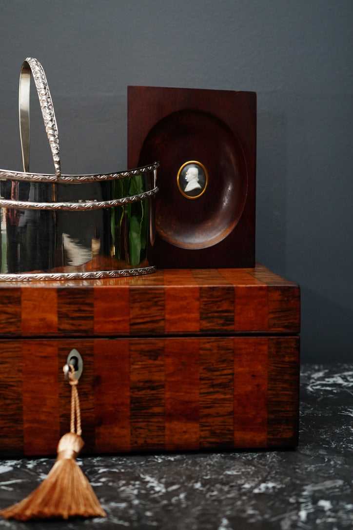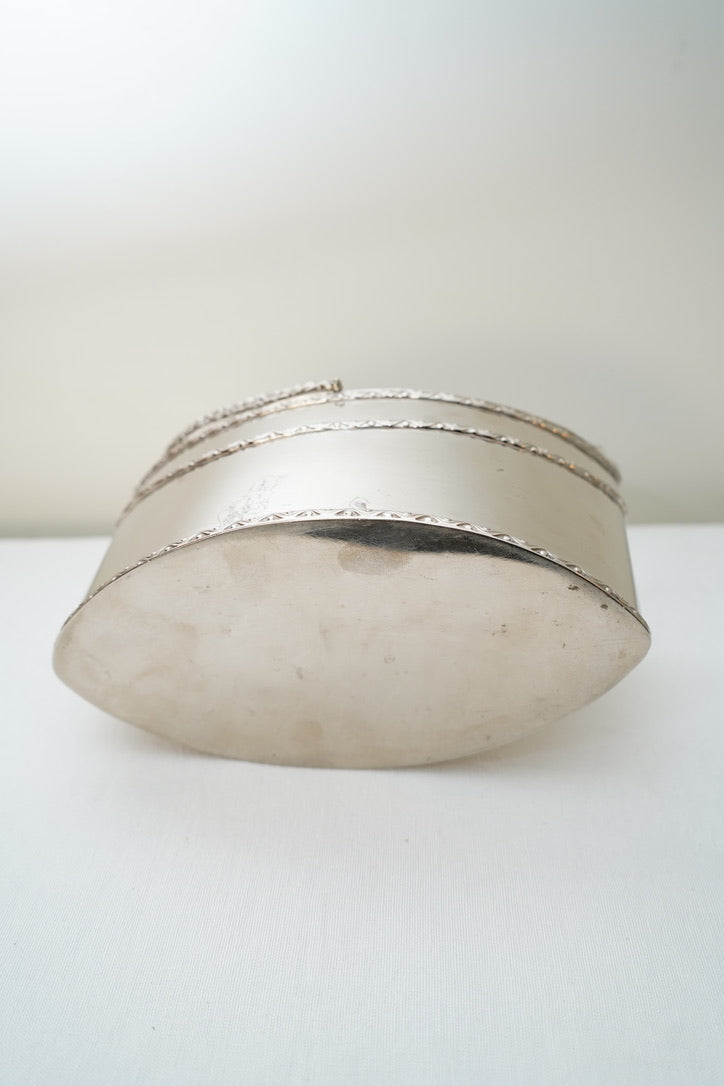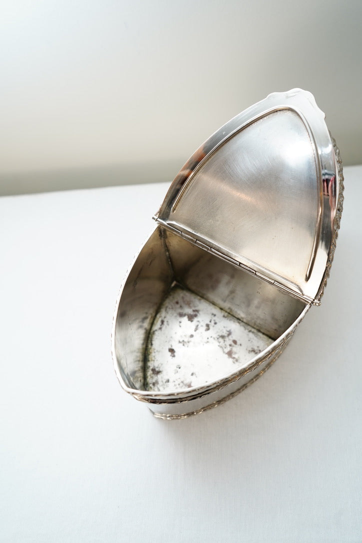 Vintage wear consistent with age and use, including surface scratches, light tarnish, and scattered spotting. Interior shows visible plating wear, most noticeable along the base from prior use. Hinges and lids appear intact; please review photos for detail and finish variation.