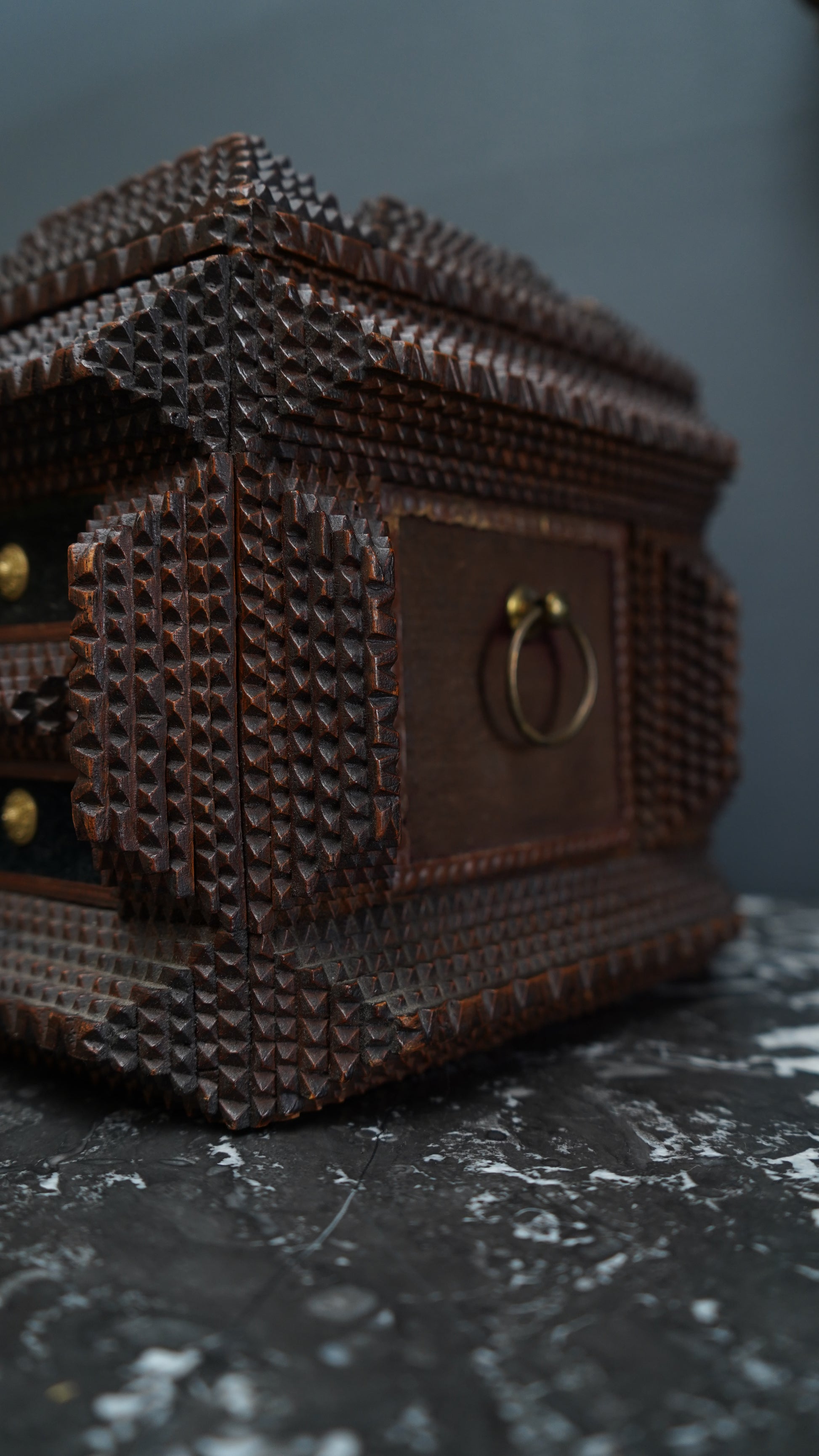 A beautifully hand-carved late 19th century Tramp Art sewing box featuring intricate chip-carved detailing and original paper lining. Crafted from layered wood, each notched edge was cut and stacked by hand, creating the distinctive textured pattern that defines Tramp Art. The hinged lid opens to reveal a mirror and a padded pincushion top, while four small drawers with brass pulls provide charming storage for jewelry, sewing notions, or keepsakes.
