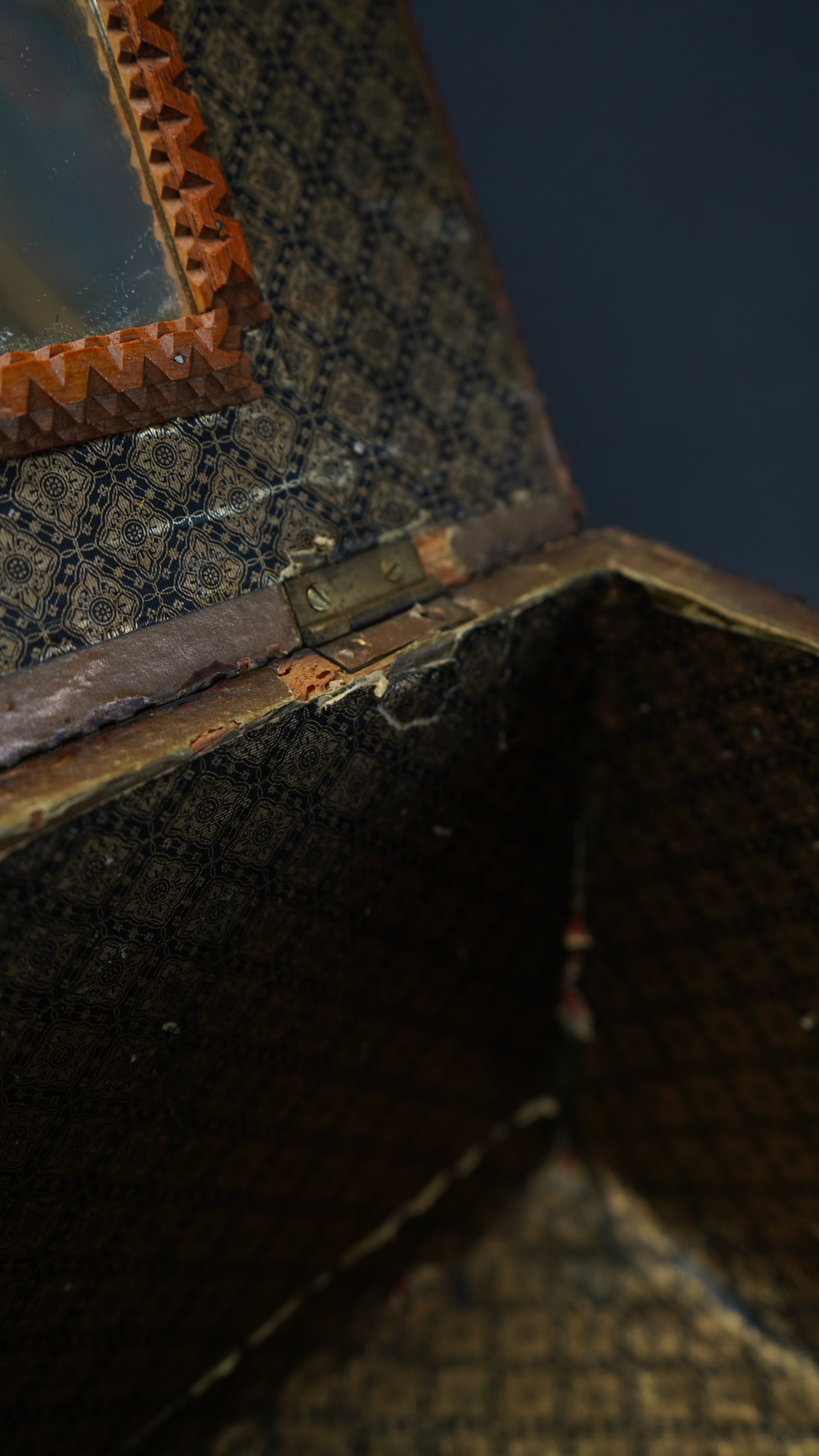 The interior is lined with period-appropriate printed paper, now beautifully aged, showing wear consistent with use over more than a century. The craftsmanship speaks to the ingenuity of folk artisans of the era who transformed simple cigar and fruit crate wood into ornate, architectural forms. The result is a one-of-a-kind piece of Americana that tells a story of resourcefulness and creativity.