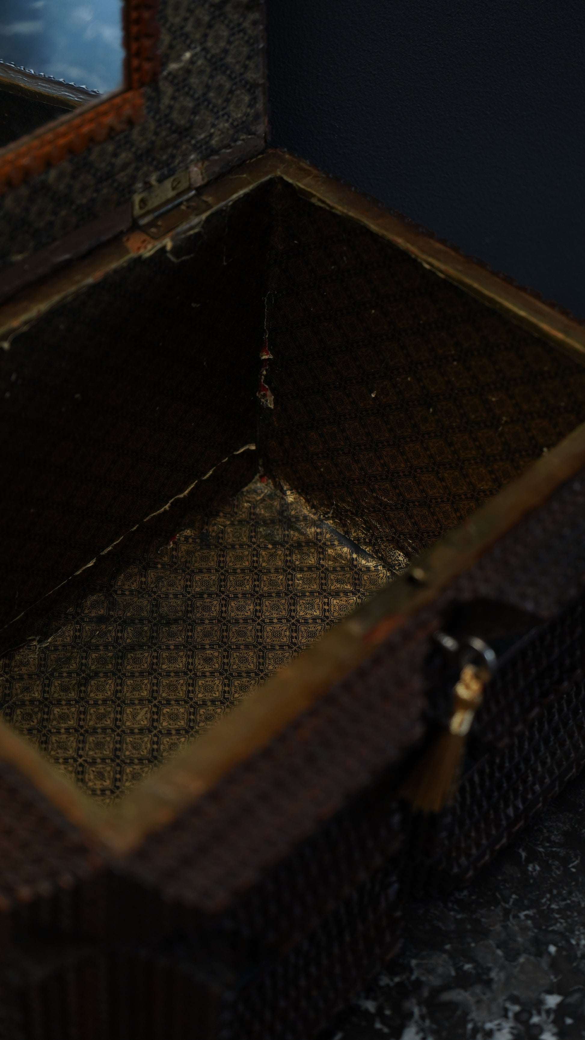 Shows age-appropriate wear including surface scuffs, minor chipping, and paper loss to the base lining. Missing key and portions of the original fabric lining. The mirror and interior paper appear original, showing expected discoloration and wear consistent with use. Structurally solid and displays beautifully. Please review all photos as part of the description.